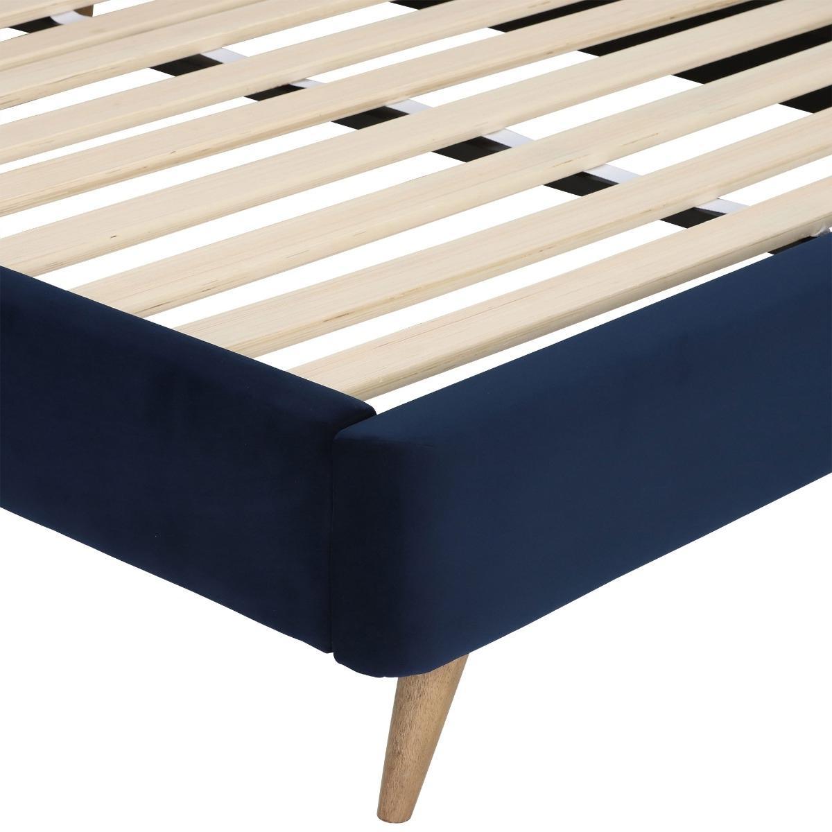I love this bed frame for its modern yet timeless appeal. The plush navy velvet headboard adds a touch of luxury, making it a real statement piece in both contemporary and regenerating interiors. It works particularly well in a minimalist bedroom with neutral tones or a more eclectic space with colourful accents. Practical styling tips include pairing it with crisp white bed linen and layered textures through cushions and throws for a cosy feel. Elevated by its elegant wooden legs, it also lends itself to layering with a soft rug underneath or surrounding furniture for a balanced look. This piece is versatile enough to anchor a variety of schemes, making it a smart choice for a stylish, comfortable bedroom.