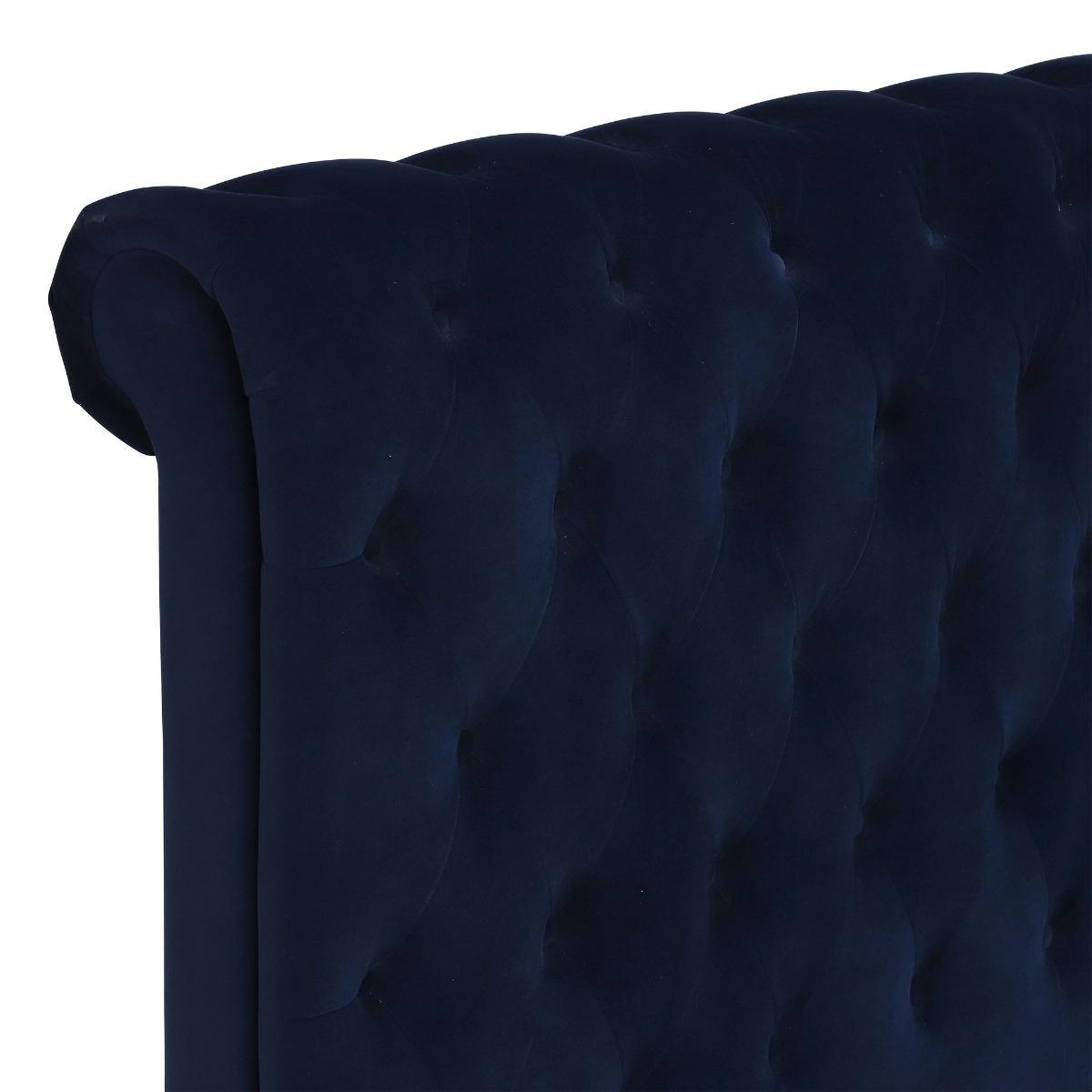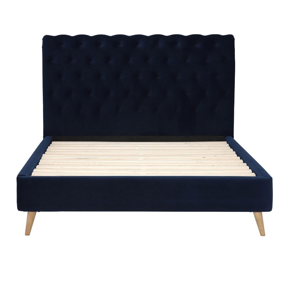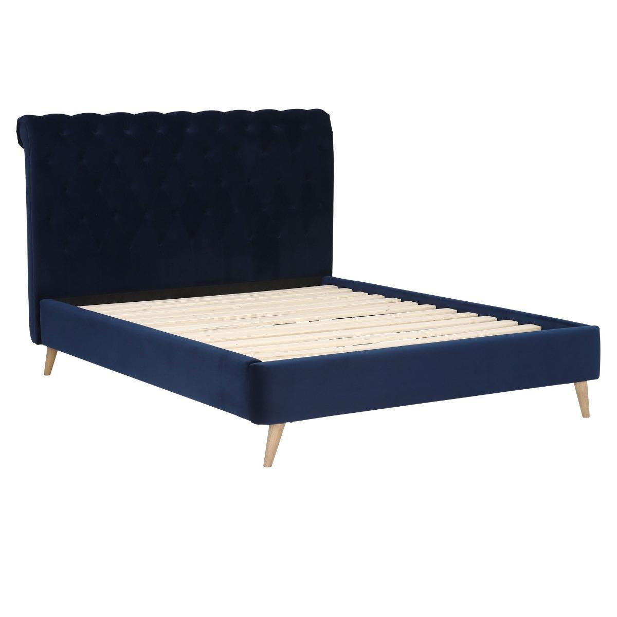 I love this bed frame for its bold yet versatile presence; the navy velvet headboard adds a touch of luxe while remaining approachable. It works well in contemporary spaces with clean lines or in eclectic interiors when styled with layered textures and colourful accessories. For practical styling, consider pairing it with neutral or patterned bedding to make the frame stand out, and add soft furnishings like throw pillows or a textured duvet to soften the look. Its tall headboard makes it ideal for creating a cosy, inviting vibe, and the natural wood legs bring a subtle touch of warmth that complements a range of colour palettes and furniture styles.