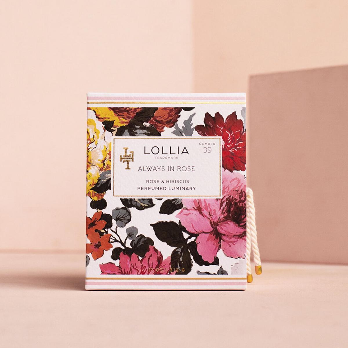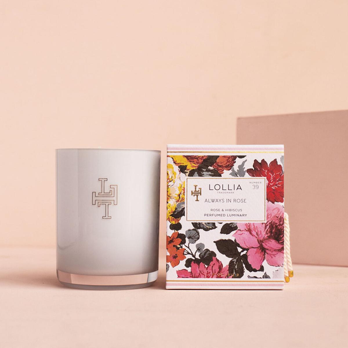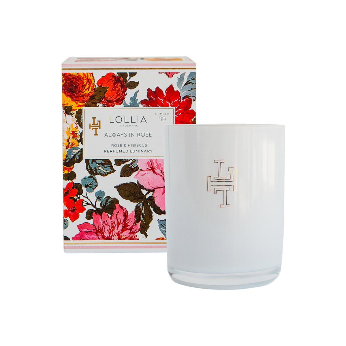 Bask in the warm glow of candlelight with this Always in Rose scented candle from Lollia. Encased with a white glass vessel with a luxe gold interior, it emits a soft golden glow whilst filling your home with the luxurious fragrance of rose, hibiscus, and warm amber. Key features: * Fragrance notes: rose, hibiscus, and amber * Material: glass, soy and coconut wax * Dimensions: Ø9xH11cm * Weight: 312g * Burn time: 70 hours * Encased within a white glass vessel * With a luxe gold interior * Made in the USA * Presented in a beautiful gift box