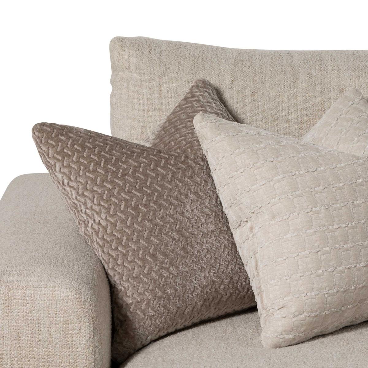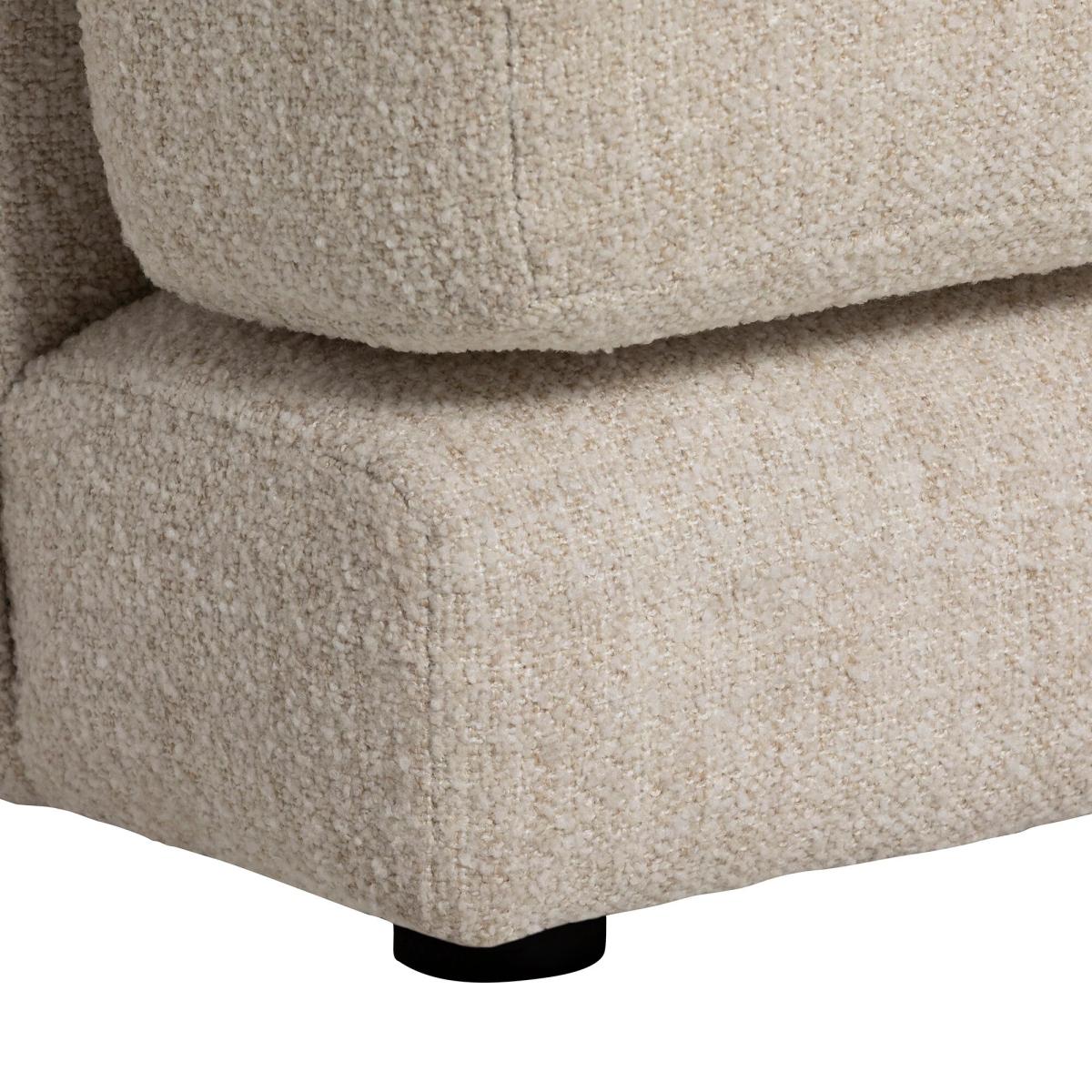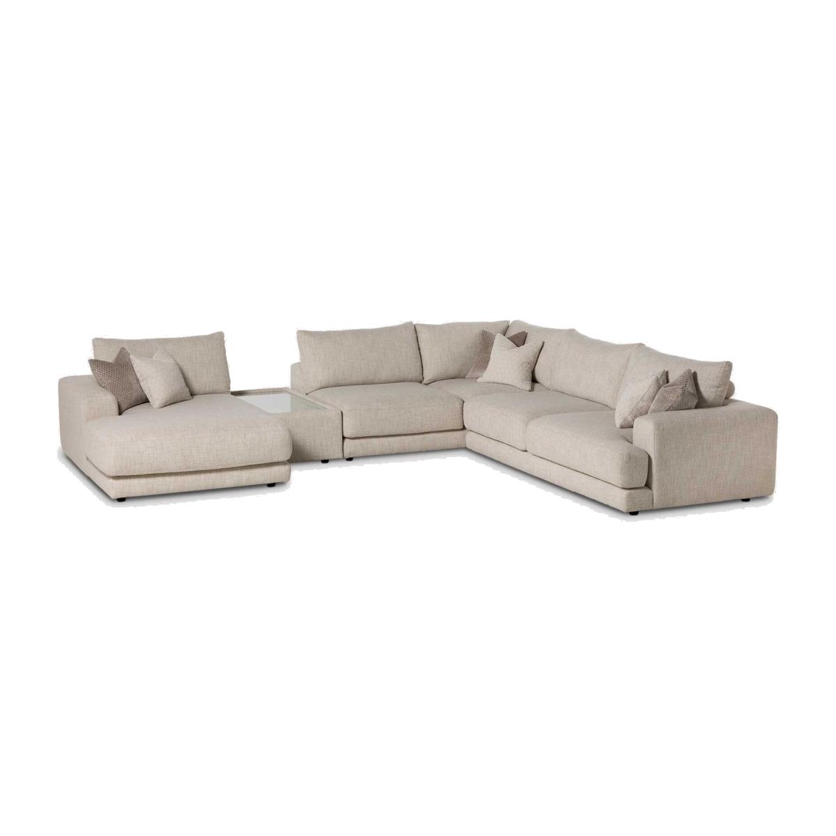 This contemporary corner sofa features a right-hand facing large corner, a rectangular table with a glass insert, and a left-hand facing one-arm chaise. Upholstered in a natural fabric, it offers a clean, modern aesthetic with plush cushions for comfort. Designed with unseen glides for a seamless look, it combines style and practicality, making it a versatile centerpiece for any living space.