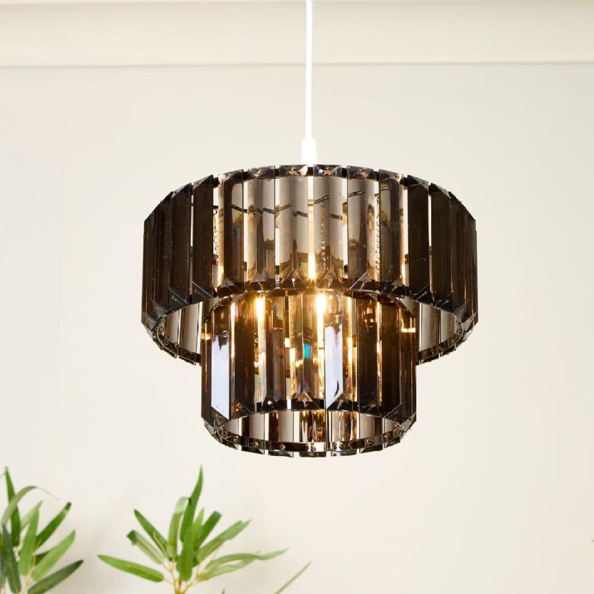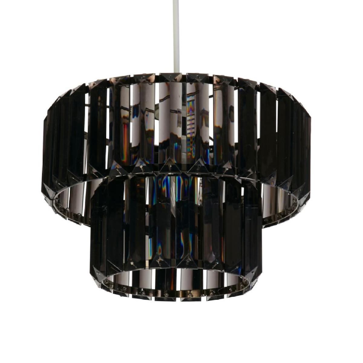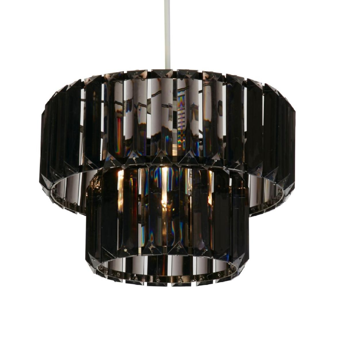 Lombard 1-light non-electric ceiling pendant shade, featuring a two-tiered design with bevelled smoked acrylic panels and black chrome metal detailing. A sophisticated blend of modern design and timeless elegance. the bevelled acrylic panels on this two-tiered shade catch and reflect light beautifully, adding depth and brilliance to any room. The black chrome metal detailing complements the smoked acrylic, offering a sleek, polished finish that enhances the pendant's contemporary appeal. Designed for easy installation on your existing light fitting, the Lombard pendant shade brings a touch of luxury and refinement to your space without the need for electrical work. Perfect for living rooms, dining areas or bedrooms, the Lombard pendant shade combines the classic beauty of bevelled panels with modern black chrome accents, creating a sophisticated focal point that elevates your interior decor. Lombard 1-light non-electric ceiling pendant shade, featuring a two-tiered design with bevelled smoked acrylic panels and black chrome metal detailing. A sophisticated blend of modern design and timeless elegance. the bevelled acrylic panels on this two-tiered shade catch and reflect light beautifully, adding depth and brilliance to any room. The black chrome metal detailing complements the smoked acrylic, offering a sleek, polished finish that enhances the pendant's contemporary appeal. Designed for easy installation on your existing light fitting, the Lombard pendant shade brings a touch of luxury and refinement to your space without the need for electrical work. Perfect for living rooms, dining areas or bedrooms, the Lombard pendant shade combines the classic beauty of bevelled panels with modern black chrome accents, creating a sophisticated focal point that elevates your interior decor.