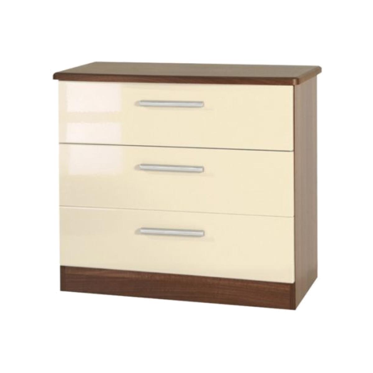 The London Bedroom furniture collection is truly a versatile collection, in a variety of finishes you will be able to customise this 3 Drawer Chest however you want with a choice of 9 high gloss finishes (Ebony Gloss, Black Gloss, Ruby Gloss, Cream Gloss, Pink Gloss, Mushroom Gloss, Aubergine Gloss, White Gloss and Grey Gloss) and 7 base unit finishes (Noche Walnut, Oak, White, Black, Cream, Bardolino and Toronto Walnut) you will be able to truly customise your chest to suit both you and your home.  The Stunning London Range combines the modern with the contemporary to bring us some truly beautiful pieces. Designed with today's lifestyle in mind the London Bedroom Furniture Collection making the 3 Drawer Chest an elegant, practical and sophisticated chest. All Pieces will arrive ready assembled. 12 Month Guarantee. Dimensions: 69.5cm x 76.5cm x 41.5cm