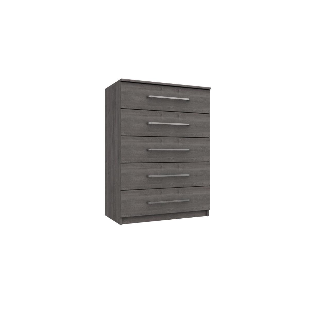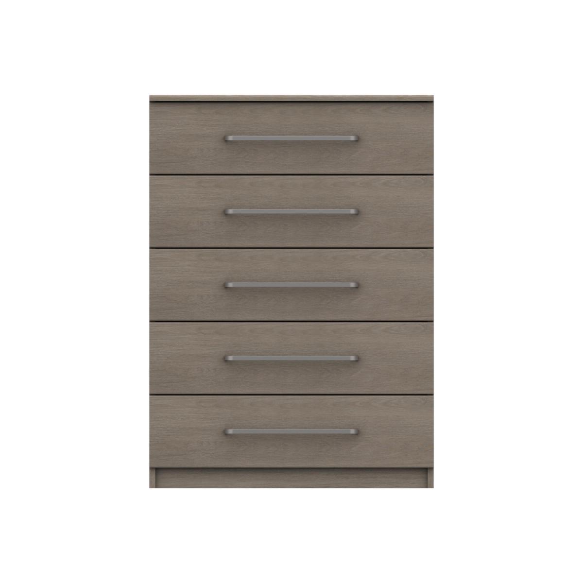 This tall and spacious 5-drawer chest of drawers makes clothes’ organisation so easy and so stylish, thanks to its elegant oak-effect finish and metal handles. You’ll also love that it arrives assembled. Why you'll love it. Elegant oak-effect 5-drawer chest offers spacious storage. Timeless style suits both classic and contemporary homes. Natural textured woodgrain-effect look. Chest top and drawers have soft rounded profiles. Smart elongated metal handles with rounded edges. Drawers have extra-strong bases. Available in two colour finishes – a dark grey oak and a lighter beige grey oak. Fully assembled. Beautifully crafted in London. A Furniture Village online exclusive. What you need to know. 5 equally sized drawers. Complete the look with a wardrobe from the London Bedrooms Blackfriars range. Warning!. Furniture can tip over unexpectedly and cause injury. This item should be fixed to a wall using the anti-tip kit provided with the furniture. Be sure to use the correct wall fixings suitable for the walls in your home.