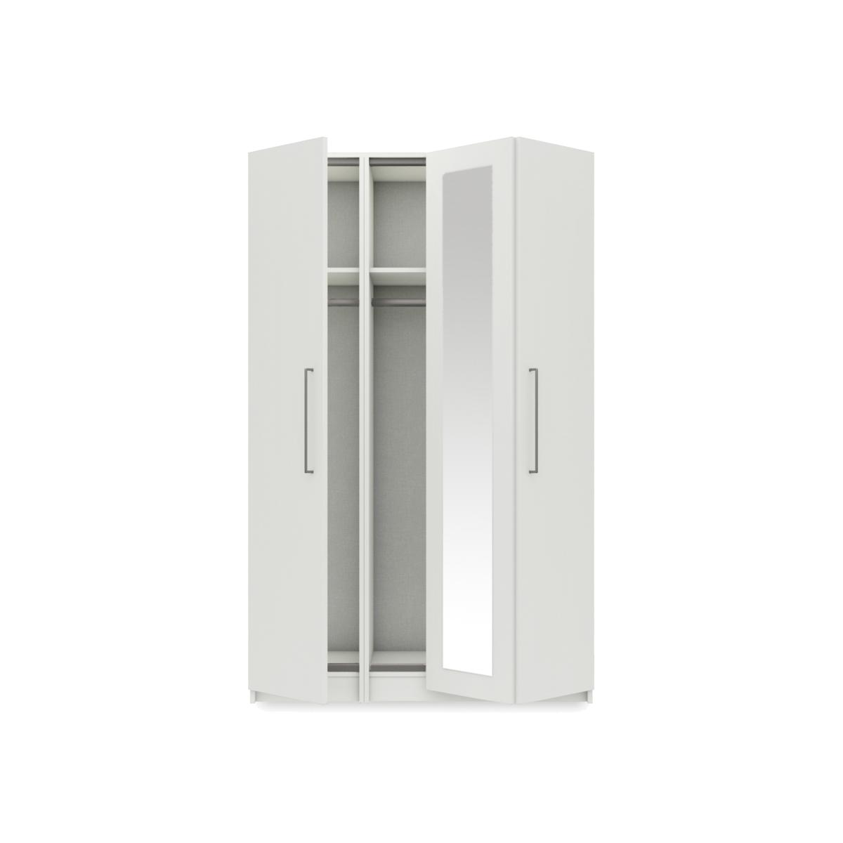 Designed to suit the smaller bedroom, this spacious bifold wardrobe has ergonomic folding doors and a sleek and glossy finish. Made in London by London Bedrooms. Why you'll love it Sleek wardrobe style for fashionable modern homes. This freestanding hinged wardrobe is fabulous inside and out. High-gloss finish in a choice of colours. Centre door has a full-length mirror. Premium bifold door mechanism for a smooth closing action. Adjustable foot feature fine-tunes the height of each corner to compensate for uneven floors. Roomy storage with shelves and a hanging rail. Made in the UK from UK-sourced materials. This 3-door bifold wardrobe is part of the London Bedrooms Castle range. What you need to know 1 shelf and 1 hanging rail in the double section. 1 fixed and 2 removeable shelves in the single section. Before ordering, please carefully measure doorways as well as your bedroom to ensure accessibility for our delivery team. Assembled and installed in your room of choice on delivery. Cost is included in the delivery charge. This wardrobe’s finish is not heat resistant or heat proof. Dust with a lint-free cloth. Do not use silicone-based furniture polishes or abrasive cleaning products. WARNING!
