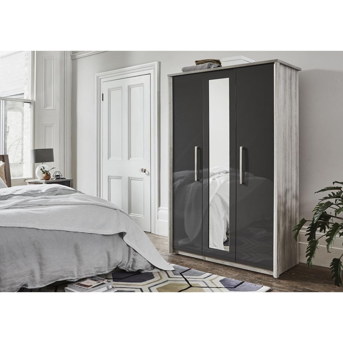Take home premium contemporary style at a very attractive price with the London Bedrooms Euston range. Its high-end, modern design is beautifully realised with clean lines and sleek brushed metal handles. A stylish wood grain finish contrasts to stunning effect with a choice of glossy graphite or off-white drawers and doors – both looks complement contemporary bedrooms beautifully. Storage is a breeze thanks to the extensive collection of spacious wardrobes, chests of drawers and beside cabinets. There’s even a versatile dressing table which can also be used as a desk. Exclusively available at Furniture Village. Beautiful, high-end and great-value design. Stylish wood grain effect finish with contrasting doors. Exclusive to Furniture Village. The London Bedrooms Euston 3 Door Tall Wardrobe with Mirrors delivers premium looks and functional storage at a great-value price. From its clean-lined angles to its sleek brushed metal handles, everything about this well-made wardrobe is contemporary. The doors are soft close, with one mirrored door which makes getting ready in the morning’s a breeze. There’s also plenty of storage space to organise your clothes, with a single rail, two fixed shelves and two adjustable shelves to fill. The beautiful wood grain effect painted finish on the sides is contrasted with either graphite black or glossy off white doors to striking effect. At 37cm taller than the standard model, it’s also a great choice for those with high ceilings. Exclusively available at Furniture Village, the London Bedrooms Euston 3 Door Tall Wardrobe with Mirrors is part of the London Bedrooms Euston range. This product comes flat packed and will be assembled and installed for you by our delivery team. WARNING!. Furniture can tip over unexpectedly and cause injury. This item shall be fixed to a wall using the anti-tip kit provided with the furniture. Be sure to use the correct wall fixings suitable for the walls in your home.