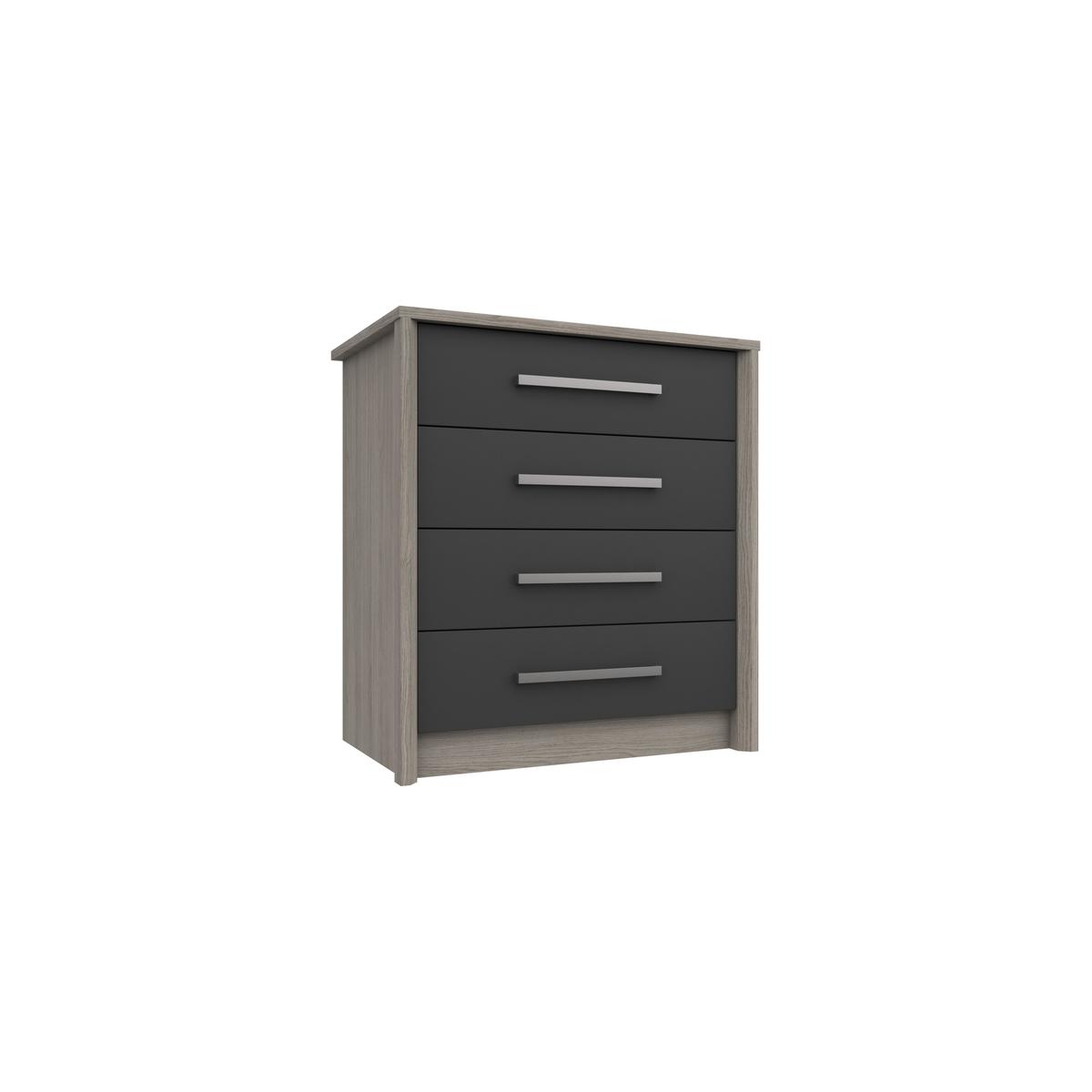 Take home premium contemporary style at a very attractive price with the London Bedrooms Euston range. Its high-end, modern design is beautifully realised with clean lines and sleek brushed metal handles. A stylish wood grain finish contrasts to stunning effect with a choice of glossy graphite or off-white drawers and doors – both looks complement contemporary bedrooms beautifully. Storage is a breeze thanks to the extensive collection of spacious wardrobes, chests of drawers and beside cabinets. There’s even a versatile dressing table which can also be used as a desk. Exclusively available at Furniture Village. Beautiful, high-end and great-value design. Stylish wood grain effect finish with contrasting glossy drawers. Exclusive to Furniture Village. The London Bedrooms Euston 4 Drawer Chest delivers impressive storage and premium contemporary style at an incredible price. Its beautiful wood grain effect finish on the top, sides and back is contrasted to stunning effect with the drawer fronts, available in glossy off white or graphite black. And with its sleek brushed metal handles and clean lines, it looks modern and sophisticated in any space. The storage is effortlessly functional and easy to use with spacious drawers designed to store clothes, accessories and more. Each drawer is well-built, with a sturdy base, easy glide metal runners and a soft close mechanism which makes putting away clothes easier. Exclusively available at Furniture Village, the London Bedrooms Euston 4 Drawer Chest is part of the London Bedrooms Euston range. Discover a contemporary collection of well-made and great-value bedroom furniture. WARNING!. Furniture can tip over unexpectedly and cause injury. This item shall be fixed to a wall using the anti-tip kit provided with the furniture. Be sure to use the correct wall fixings suitable for the walls in your home.