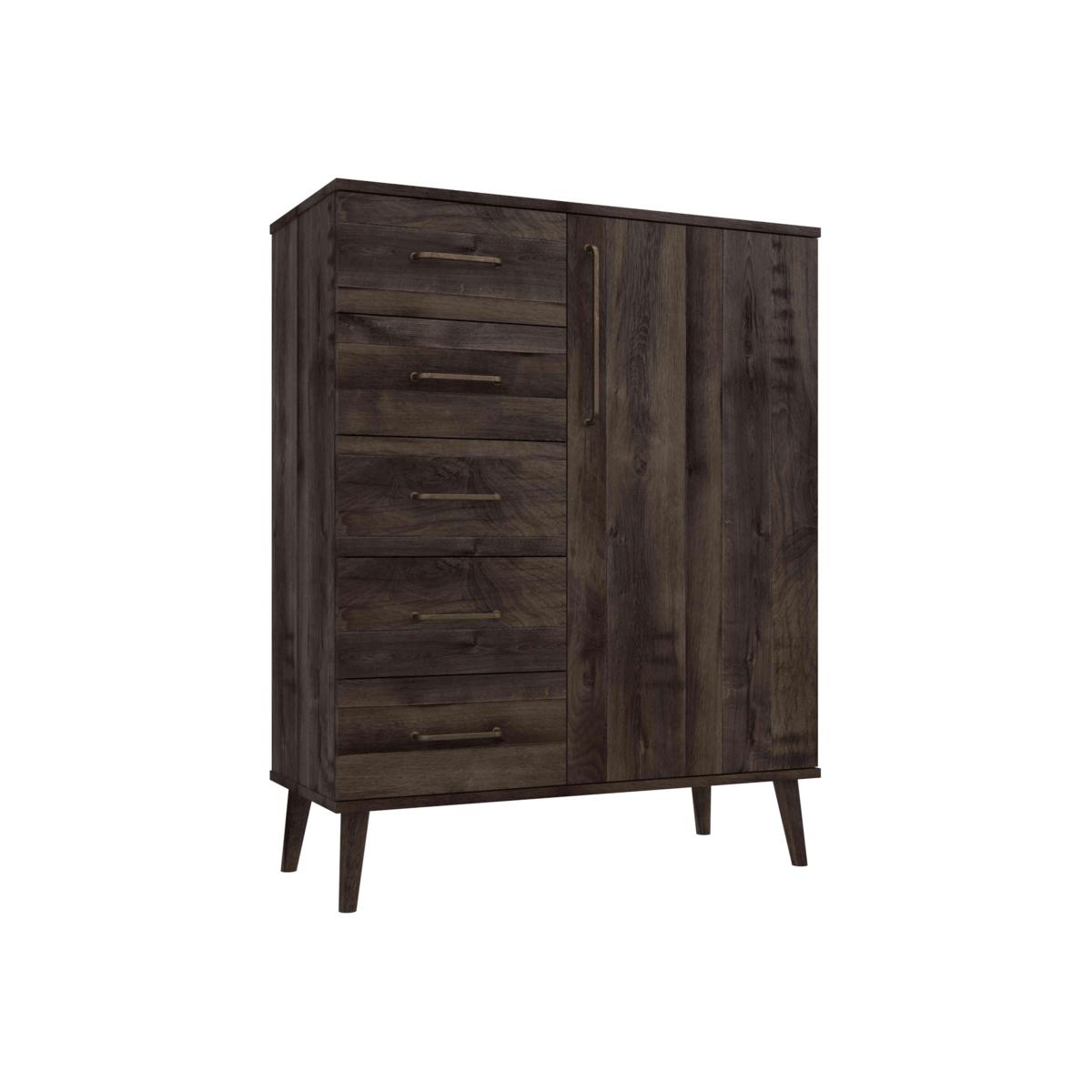 The London Bedrooms Finchley range makes it easy to create a stylish and coordinated bedroom. The look is so warm and welcoming – a contemporary, tactile woodgrain-effect finish that’s available in a choice of oak tones. And the details are equally well-considered. Pieces are extremely well-crafted with sturdy drawer bases, and showcase elegant angled legs, soft-closing doors and drawers, and simple metal handles. And with wardrobes and chests of drawers in all sizes from compact to large, this extensive furniture collection has something for every bedroom. The London Bedrooms Finchley range is made in London. With five roomy drawers and a surprisingly spacious compartment for hanging clothes, this chest of drawers and wardrobe combo is versatile and practical as well as being very stylish. Why you'll love it Multifunctional 5-drawer chest with wardrobe is perfect for a smaller bedroom. Contemporary bedroom style with a warm, natural wood look. Beautiful woodgrain effect has a tactile textured finish. Soft-closing door and drawers. Well-crafted with sturdy drawer bases and simple metal handles. In a choice of natural oak and dark oak. Made in London. This 5-drawer chest with wardrobe is part of the London Bedrooms Finchley range. What you need to know Wardrobe compartment has 1 hanging rail. This finish may show surface scratches under certain lighting. Do not place in direct sunlight. Do not use abrasive cleaning products. Wipe clean with a damp cloth, and dry with a soft duster. We recommend using coasters and placemats at all times. Please note: This product comes fully assembled. Please ensure there is sufficient access for our delivery team. WARNING! Furniture can tip over unexpectedly and cause injury. This item must be fixed to a wall using the anti-tip kit provided. Be sure to use the correct wall fixings suitable for the walls in your home. Furniture Village is not able to fix anti-tip devices for you. Seek professional advice if you are unsure.