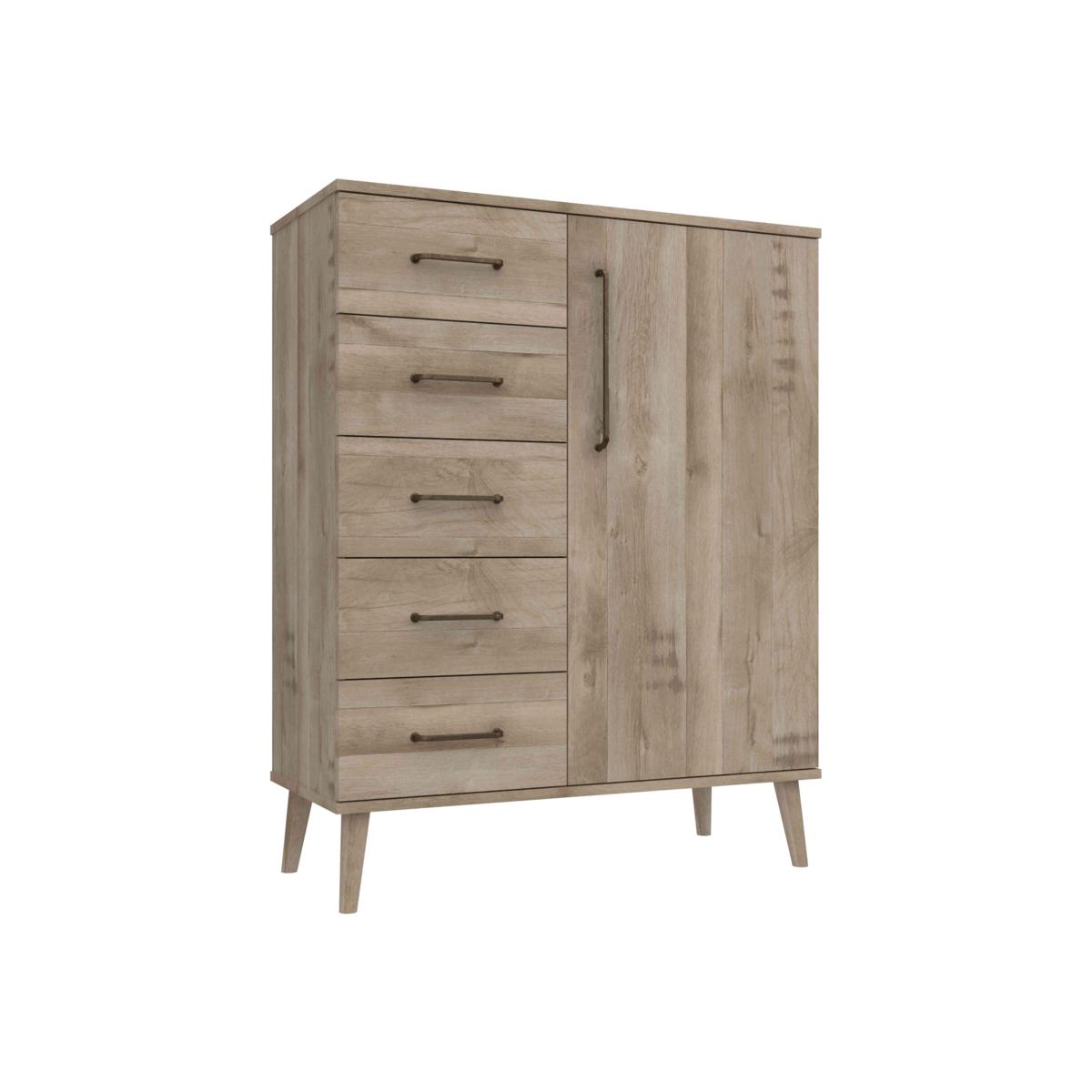 The London Bedrooms Finchley range makes it easy to create a stylish and coordinated bedroom. The look is so warm and welcoming – a contemporary, tactile woodgrain-effect finish that’s available in a choice of oak tones. And the details are equally well-considered. Pieces are extremely well-crafted with sturdy drawer bases, and showcase elegant angled legs, soft-closing doors and drawers, and simple metal handles. And with wardrobes and chests of drawers in all sizes from compact to large, this extensive furniture collection has something for every bedroom. The London Bedrooms Finchley range is made in London. With five roomy drawers and a surprisingly spacious compartment for hanging clothes, this chest of drawers and wardrobe combo is versatile and practical as well as being very stylish. Why you'll love it Multifunctional 5-drawer chest with wardrobe is perfect for a smaller bedroom. Contemporary bedroom style with a warm, natural wood look. Beautiful woodgrain effect has a tactile textured finish. Soft-closing door and drawers. Well-crafted with sturdy drawer bases and simple metal handles. In a choice of natural oak and dark oak. Made in London. This 5-drawer chest with wardrobe is part of the London Bedrooms Finchley range. What you need to know Wardrobe compartment has 1 hanging rail. This finish may show surface scratches under certain lighting. Do not place in direct sunlight. Do not use abrasive cleaning products. Wipe clean with a damp cloth, and dry with a soft duster. We recommend using coasters and placemats at all times. Please note: This product comes fully assembled. Please ensure there is sufficient access for our delivery team. WARNING! Furniture can tip over unexpectedly and cause injury. This item must be fixed to a wall using the anti-tip kit provided. Be sure to use the correct wall fixings suitable for the walls in your home. Furniture Village is not able to fix anti-tip devices for you. Seek professional advice if you are unsure.