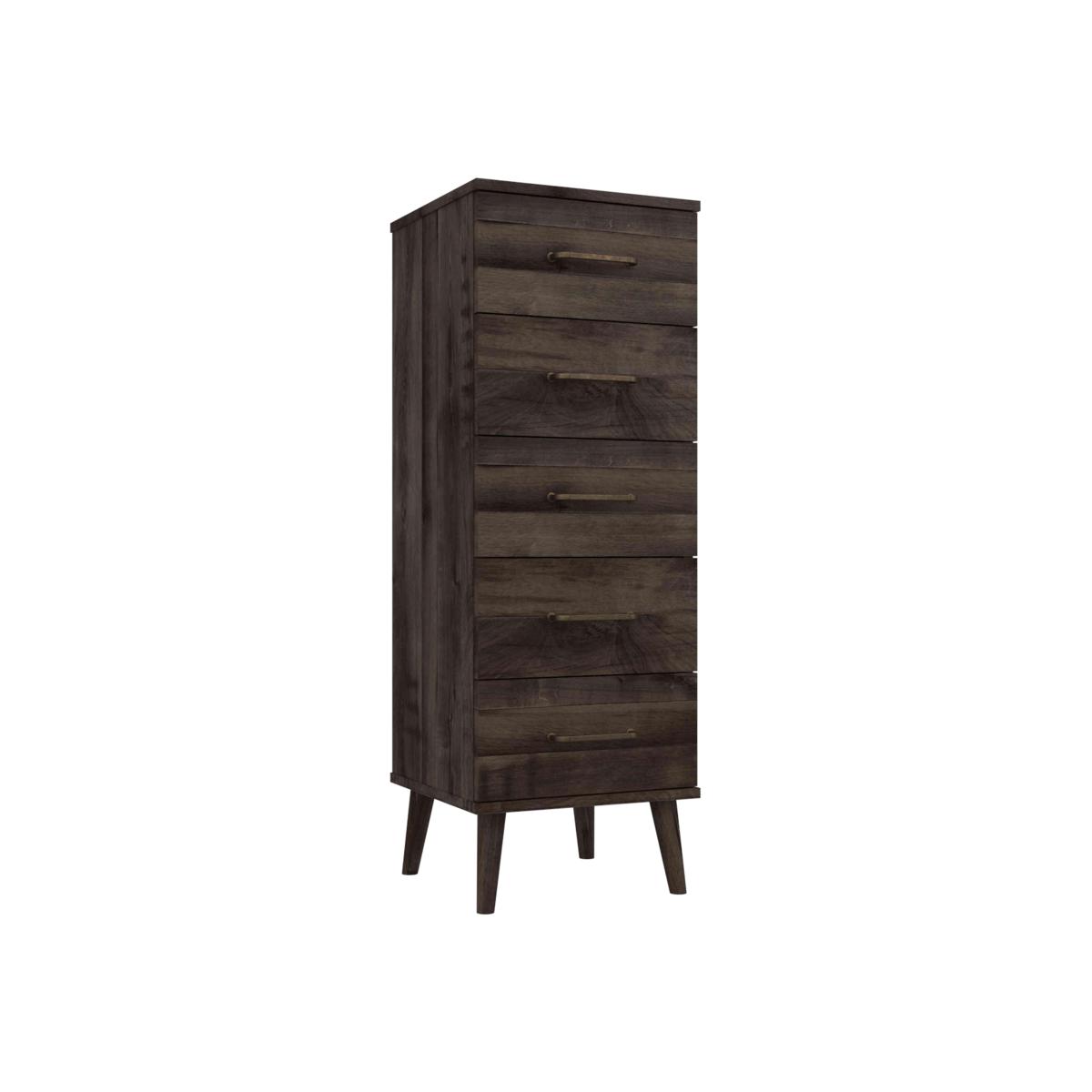 The London Bedrooms Finchley range makes it easy to create a stylish and coordinated bedroom. The look is so warm and welcoming – a contemporary, tactile woodgrain-effect finish that’s available in a choice of oak tones. And the details are equally well-considered. Pieces are extremely well-crafted with sturdy drawer bases, and showcase elegant angled legs, soft-closing doors and drawers, and simple metal handles. And with wardrobes and chests of drawers in all sizes from compact to large, this extensive furniture collection has something for every bedroom. The London Bedrooms Finchley range is made in London. Tall and narrow, this five-drawer tallboy is the perfect bedroom storage solution for a more compact space. In a choice of beautiful finishes. Why you'll love it Tall and narrow 5-drawer tallboy chest saves space and looks fabulous. Contemporary bedroom style with a warm, natural wood look. Beautiful woodgrain effect has a tactile textured finish. Soft-closing drawers. Well-crafted with sturdy drawer bases and simple metal handles. In a choice of natural oak and dark oak. Made in London. This 5-drawer tallboy is part of the London Bedrooms Finchley range. What you need to know This finish may show surface scratches under certain lighting. Do not place in direct sunlight. Do not use abrasive cleaning products. Wipe clean with a damp cloth, and dry with a soft duster. We recommend using coasters and placemats at all times. Please note: This product comes fully assembled. Please ensure there is sufficient access for our delivery team. WARNING! Furniture can tip over unexpectedly and cause injury. This item must be fixed to a wall using the anti-tip kit provided. Be sure to use the correct wall fixings suitable for the walls in your home. Furniture Village is not able to fix anti-tip devices for you. Seek professional advice if you are unsure.