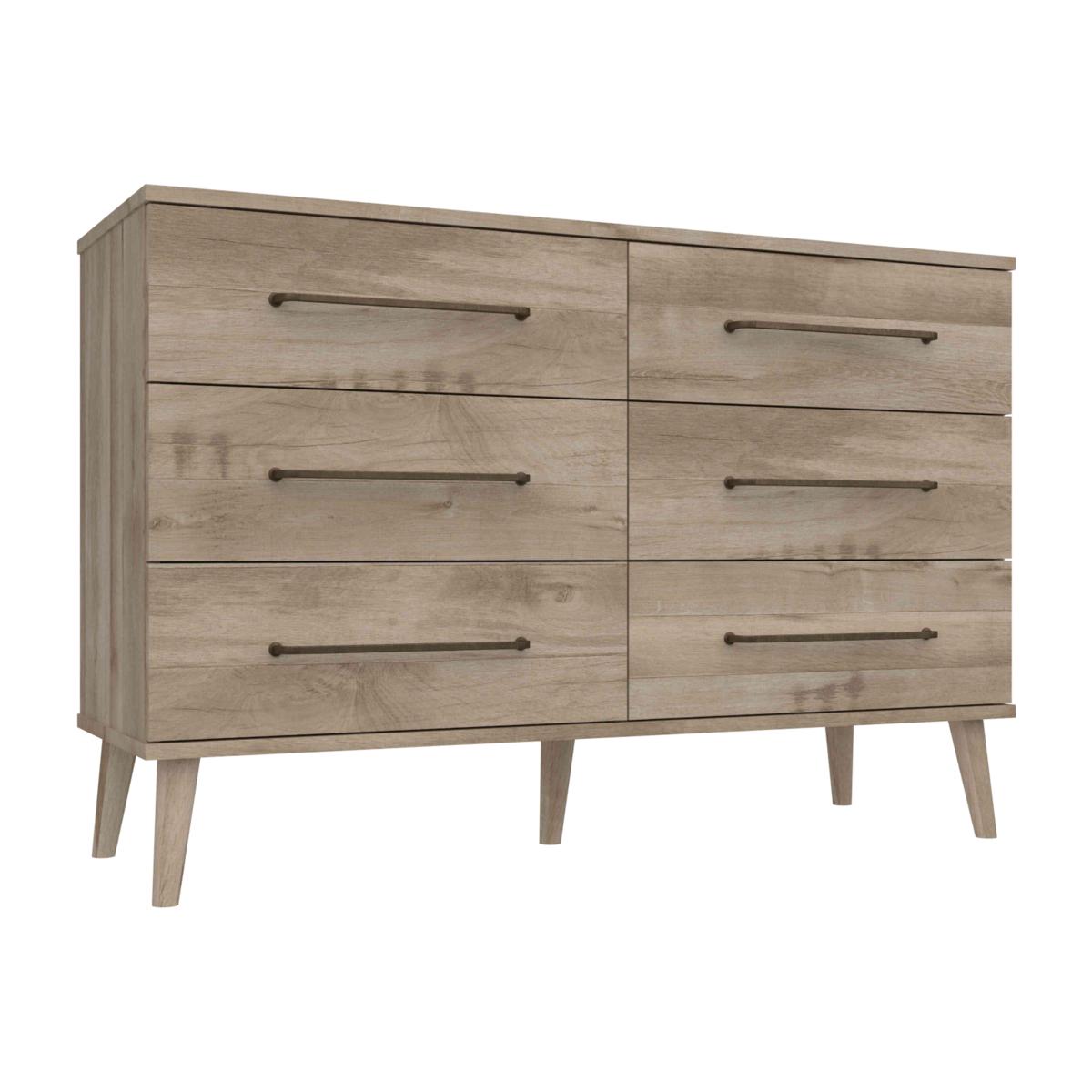 The London Bedrooms Finchley range makes it easy to create a stylish and coordinated bedroom. The look is so warm and welcoming – a contemporary, tactile woodgrain-effect finish that’s available in a choice of oak tones. And the details are equally well-considered. Pieces are extremely well-crafted with sturdy drawer bases, and showcase elegant angled legs, soft-closing doors and drawers, and simple metal handles. And with wardrobes and chests of drawers in all sizes from compact to large, this extensive furniture collection has something for every bedroom. The London Bedrooms Finchley range is made in London. This beautiful chest of drawers gives you six roomy drawers, a spacious surface for a framed photos and overall contemporary style with a lovely natural wood-effect finish. Why you'll love it This stylish and roomy 6-drawer double chest has 2 stacks of 3 drawers. Contemporary bedroom style with a warm, natural wood look. Beautiful woodgrain effect has a tactile textured finish. Soft-closing drawers. Well-crafted with sturdy drawer bases and simple metal handles. In a choice of natural oak and dark oak. Made in London. This 6-drawer double chest is part of the London Bedrooms Finchley range. What you need to know This finish may show surface scratches under certain lighting. Do not place in direct sunlight. Do not use abrasive cleaning products. Wipe clean with a damp cloth, and dry with a soft duster. We recommend using coasters and placemats at all times. Please note: This product comes fully assembled. Please ensure there is sufficient access for our delivery team. WARNING! Furniture can tip over unexpectedly and cause injury. This item must be fixed to a wall using the anti-tip kit provided. Be sure to use the correct wall fixings suitable for the walls in your home. Furniture Village is not able to fix anti-tip devices for you. Seek professional advice if you are unsure.