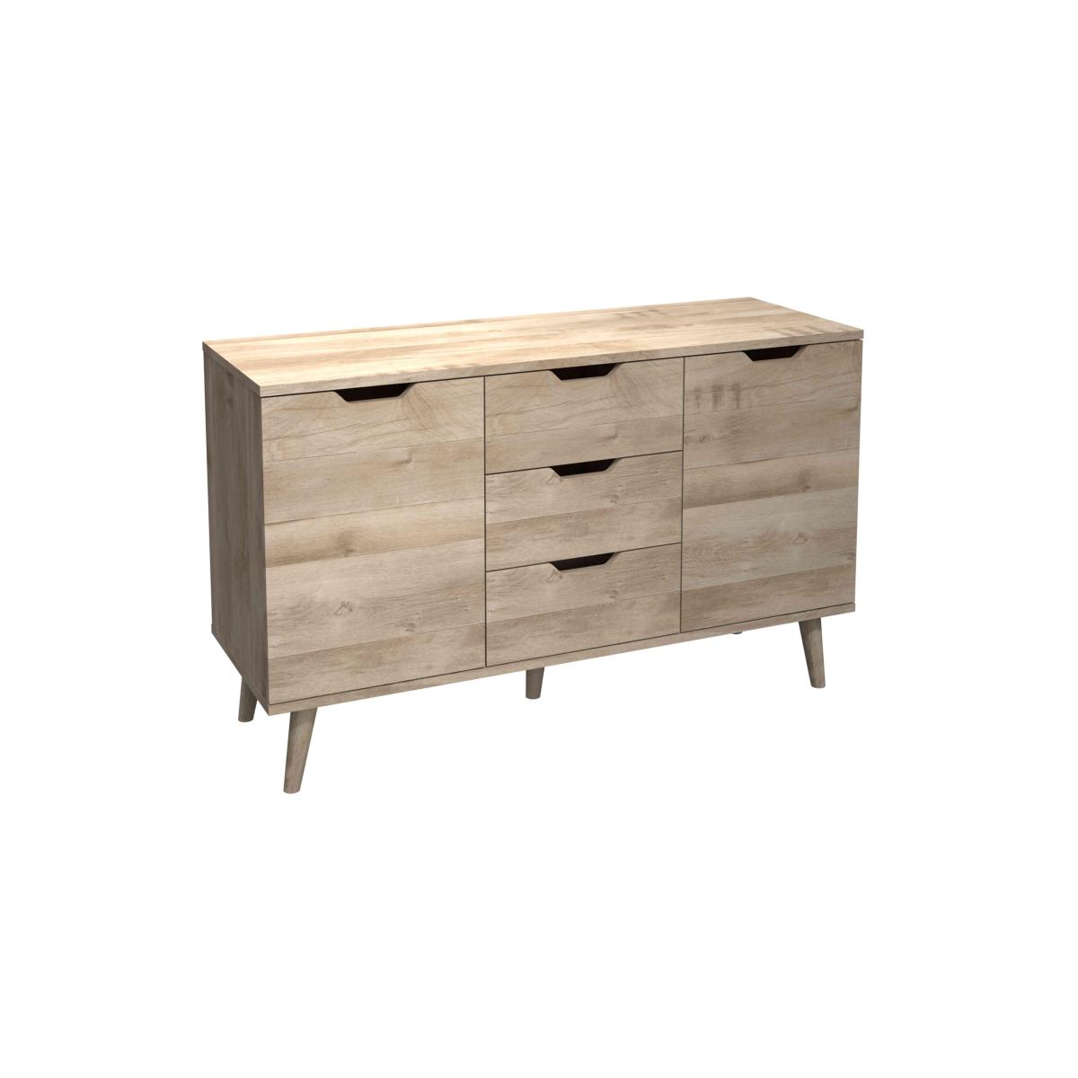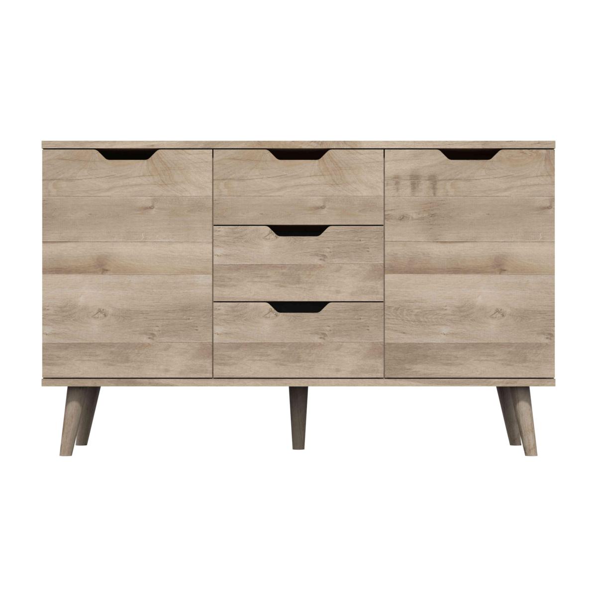 The London Bedrooms Finchley range makes it easy to create a stylish and coordinated bedroom. The look is so warm and welcoming – a contemporary, tactile woodgrain-effect finish that’s available in a choice of oak tones. And the details are equally well-considered. Pieces are extremely well-crafted with sturdy drawer bases, and showcase elegant angled legs, soft-closing doors and drawers, and simple metal handles. And with wardrobes and chests of drawers in all sizes from compact to large, this extensive furniture collection has something for every bedroom. The London Bedrooms Finchley range is made in London. Set on elegant angled legs and with a lovely natural oak-effect finish, this large sideboard brings welcome storage and makes any room more stylish. Why you'll love it This large sideboard is a stylish way to bring home roomy storage. Contemporary living and dining style with a warm, natural wood look. Beautiful woodgrain effect has a tactile textured finish. Soft-closing drawers and cupboard doors with distinctive cut-out handles. Well-crafted with sturdy drawer bases. In a choice of natural oak and dark oak. Made in London. A Furniture Village online exclusive. This large sideboard is part of the Finchley range. What you need to know 3 drawers and 2 cupboards each with 1 fixed shelf. This finish may show surface scratches under certain lighting. Do not place in direct sunlight. Do not use abrasive cleaning products. Wipe clean with a damp cloth, and dry with a soft duster. We recommend using coasters and placemats at all times. Please note: This product comes fully assembled. Please ensure there is sufficient access for our delivery team. WARNING! Furniture can tip over unexpectedly and cause injury. This item must be fixed to a wall using the anti-tip kit provided. Be sure to use the correct wall fixings suitable for the walls in your home. Furniture Village is not able to fix anti-tip devices for you. Seek professional advice if you are unsure.