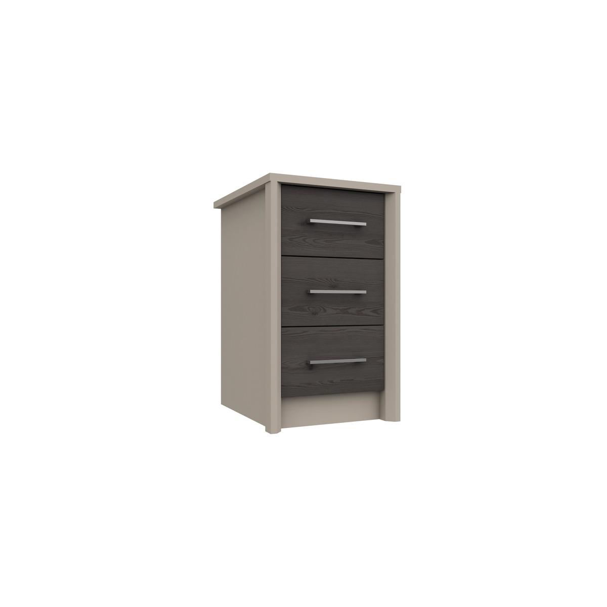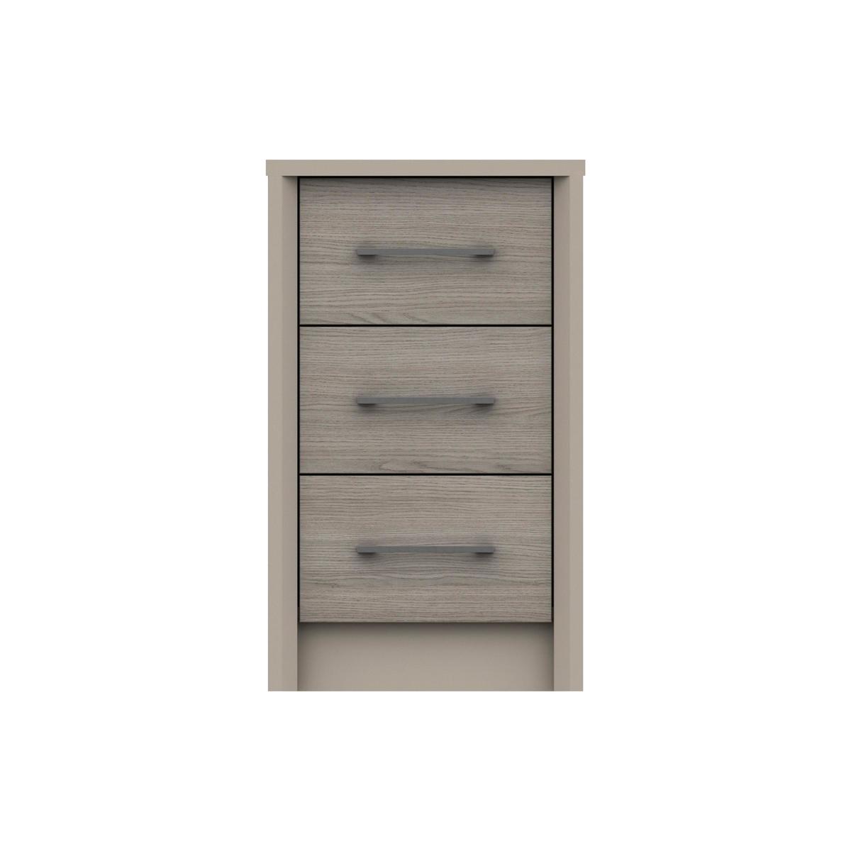 Furnish your bedroom in thoroughly modern style with the London Bedrooms Paddington range. This versatile collection boasts clean-lined angles, slim brushed nickel handles and drawers in a beautiful painted wood-effect finish which comes in a choice of stylish light grey or sophisticated anthracite grey. You’ll find spacious wardrobes, roomy chests of drawers, compact bedside cabinets and even an elegant dressing table. Each piece is well-built with soft close drawers and each wardrobe boasts space-efficient storage solutions inside. Storing away clothes and belongings has never been so easy – or so stylish. This great-value contemporary bedroom storage collection is only available at Furniture Village. Modern and sophisticated style. Beautiful wood grain effect finish. Exclusive to Furniture Village. Find a stylish home for all those night-time essentials with the London Bedrooms Paddington 3 Drawer Bedside Chest. This contemporary design is perfect for the modern bedroom and will beautifully set off your bed – especially with one placed on either side. Its well-made drawers have sturdy bases and easy-glide metal runners with a soft close mechanism for effortless opening and closing. Stow away books, sleep masks and more in the three spacious drawers and place a lamp on the top shelf for the perfect night-time set up. We love its natural-looking painted wood-effect finished drawers which come in a choice of light grey or sophisticated grey oak. Sleek slimline brushed nickel handles and its contrasting sleek, glossy Fired Earth taupe finish on the outside give it a sleek, stylish appearance. A Furniture Village exclusive, the London Bedrooms Paddington 3 Drawer Bedside Chest is part of the London Bedrooms Paddington range, a stylish selection of contemporary bedroom storage furniture. WARNING!. Furniture can tip over unexpectedly and cause injury. This item shall be fixed to a wall using the anti-tip kit provided with the furniture. Be sure to use the correct wall fixings suitable for the walls in your home.