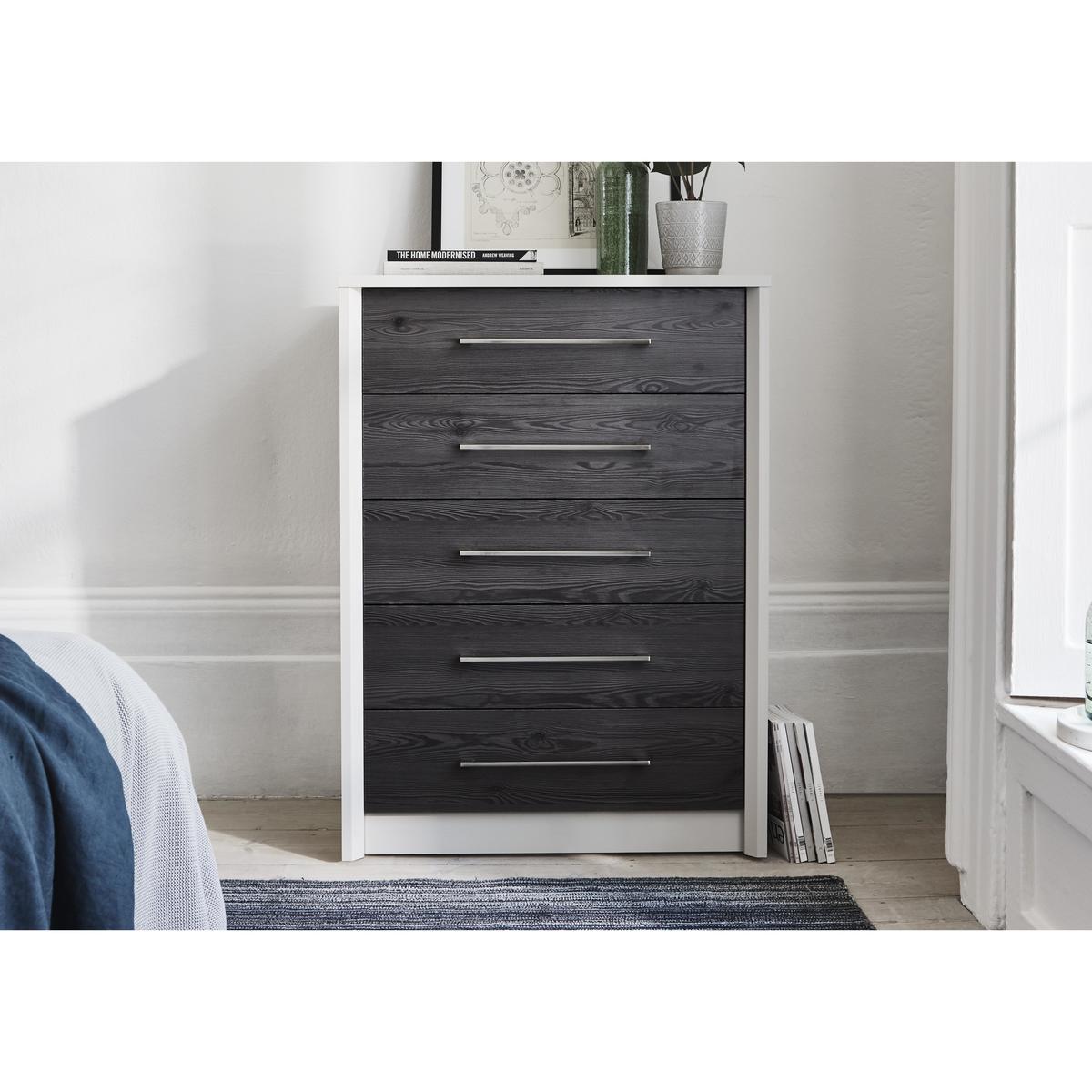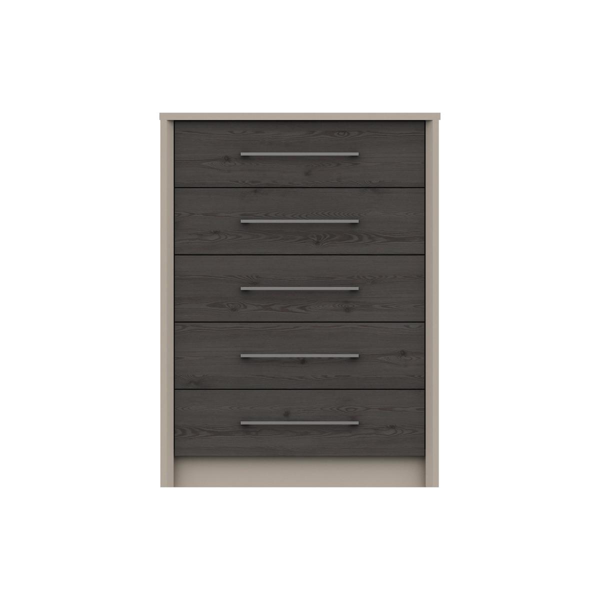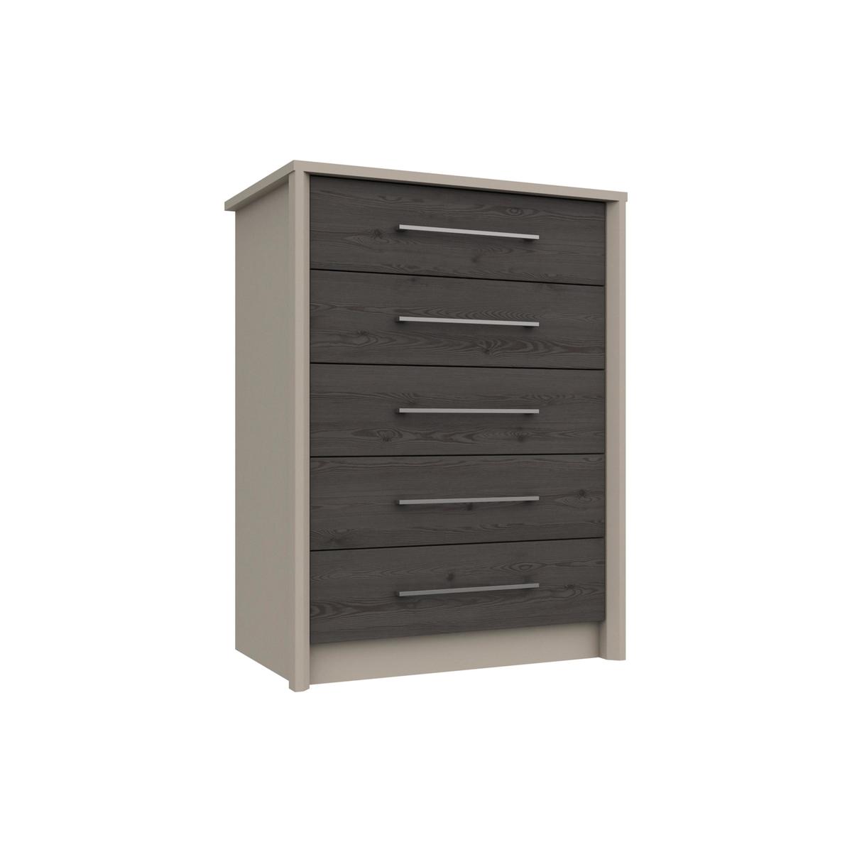 Furnish your bedroom in thoroughly modern style with the London Bedrooms Paddington range. This versatile collection boasts clean-lined angles, slim brushed nickel handles and drawers in a beautiful painted wood-effect finish which comes in a choice of stylish light grey or sophisticated anthracite grey. You’ll find spacious wardrobes, roomy chests of drawers, compact bedside cabinets and even an elegant dressing table. Each piece is well-built with soft close drawers and each wardrobe boasts space-efficient storage solutions inside. Storing away clothes and belongings has never been so easy – or so stylish. This great-value contemporary bedroom storage collection is only available at Furniture Village. Modern and sophisticated style. Beautiful wood grain effect finish. Exclusive to Furniture Village. The London Bedrooms Paddington 5 Drawer Chest makes putting your clothes away a breeze – and it does it in fashionable style too. With its modern clean-lined angles and slimline brushed nickel handles, it makes a contemporary style statement in any bedroom. The five spacious drawers give you generous storage room for everything from socks and scarves to chunky winter knits and jeans. Each drawer has a reinforced base for heavier items, a soft close and easy-glide metal runners which makes them wonderfully easy to use. You’ll love its beautiful painted wood-effect finished drawers, available in two stylish shades of light grey and anthracite grey to complement the sleek, glossy Fired Earth taupe colour on the outside. Only available at Furniture Village, the London Bedrooms Paddington 5 Drawer Chest is part of the London Bedrooms Paddington range – a modern bedroom storage collection designed for the contemporary home. WARNING!. Furniture can tip over unexpectedly and cause injury. This item shall be fixed to a wall using the anti-tip kit provided with the furniture. Be sure to use the correct wall fixings suitable for the walls in your home.