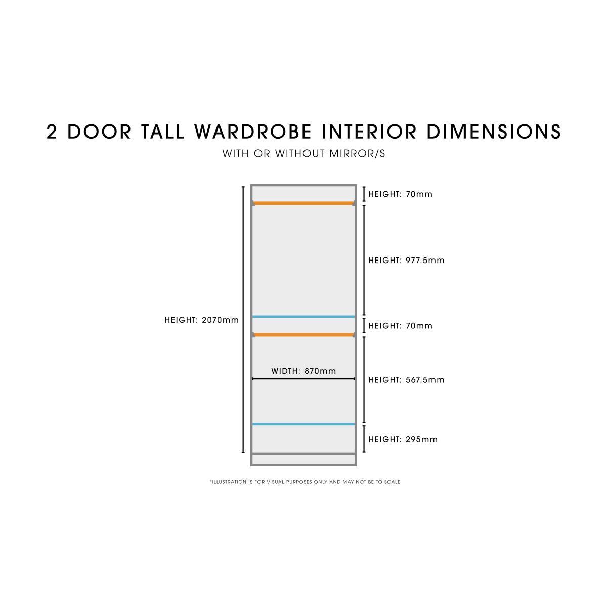 Tall, wide and deep, this large 2-door wardrobe has extra hanging space and extra shelves – perfect for a high-ceilinged bedroom with a need for storage space. We love its sleek high-gloss finish. Why you'll love it. Sleek and stylish 2-door tall wardrobe has a beautiful high-gloss finish. Understated contemporary design. Large in scale for optimum storage. This wardrobe is taller, wider and deeper than the range’s standard 2-door wardrobe. Gently curved recessed door pulls for a modern handleless silhouette. Doors are soft closing. Available in four sophisticated high-gloss colours. Assembled for you. Made with care in London. What you need to know. 2-door tall wardrobe has 1 hanging rail and 1 fixed shelf. Please allow time for this wardrobe to settle into carpeted floors. This product comes flat packed and will be assembled and installed for you by our delivery team. The London Bedrooms St Pancras collection includes chests of drawers, bedside cabinets and more. Warning!. Furniture can tip over unexpectedly and cause injury. This item should be fixed to a wall using the anti-tip kit provided with the furniture. Be sure to use the correct wall fixings suitable for the walls in your home.