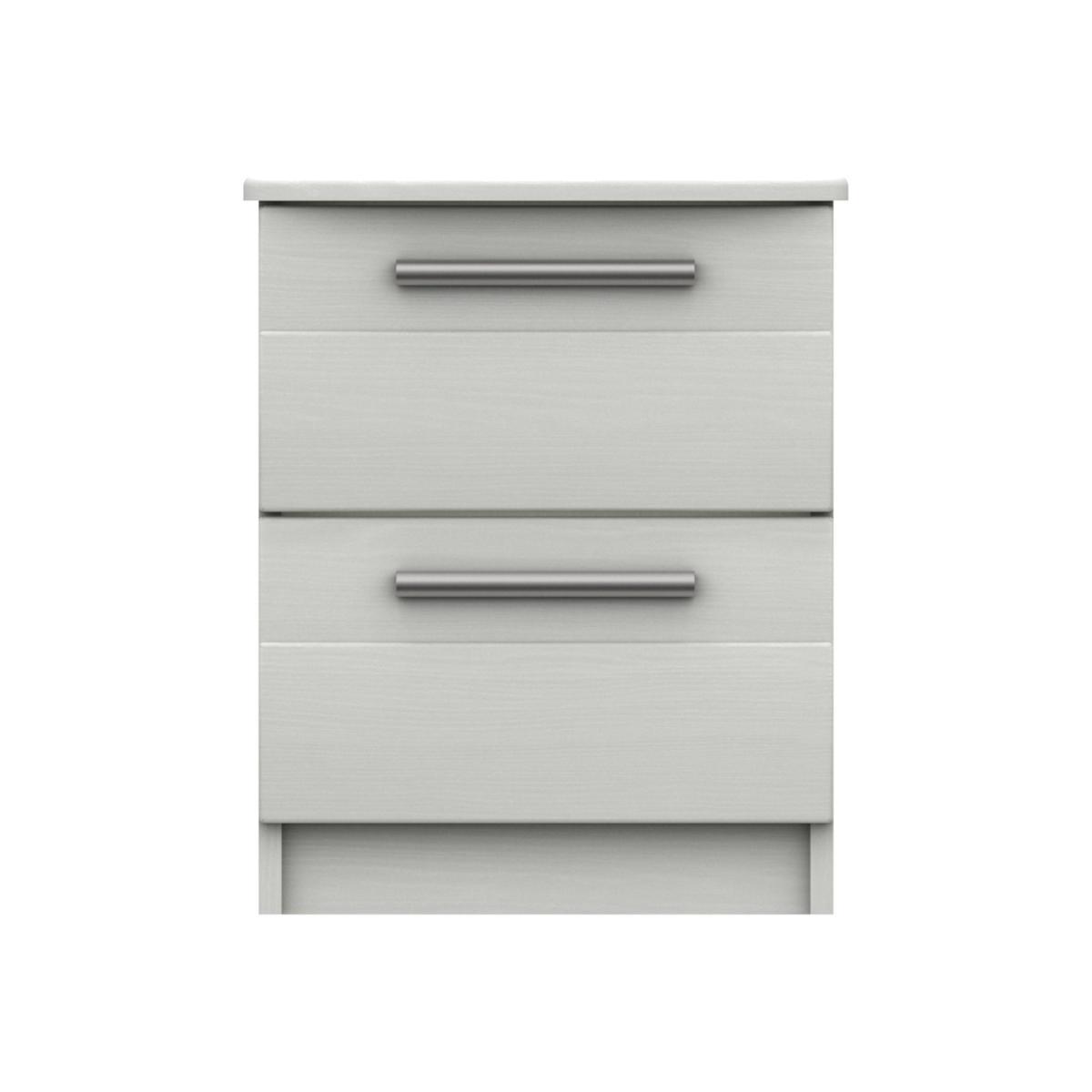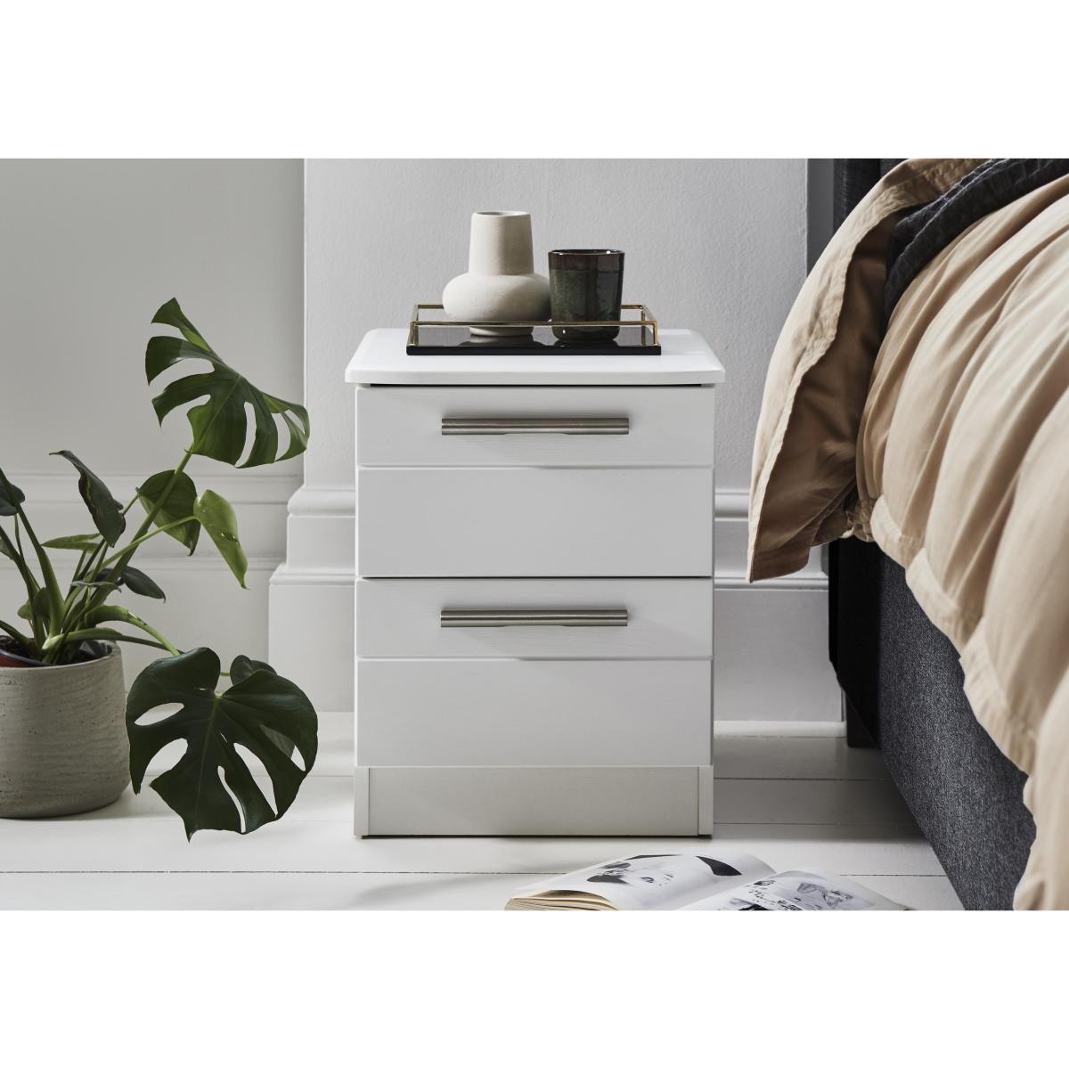 Here’s the perfect bedside cabinet – two neat drawers, stylish metal drawer handles, a contemporary interpretation of tongue and groove panelling, and a sophisticated woodgrain-effect finish. Why you'll love it. Charming bedside cabinet offers a new take on traditional tongue and groove style. Generously proportioned contemporary design. Soft woodgrain-effect finish. Elegant linear metal handles with rounded edges. Drawers have extra-strong bases and soft-close mechanisms. Available in three colours – white, light grey and graphite. Fully assembled. Beautifully crafted in London. What you need to know. 2 equally sized drawers. Woodgrain effect appears on cabinet top and drawer fronts. Shop the London Bedrooms Victoria range for a wide choice of wardrobes and storage pieces.