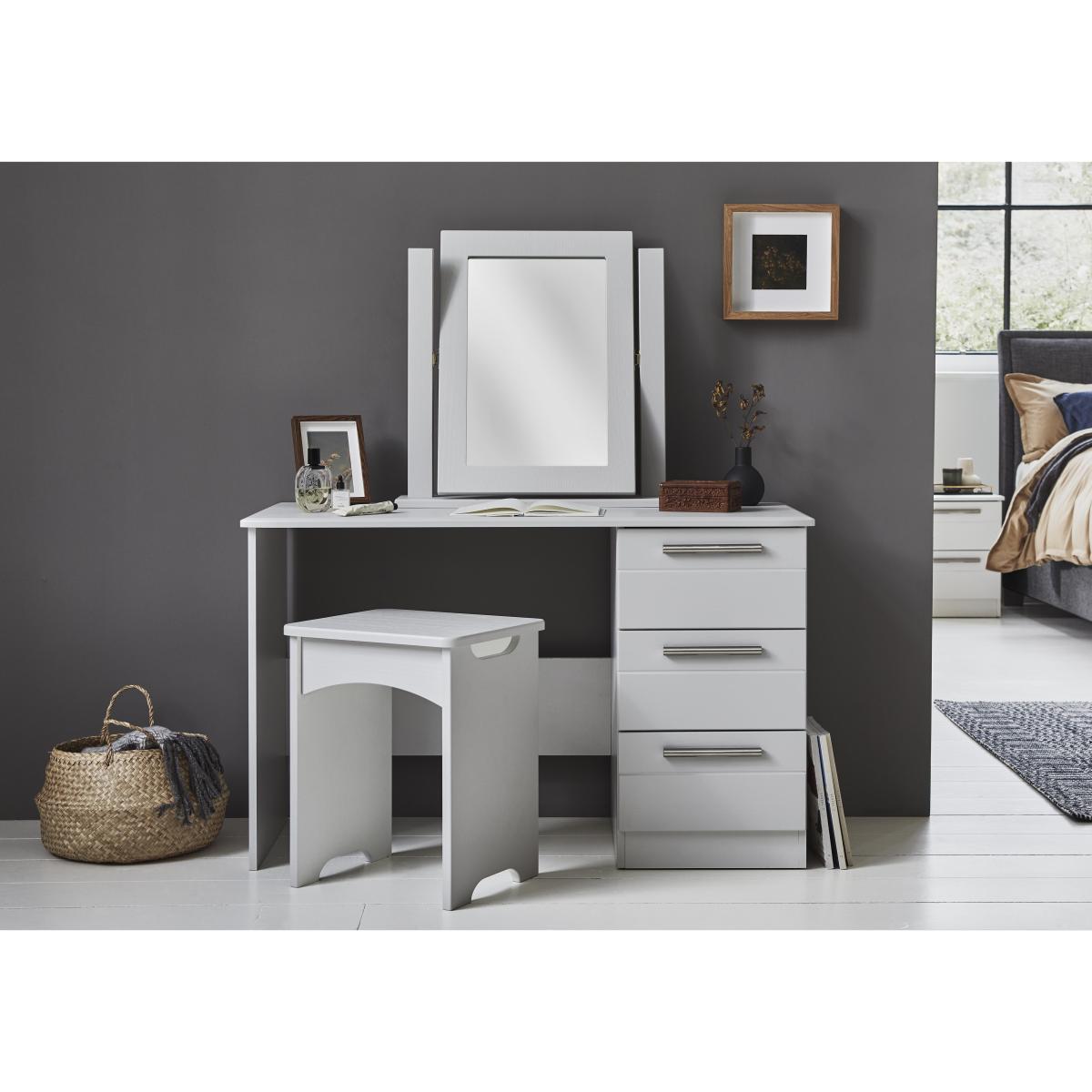 Practical and stylish, this dressing table has three handy drawers and plenty of surface space for make-up, trinkets and a mirror. We love the sophisticated interpretation of a tongue and groove finish. Why you'll love it. Charming dressing table offers a new take on traditional tongue and groove style. Generously proportioned contemporary design. Soft woodgrain-effect finish. Elegant linear metal handles with rounded edges. Drawers have extra-strong bases and soft-close mechanisms. Available in three colours – white, light grey and graphite. Fully assembled. Beautifully crafted in London. What you need to know. 3 equally sized drawers. Woodgrain effect appears on dressing table top and drawer fronts. Shop the London Bedrooms Victoria range for a wide choice of wardrobes and storage pieces. Warning!. Furniture can tip over unexpectedly and cause injury. This item should be fixed to a wall using the anti-tip kit provided with the furniture. Be sure to use the correct wall fixings suitable for the walls in your home.
