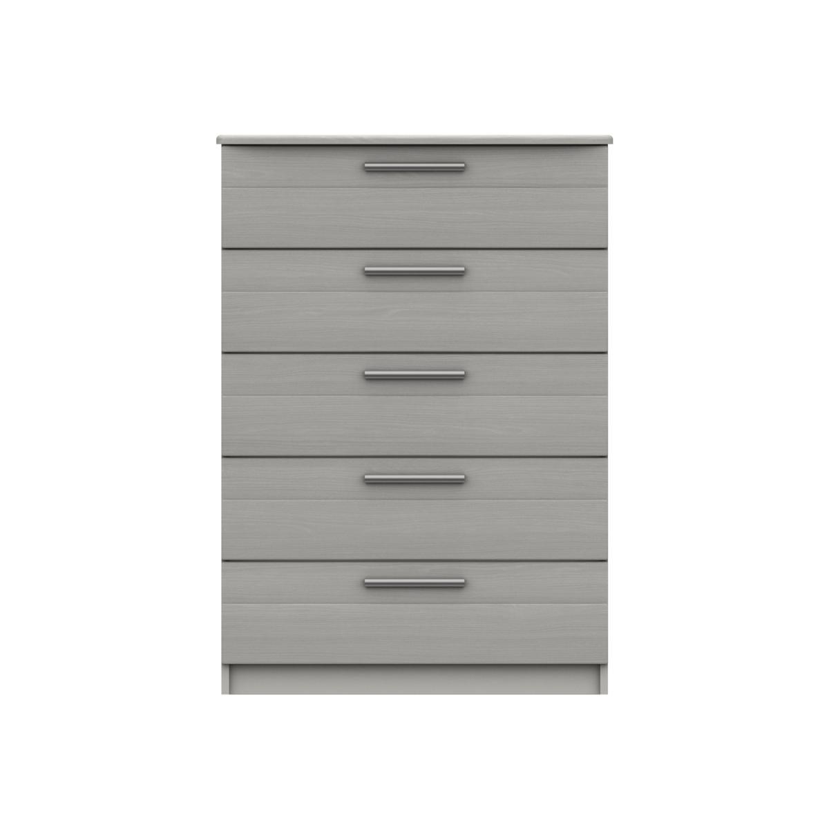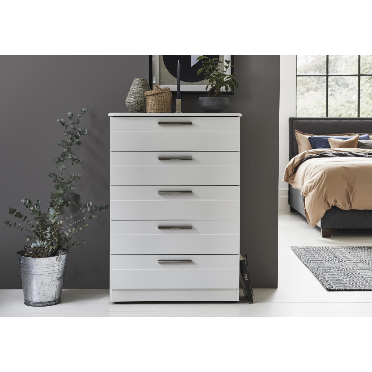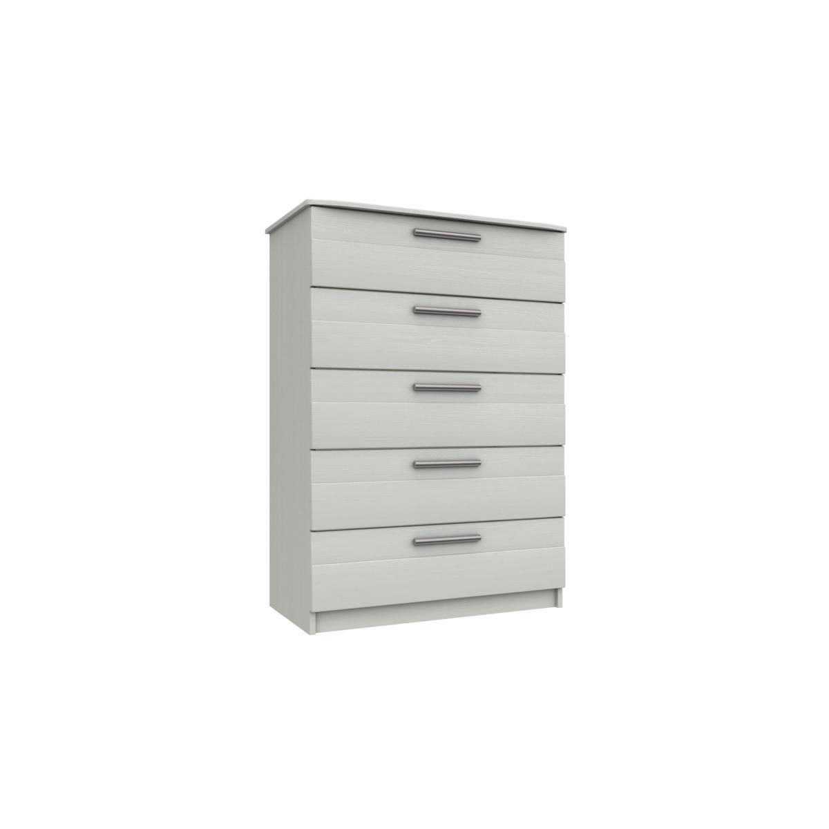 The London Bedrooms Victoria look blends contemporary style in your choice of three sophisticated colours with a charming tongue and groove finish. All that and spacious storage too. Why you'll love it. Charming large chest of drawers offers a new take on traditional tongue and groove style. Generously proportioned contemporary design. Soft woodgrain-effect finish. Elegant linear metal handles with rounded edges. Drawers have extra-strong bases and soft-close mechanisms. Available in three colours – white, light grey and graphite. Fully assembled. Beautifully crafted in London. What you need to know. 5 equally sized drawers. Woodgrain effect appears on chest top and drawer fronts. Shop the London Bedrooms Victoria range for a wide choice of wardrobes and storage pieces. Warning!. Furniture can tip over unexpectedly and cause injury. This item should be fixed to a wall using the anti-tip kit provided with the furniture. Be sure to use the correct wall fixings suitable for the walls in your home.