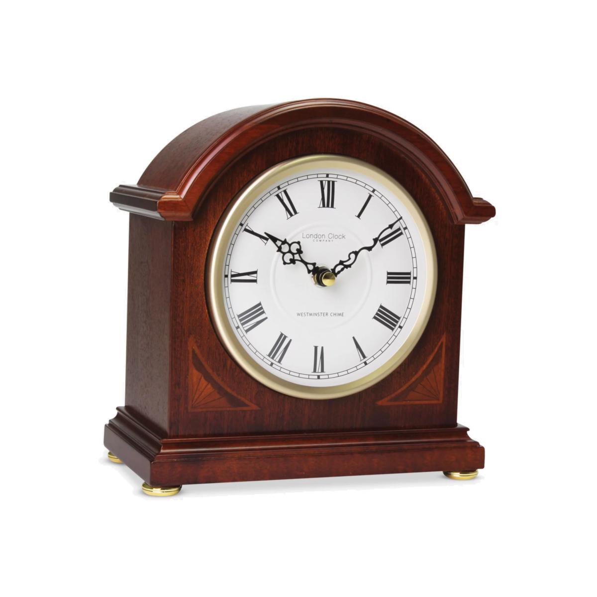 A reassuring Westminster hourly chime sounds from this arched mantel clock from the London Clock Company. This dome-shaped design has a mahogany wood finish with Art Deco-inspired flourishes on the front sides. Roman numerals keep it classic and the clock boasts golden detailing together with ornate metal hands. There's a night shut-off option for switching off the chime as you sleep. Replace the batteries every 12 months or when the clock stops working. Not suitable for children.
