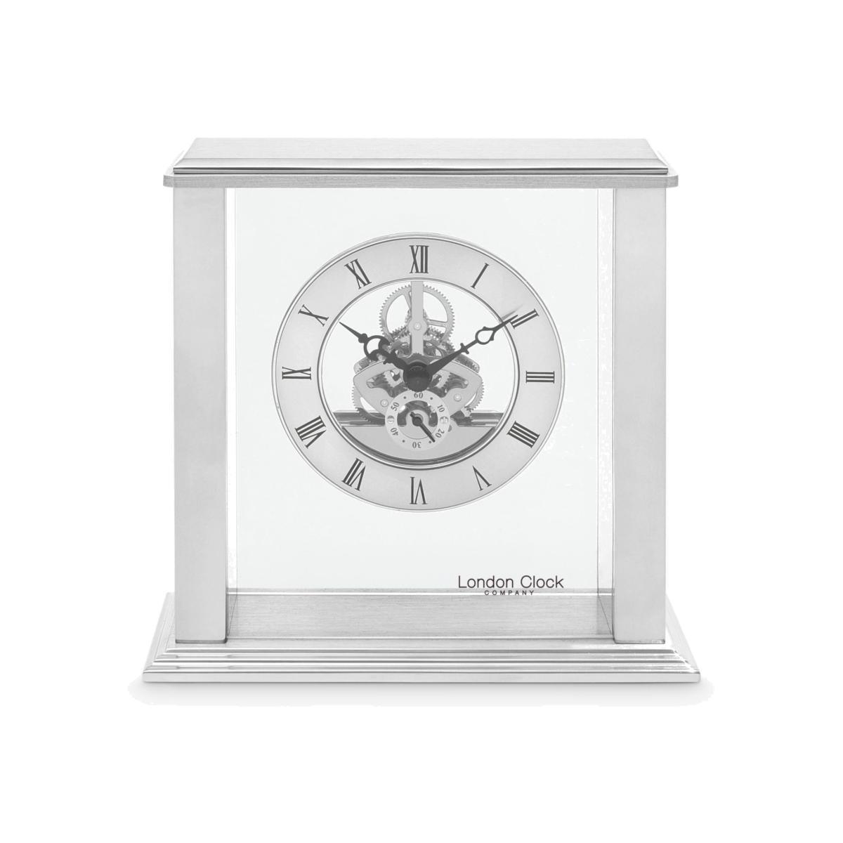 A square mantel clock from the London Clock Company with an exposed skeleton design to show the inner mechanism and movement. This analogue clock has a glass front with a round Roman numerals dial set within it. Ornate hands and a brushed chrome metal casing and base complete this traditional piece.
