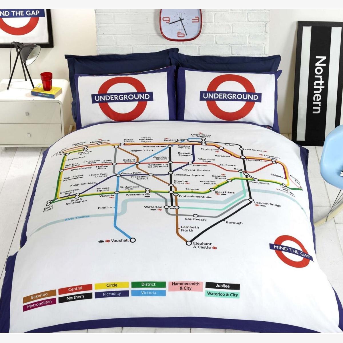 London Underground bedding showing all of the underground stations in the capital. Iconic and fashionable.