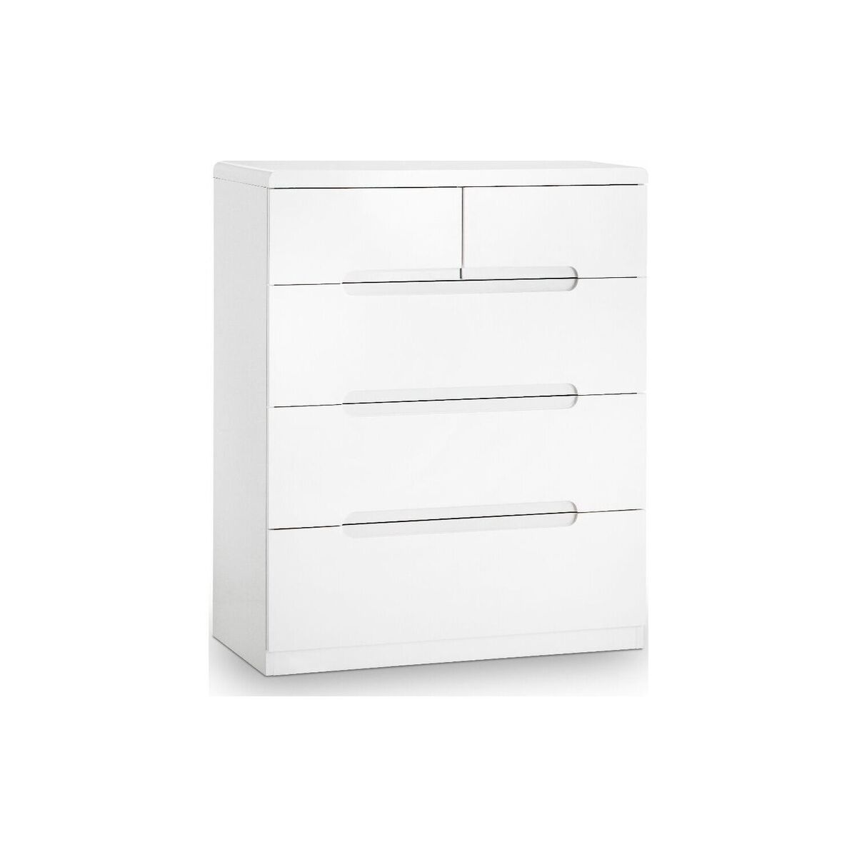 Minimalist design can often be devoid of character; this is not the case with the London range. The striking 2 over 3 drawer chest features clean lines and restrained styling typical of style that makes it a perfect fit for most modern décors. The beautiful mixing of curves and straight lines along with a stunning finish create a piece you'll love looking every day. The London chest features 2 narrow drawers and 3 wide drawers all with recessed handles. Strong and durable metal runners are used to ensure excellent durability. The chest is made from particleboard which is finished with a white high gloss lacquer. If you are looking to revamp your bedroom suite, matching furniture from the. London. Range is available.