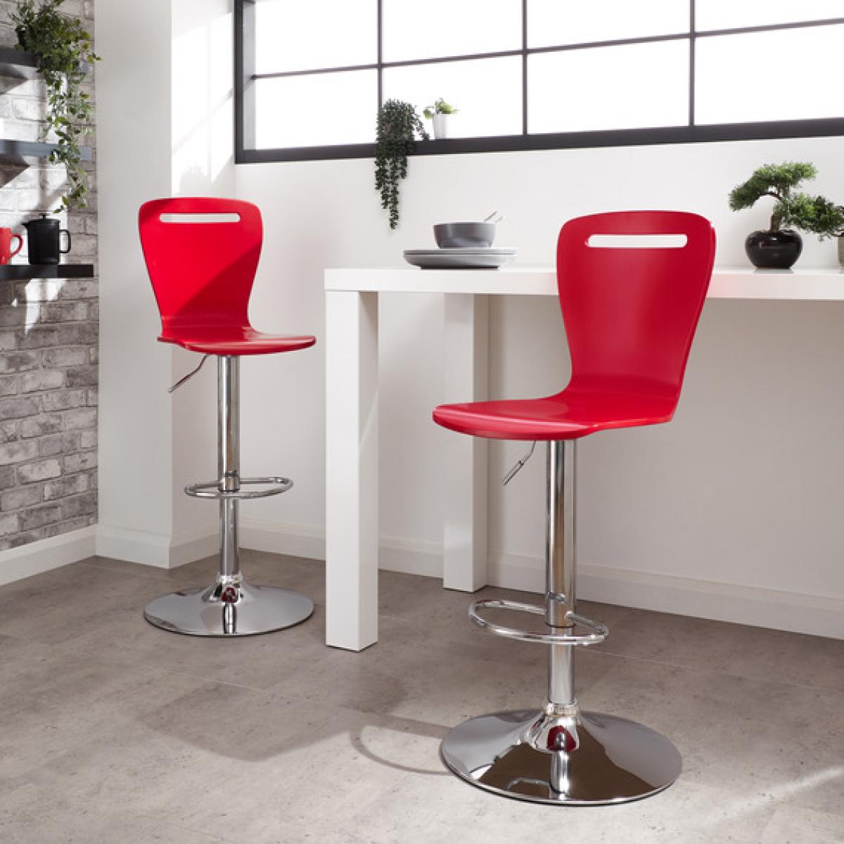 Set the scene for an impromptu meal with these striking bar stools. Each stylish bar stool features a bentwood seat and back rest mounted on a sturdy chrome-plated frame with built-in footrest, terminated in an extra-wide circular base. The seats are contoured for comfort and height-adjustable via a simple lever operation. The frame incorporates an effective gas piston mechanism that allows you to tweak the elevation to suit. The base has a rubber floor guard for stability, even on polished surfaces. Safe (EU standards), durable and available as pairs in a rainbow of primary colours.