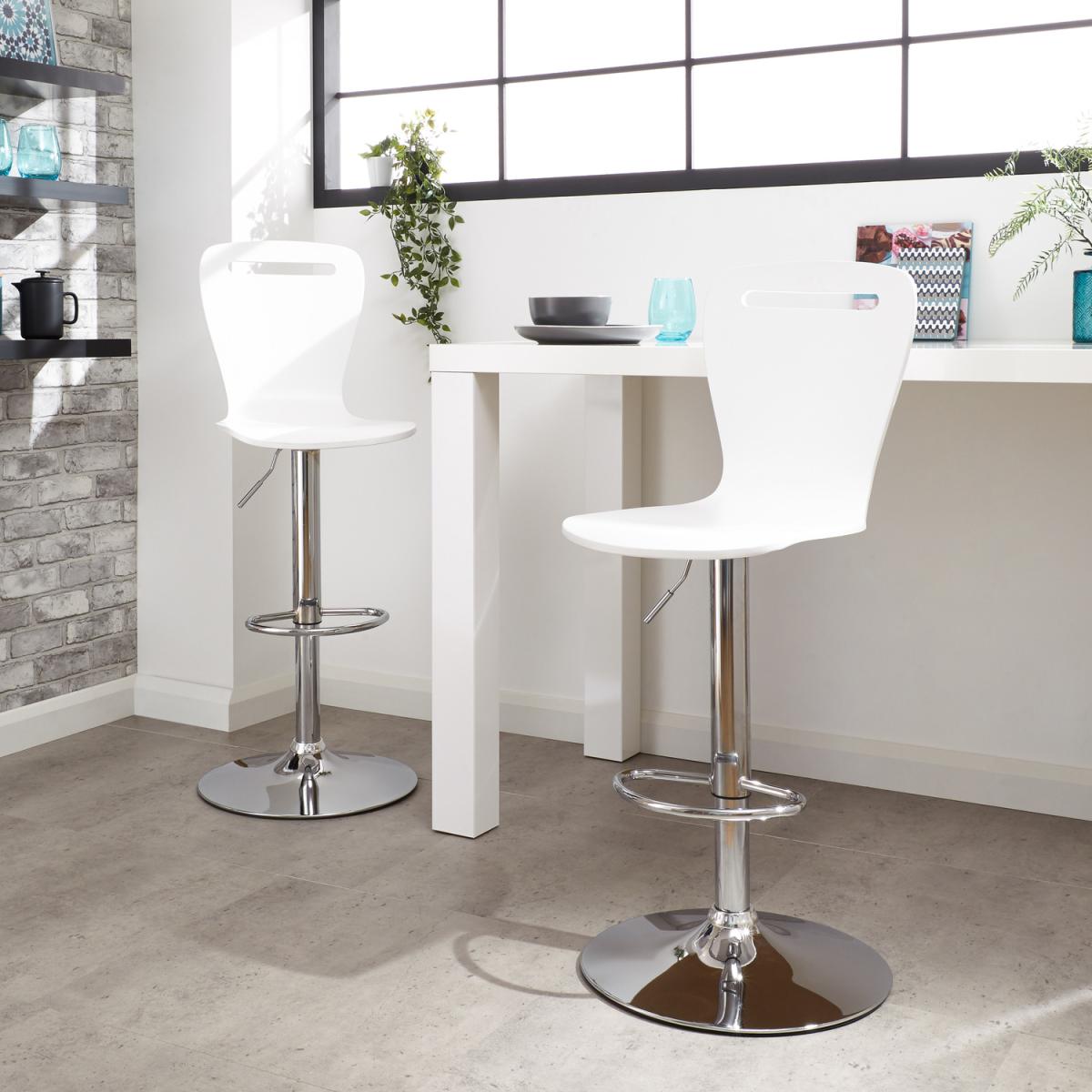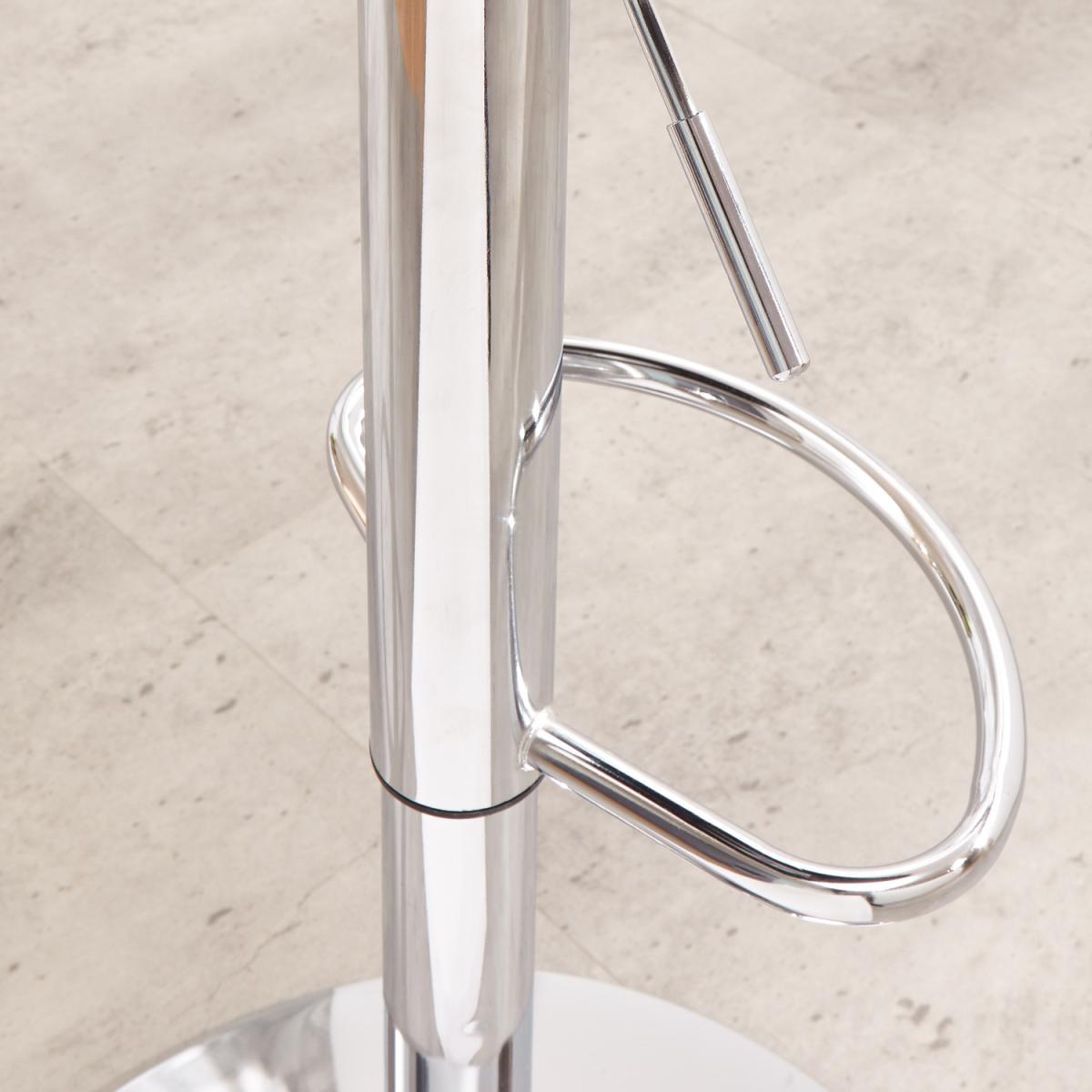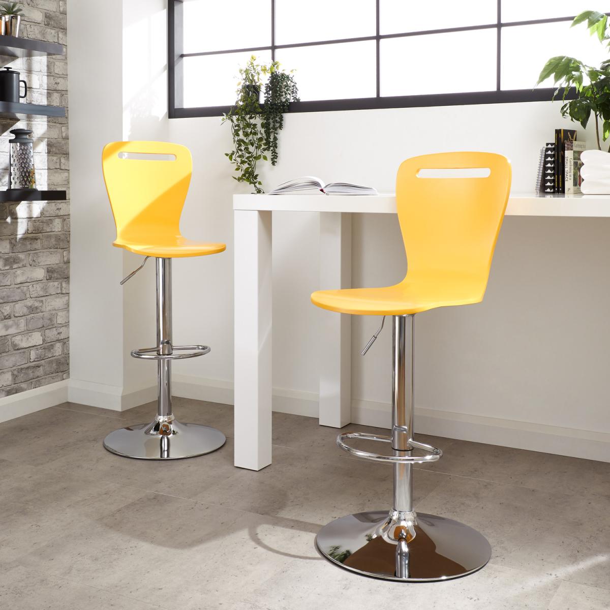 Set the scene for an impromptu meal with these striking bar stools. Each stylish bar stool features a bentwood seat and back rest mounted on a sturdy chrome-plated frame with built-in footrest, terminated in an extra-wide circular base. The seats are contoured for comfort and height-adjustable via a simple lever operation. The frame incorporates an effective gas piston mechanism that allows you to tweak the elevation to suit. The base has a rubber floor guard for stability, even on polished surfaces. Safe (EU standards), durable and available as pairs in a rainbow of primary colours.