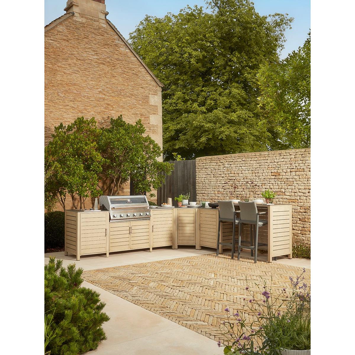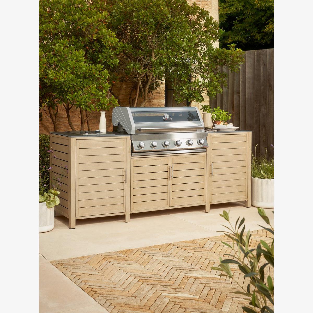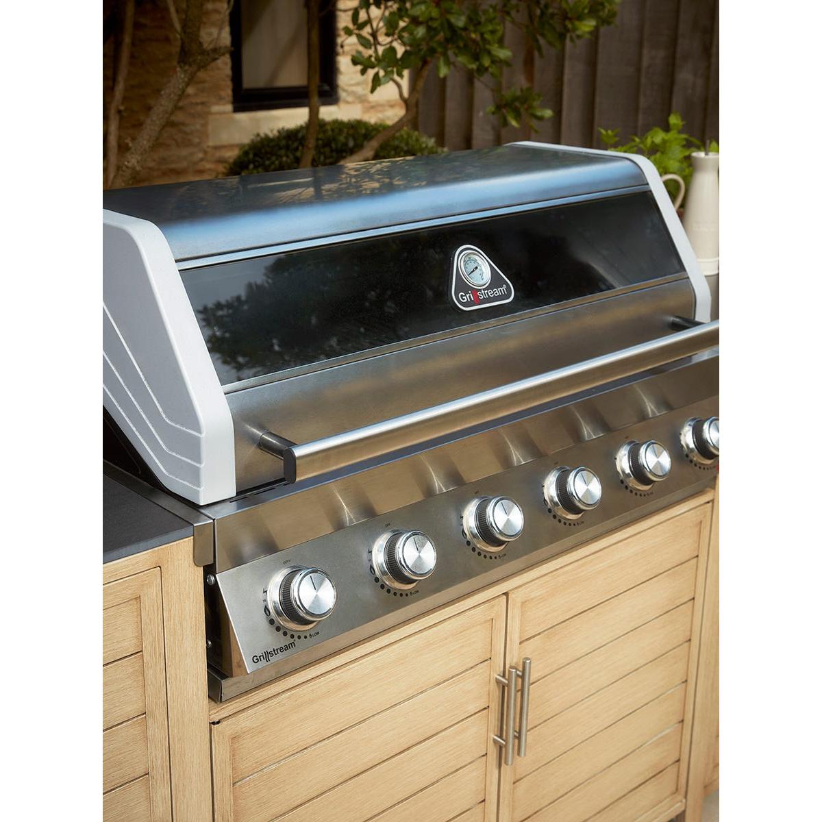 Create an instant outdoor kitchen with our Long Island BBQ and integrated storage cabinet which will transform your outdoor living, all year round. The technology of our Long Island six burner hybrid BBQ offers everything for the discerning chef who likes creative cooking outdoors integrated with a stunning range of outdoor kitchen units. Enabling you to keep all the utensils, pans and crockery you need close to hand, you’ll be even more enthusiastic about the spontaneity with which you can cook and serve a delicious al fresco feast. The attractive slatted cupboards are actually made from aluminium which has been handpainted to create a realistic wood grain effect. A scratch resistant coating makes it even tougher. The barbecue itself has all the features of our Gourmet BBQ - the luxe stainless steel finish, glass viewing hood, LED control and integrated side ceramic sear burner shelf. A modular system also allows you to remove the circular griddle in the middle of the grill to add a pizza stone or wok stand. Grillstream technology offers a double grill system whereby the top grill streams away most of the fats and juices that would normally cause flare-ups. Anything that drips over will collect in the bottom grill and is channeled into a collection cup ready for disposal - making for a much cleaner cooking experience. Our BBQ is contemporary and well formed, to sit effortlessly into your outdoor dining space. If, like us, you love to cook and entertain outside - take inspiration from Scandinavia and dine outdoors on even the coolest of days - the option of using gas or coals will allow all days to be catered for. Our Gourmet Gas & Charcoal Stainless Steel BBQ is fitted with a 27mm Propane regulator.
