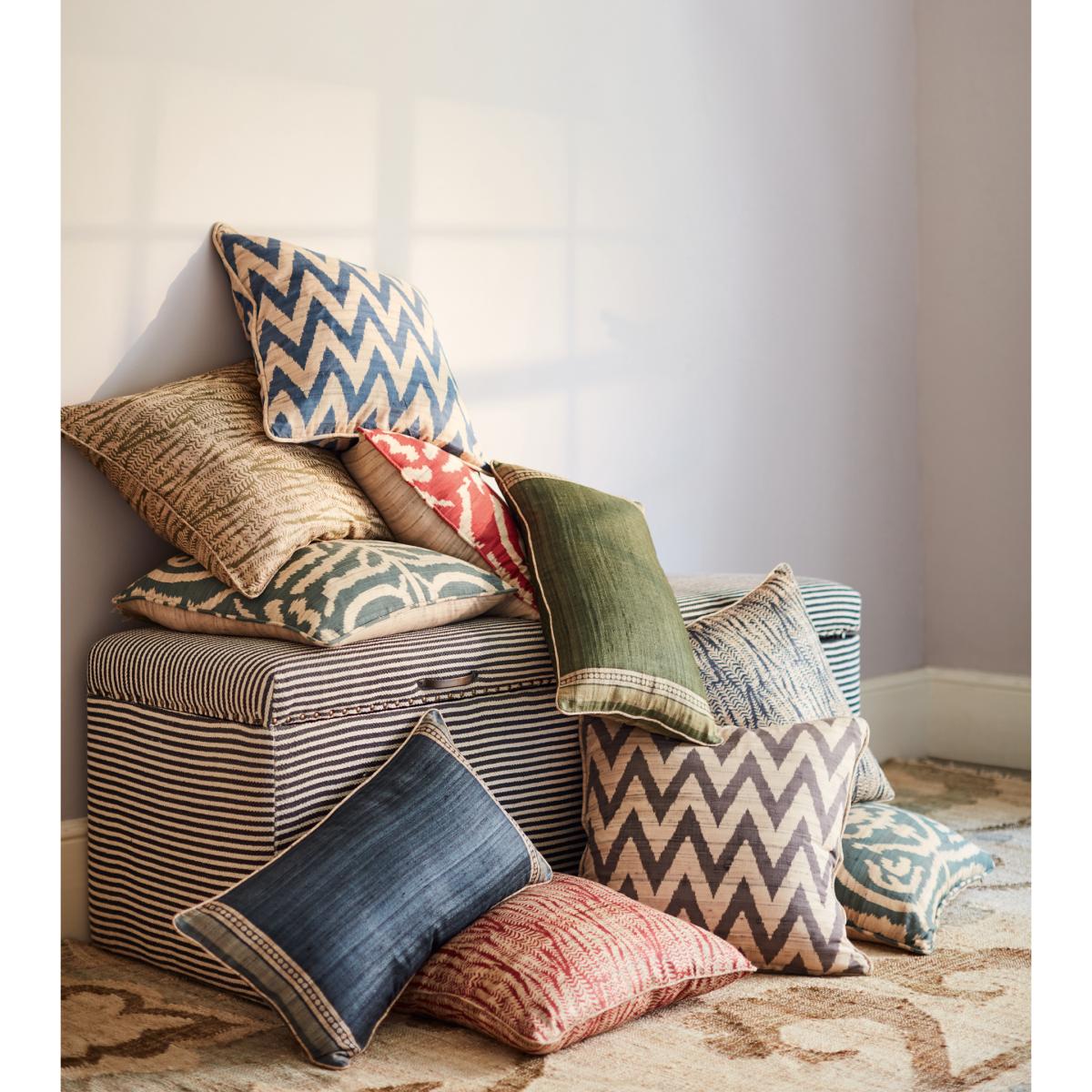 With a muted indigo tone that's achieved through a hand-dyeing process, the Longshan's handwoven tasar silk base and subtle block-printed border add gentle colour and understated pattern to a sofa, bed or armchair.