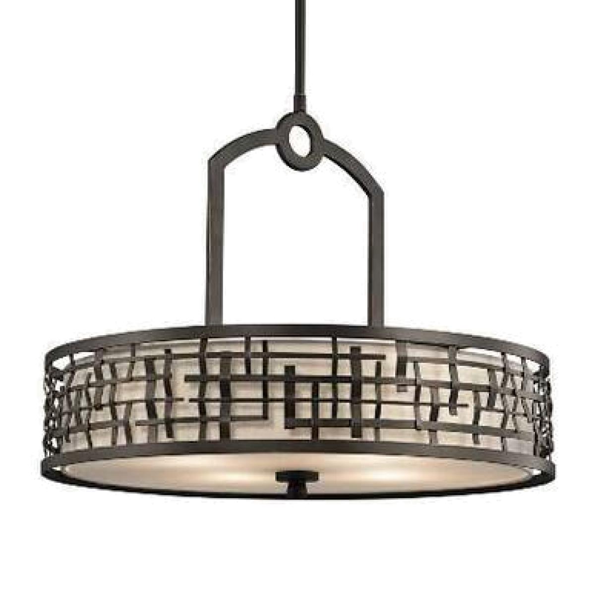 The basket weaved style metal frame with textured, intertwined Old Bronze detailing gives a perfect contrast to the lights white fabric shade and satin etched glass diffuser. Also available in this range 1lt Wall Light, Oval Island Chandelier, and Duo-Mount Pendant.