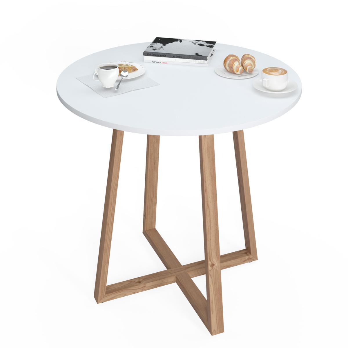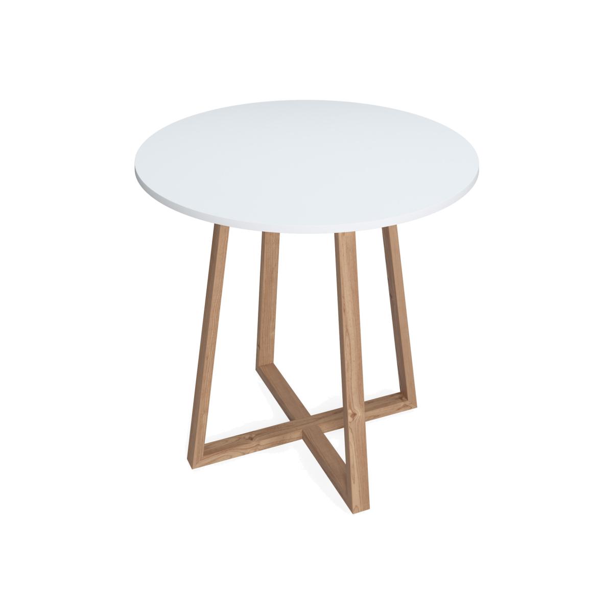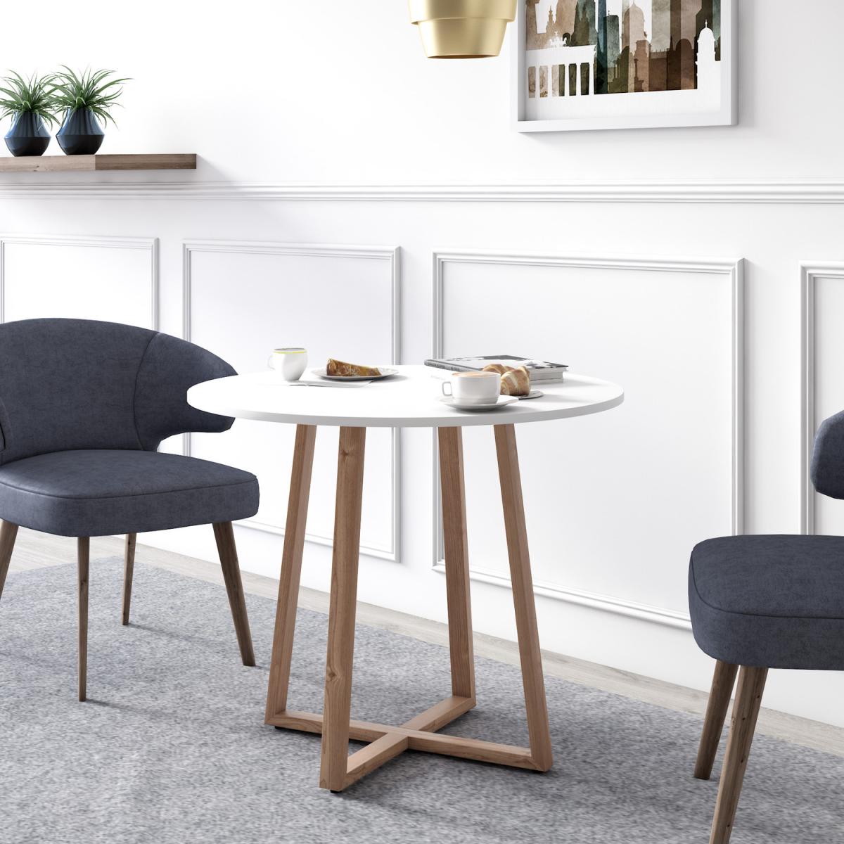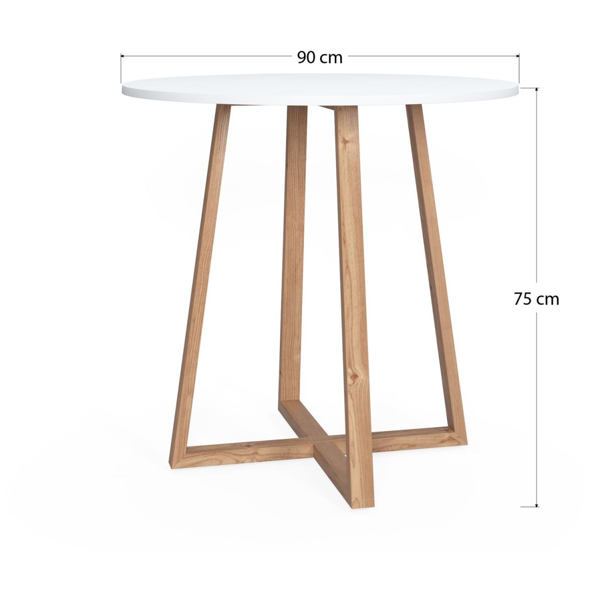 Ruumstore Loom Round Leisure Table 89cm width with wooden legs and white top, for office or kitchen, it can hold up to 2 to 4 people. A good option for kitchen dinner table or living room leisure table. Very easy to assemble with minimum tools. Loom Round Table, which attracts attention with its minimal structure, is an ideal solution for small houses and is a useful alternative for those who like simplicity in the living area. With its intertwined wooden foot structure, Loomyonlak Table is waiting for those who want to evaluate small areas in the most functional way with their ergonomic dimensions.