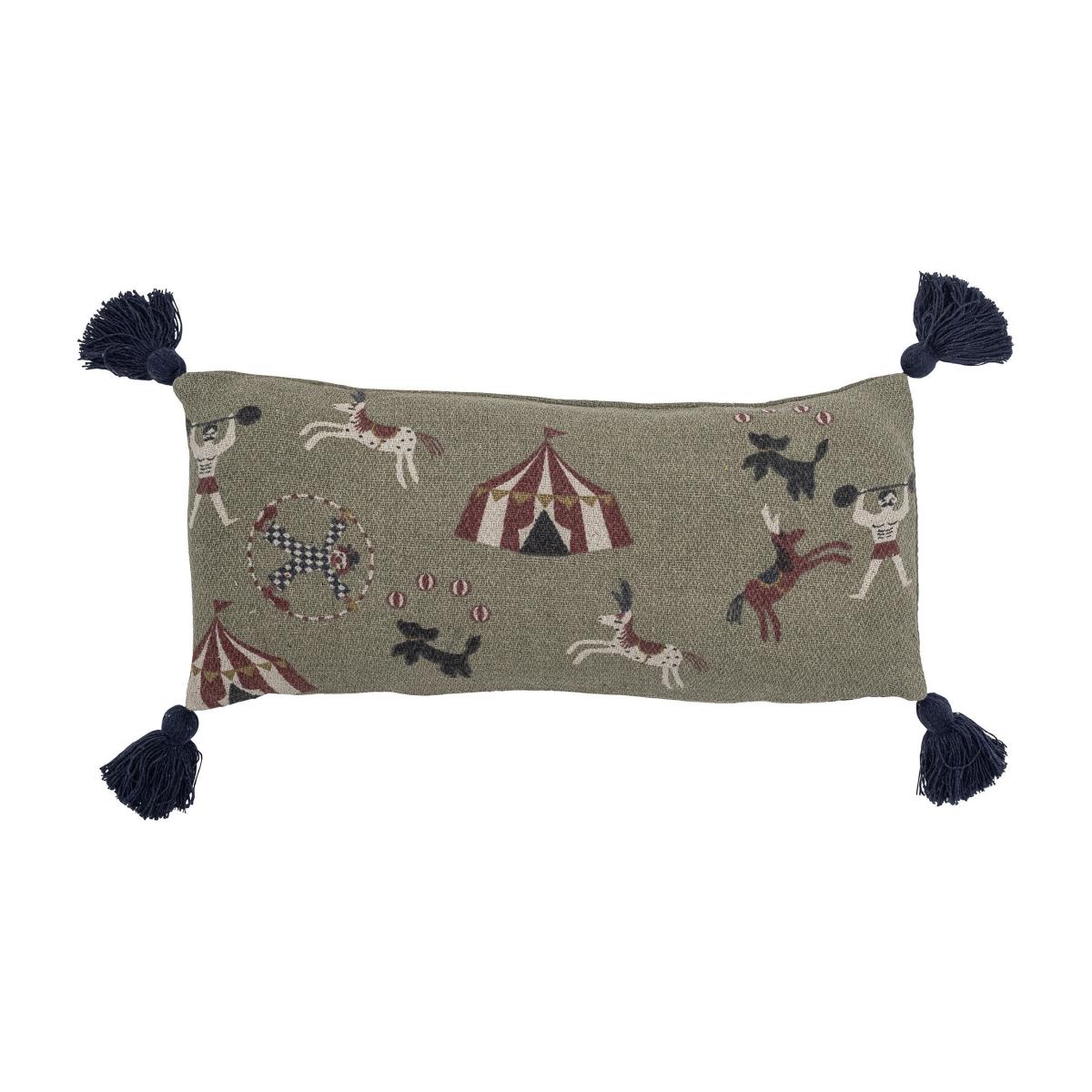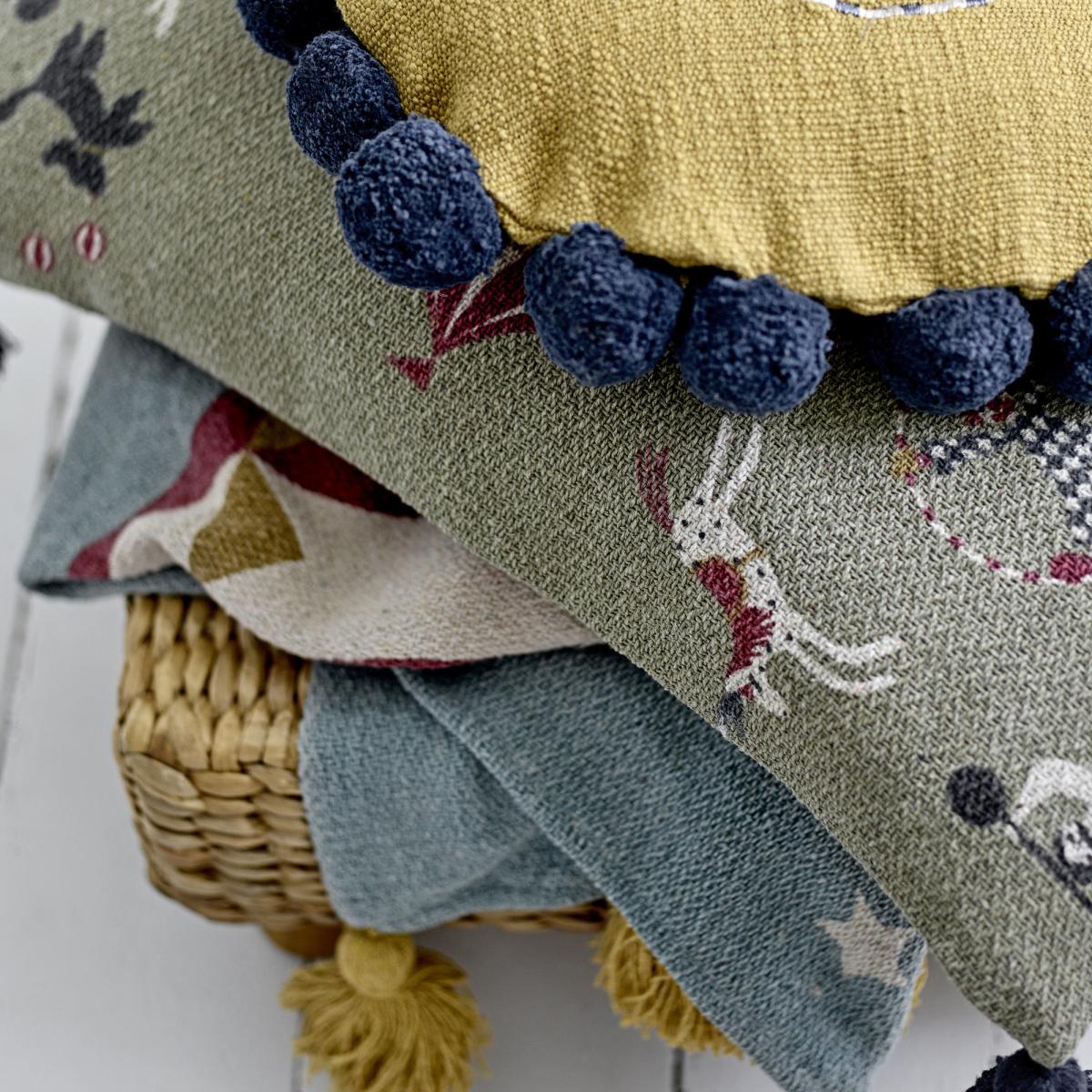 This cushion, often called the green loome, is a great way to introduce a touch of playful texture into a variety of interiors. Its recycled cotton material makes it an eco-conscious choice, while the rich green tone is versatile enough to complement both neutral and patterned furnishings. It's particularly well-suited for cosy, eclectic, or bohemian schemes, adding visual interest through its charming, circus-inspired print. For styling, consider pairing it with other textured textiles or layering on a mix of contrasting patterns for a lively yet balanced look. Its tassels add a relaxed, tactile detail that works well in casual or lived-in spaces, making it a practical yet stylish addition to sofas, armchairs, or bed ensembles.