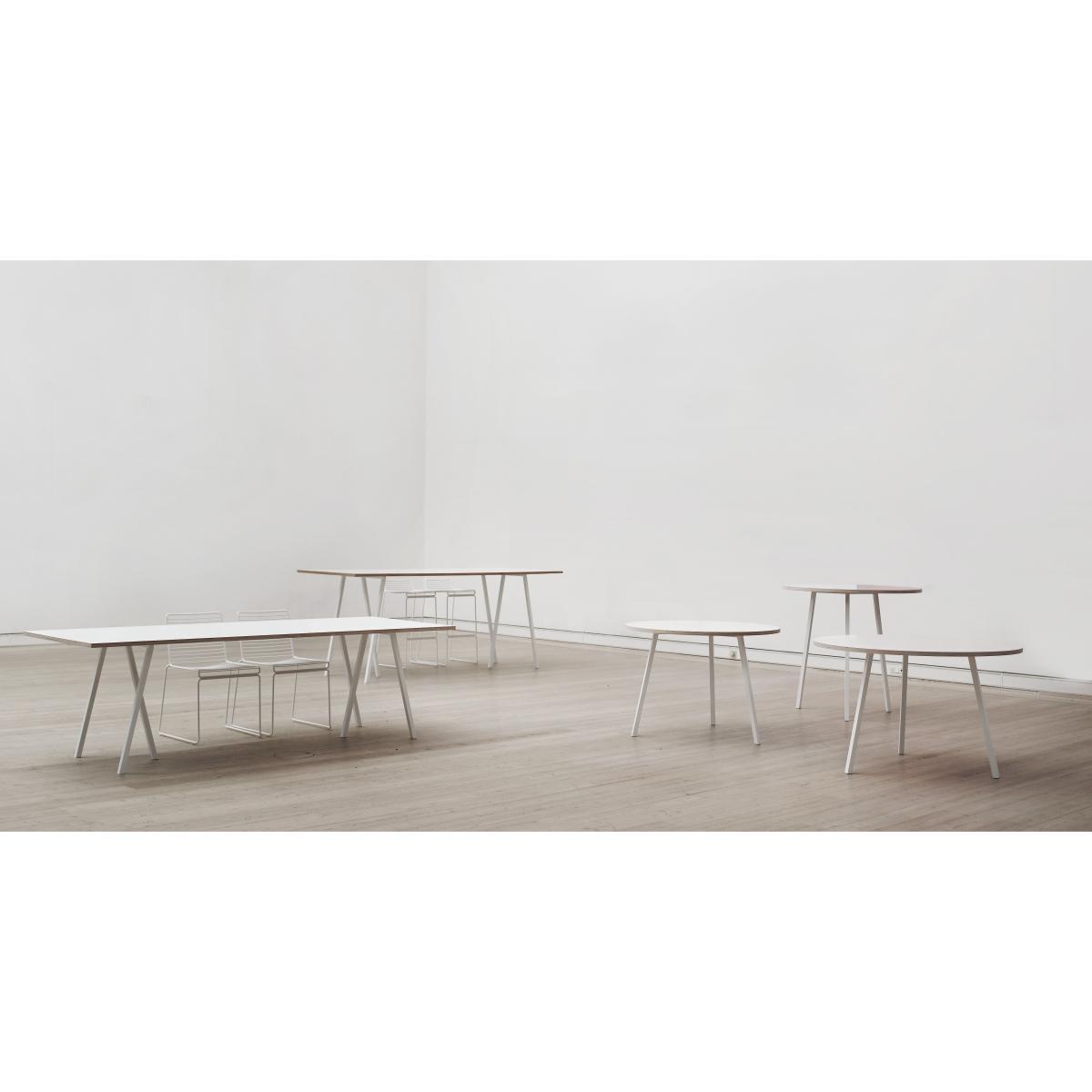 The Loop Stand Collection is a series of furniture designed by Leif Jorgensen for HAY. The collection consists of basic and usable furniture with affordable price tags - and the Loop family keeps growing. Loop Stand is a simplification of the industrial trestle and designed with three legs. Inspired by traditional trestles Loop Stand uses a simple idiom which lays emphasis on a three dimensional and graphic look. The Loop Stand Dining trestle was originally designed for the fashion/art shop Storm in Copenhagen where Leif Jorgensen designed the interior.