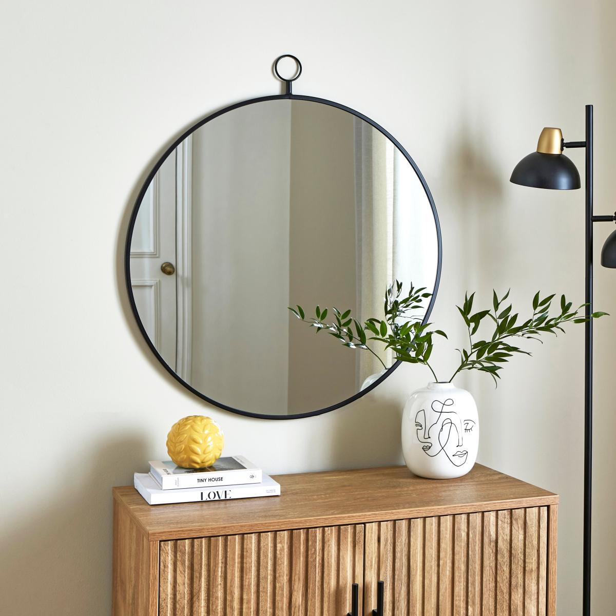 I’m a big fan of the loop-top mirror for its pared-back steel frame and the simple ring detail at the top, which injects a little personality without shouting for attention. It works equally well in industrial, Scandi or modern farmhouse schemes and is especially useful in hallways or above a slim console to catch natural light and make small spaces feel airier. For styling, hang it at eye level and flank it with a pair of wall-mounted sconces or a couple of low vases and a small tray on the console below. Its matt black finish ties in neatly with dark metal fittings elsewhere, while the softly curved edge keeps the look from feeling too severe.