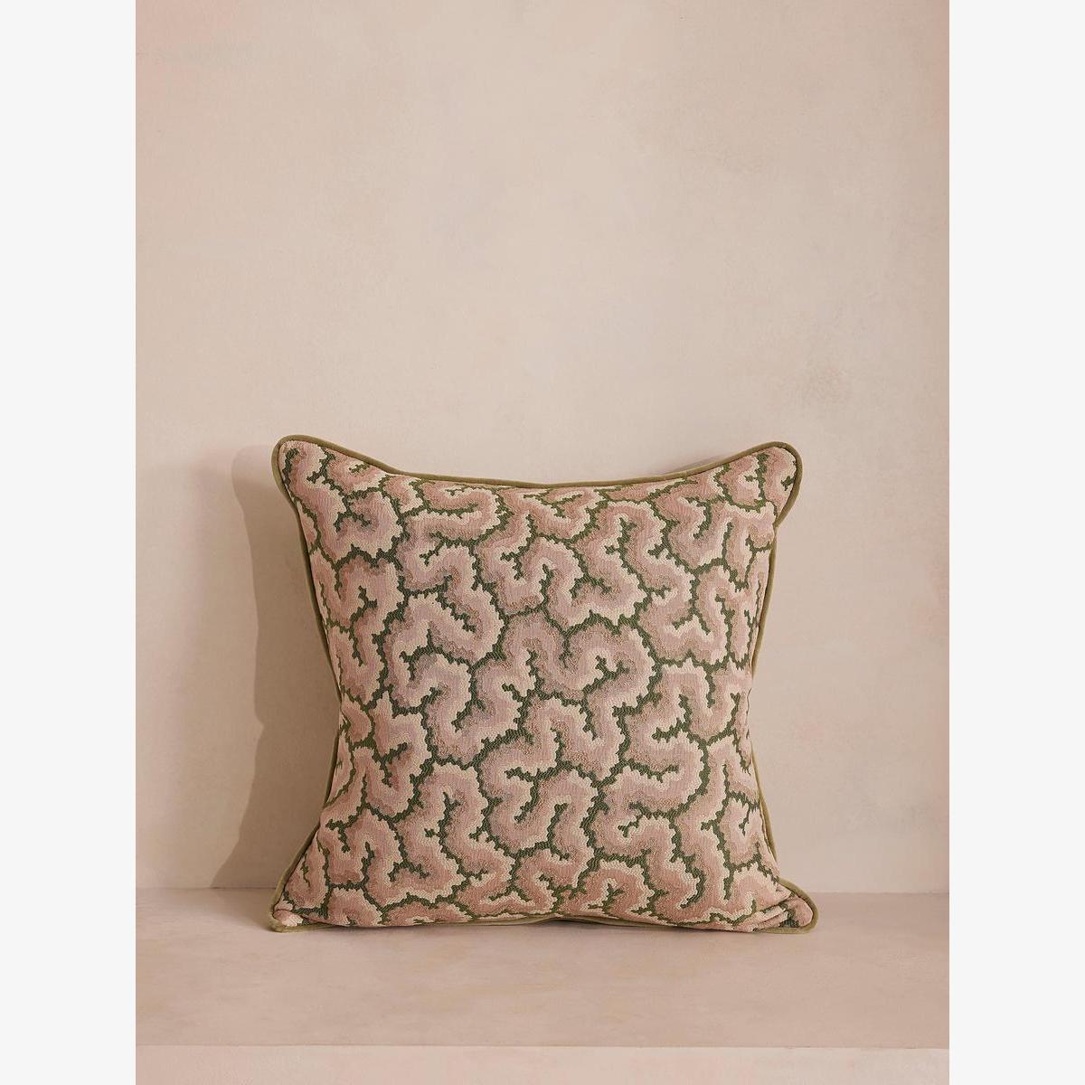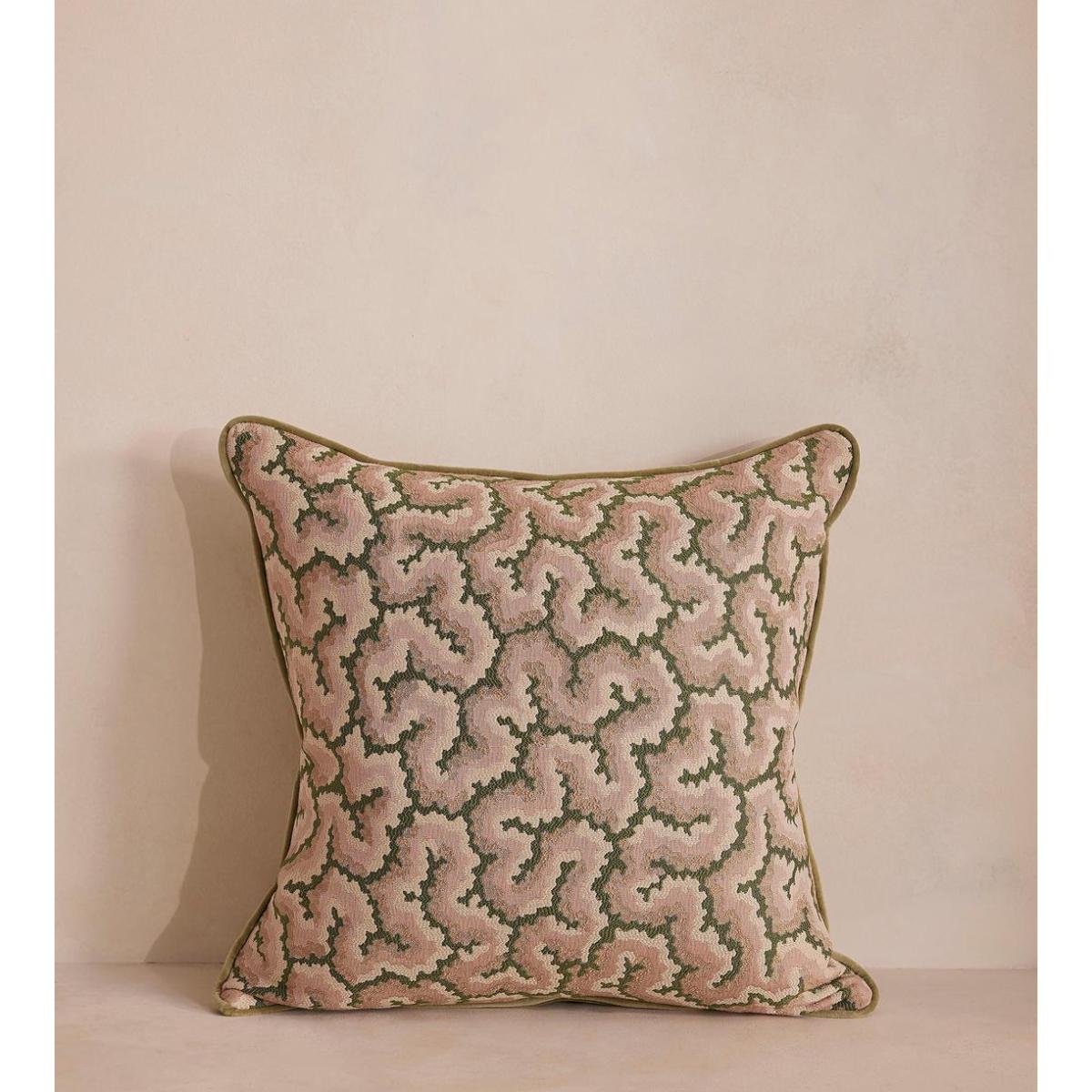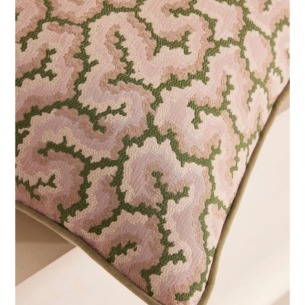 A geometric woven jacquard pattern is complemented by a rich, sage velvet backing and tonal piping. Inspired by the rich velvets seen throughout 76 Dean Street, the Lophelia cushion is backed with a sage-coloured velvet that matches back to our made-to-order palette. At the front, a soft, woven jacquard is surrounded with a matching piped trim.