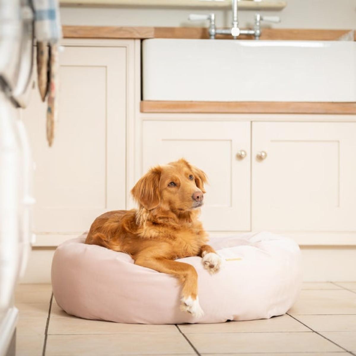 * Soft and plush dog bed * Polyester fibre filling The velvet donut dog bed from Lords and Labradors is a plush retreat for pets who love to snuggle. Upholstered in rich, velvety fabric and generously filled for extra plumpness, it’s crafted to keep your dog cosy and calm. The round shape is ideal for curling up, offering a sense of security that’s perfect for rest after play, walks, or grooming. Available in a range of sizes to suit various breeds.