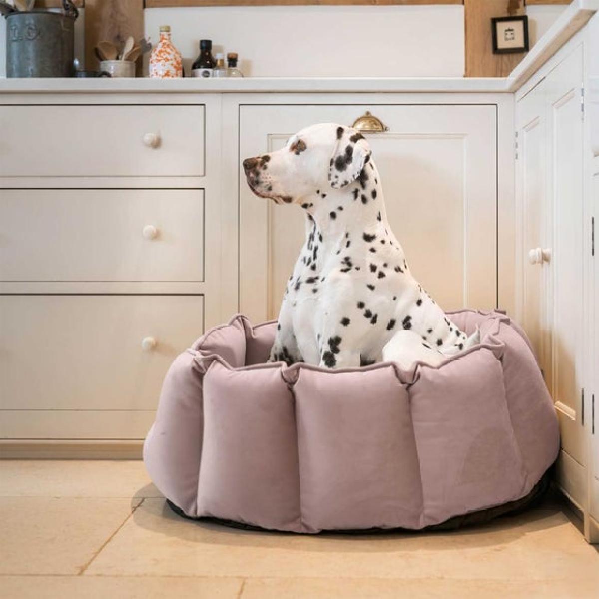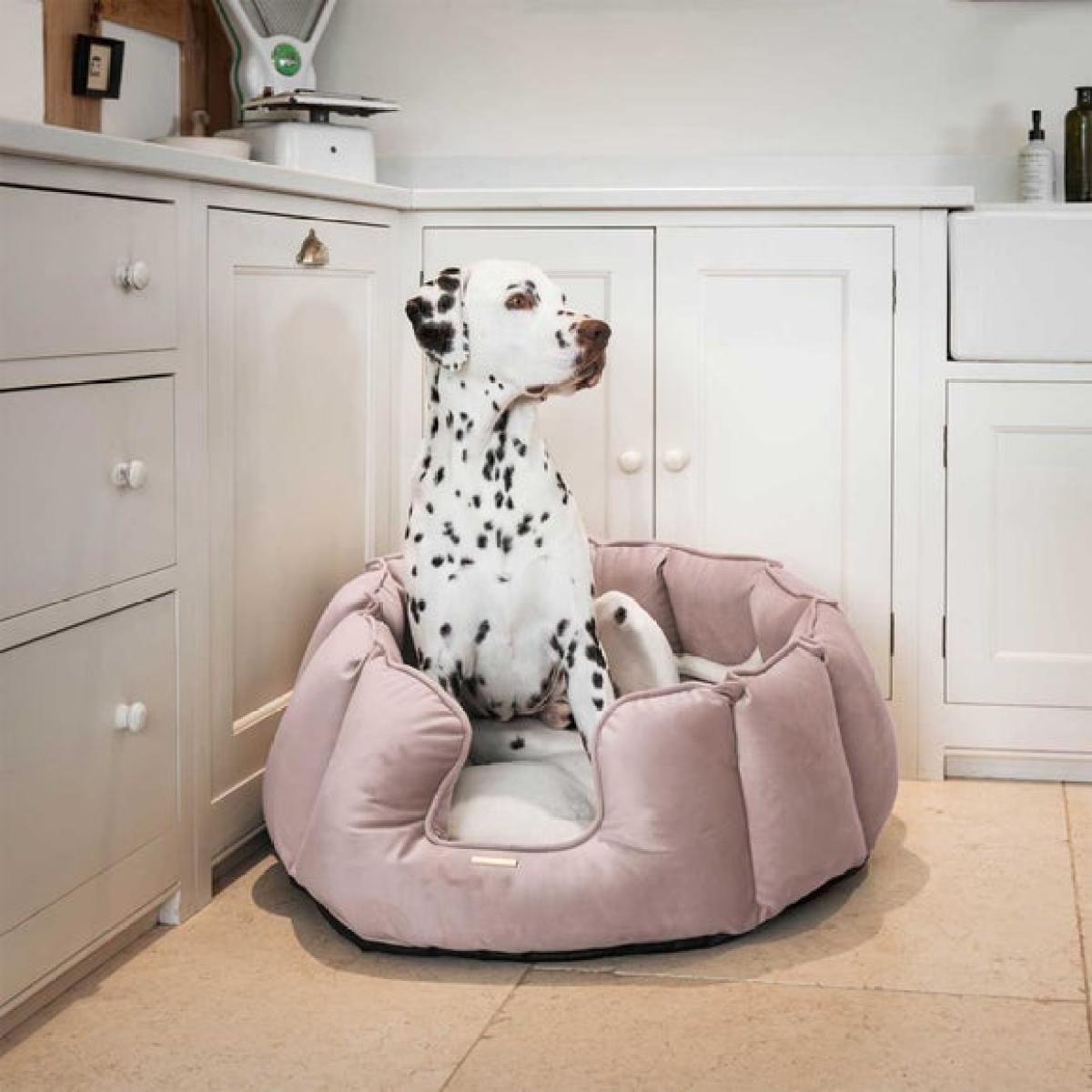 * Plush dog bed * Teddy fleece cover * Machine washable * Durable Crafted with sumptuous velvet and filled with 100% polyester, this dog bed provides a soft and supportive environment for your dog. The raised sides create a secure and cosy space, perfect for dogs who love to rest their head and curl up. Designed to withstand everyday use, the bed features a removable cover that is machine washable for easy maintenance. Available in three sizes—Small, Medium, and Large—and a variety of stunning colours, including Marine, Blossom, Clay, and Olive, it suits dogs of all breeds and sizes.