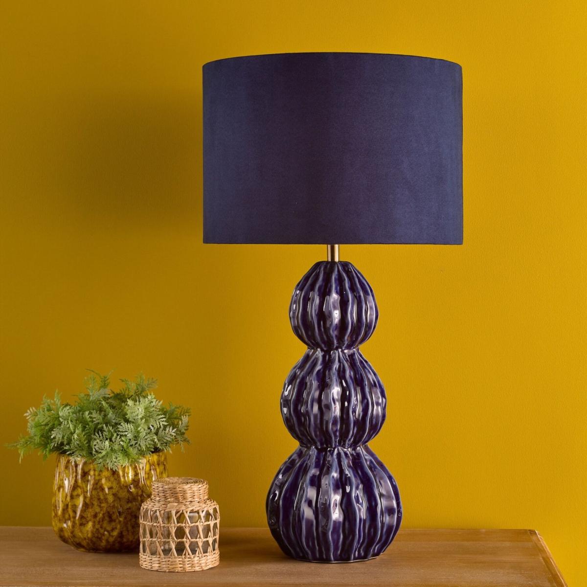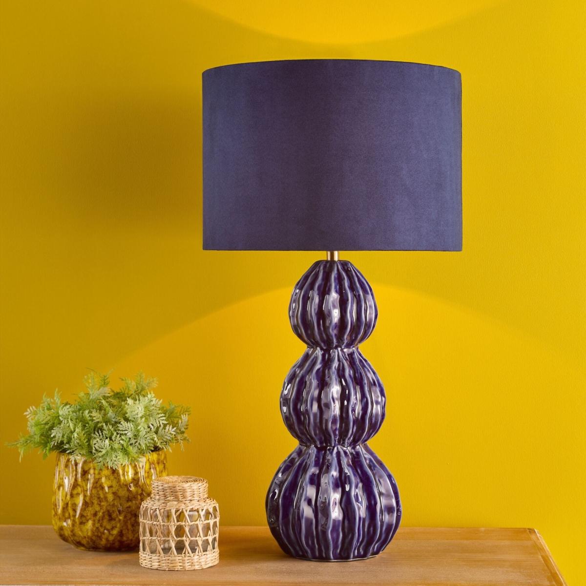Lorelai 1-light table lamp, featuring a ceramic base with a textured surface and a deep blue reactive glaze, topped with a matching blue velvet drum shade and cotton lining. The Lorelai table lamp is a striking fusion of texture, colour and elegance. Its ceramic base showcases a textured surface enhanced by a luxurious deep blue reactive glaze, which creates unique variations in tone and finish, ensuring each piece is truly one of a kind. The lamp is topped with a matching blue velvet drum shade that adds a soft, tactile element and is lined with cotton for a refined, polished look. Perfect for living rooms, bedrooms or hallways, the Lorelai table lamp delivers both functional light and decorative appeal. Its rich blue tones and intricate surface detail make it an eye-catching addition to modern and transitional interiors alike. Whether used as a standalone feature or paired with complementary decor, it brings an air of sophistication and artistic flair to any space. Lorelai 1-light table lamp, featuring a ceramic base with a textured surface and a deep blue reactive glaze, topped with a matching blue velvet drum shade and cotton lining. The Lorelai table lamp is a striking fusion of texture, colour and elegance. Its ceramic base showcases a textured surface enhanced by a luxurious deep blue reactive glaze, which creates unique variations in tone and finish, ensuring each piece is truly one of a kind. The lamp is topped with a matching blue velvet drum shade that adds a soft, tactile element and is lined with cotton for a refined, polished look. Perfect for living rooms, bedrooms or hallways, the Lorelai table lamp delivers both functional light and decorative appeal. Its rich blue tones and intricate surface detail make it an eye-catching addition to modern and transitional interiors alike. Whether used as a standalone feature or paired with complementary decor, it brings an air of sophistication and artistic flair to any space.