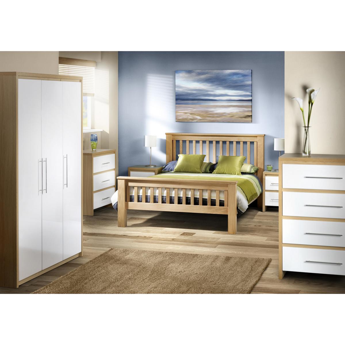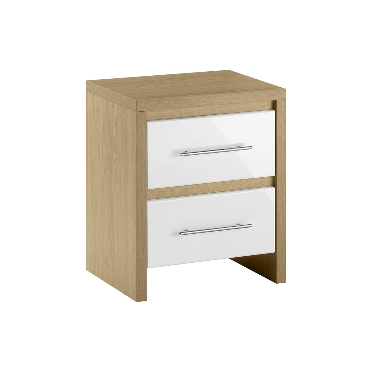 Simple, modern two-tone design. Neat and tidy with two high-gloss, white drawers. Solid wood frame with light oak finish. Long, slender stainless steel handles. Smooth metal drawer runners. Fashionable and functional