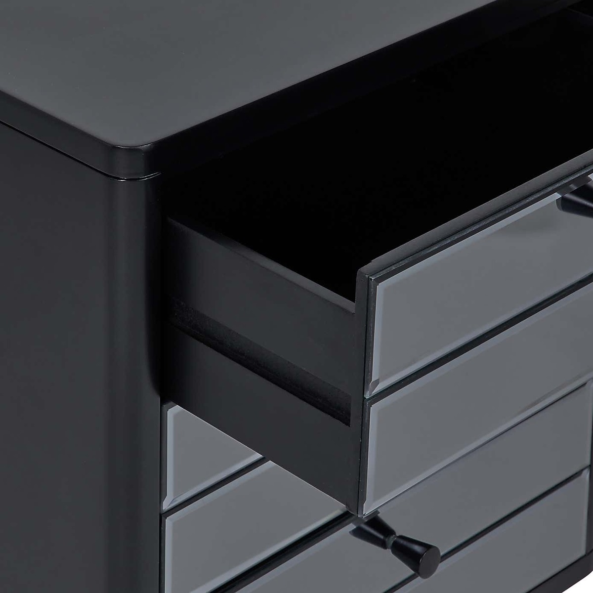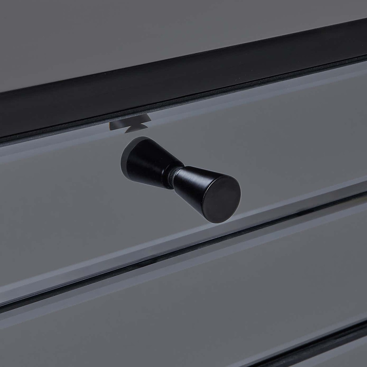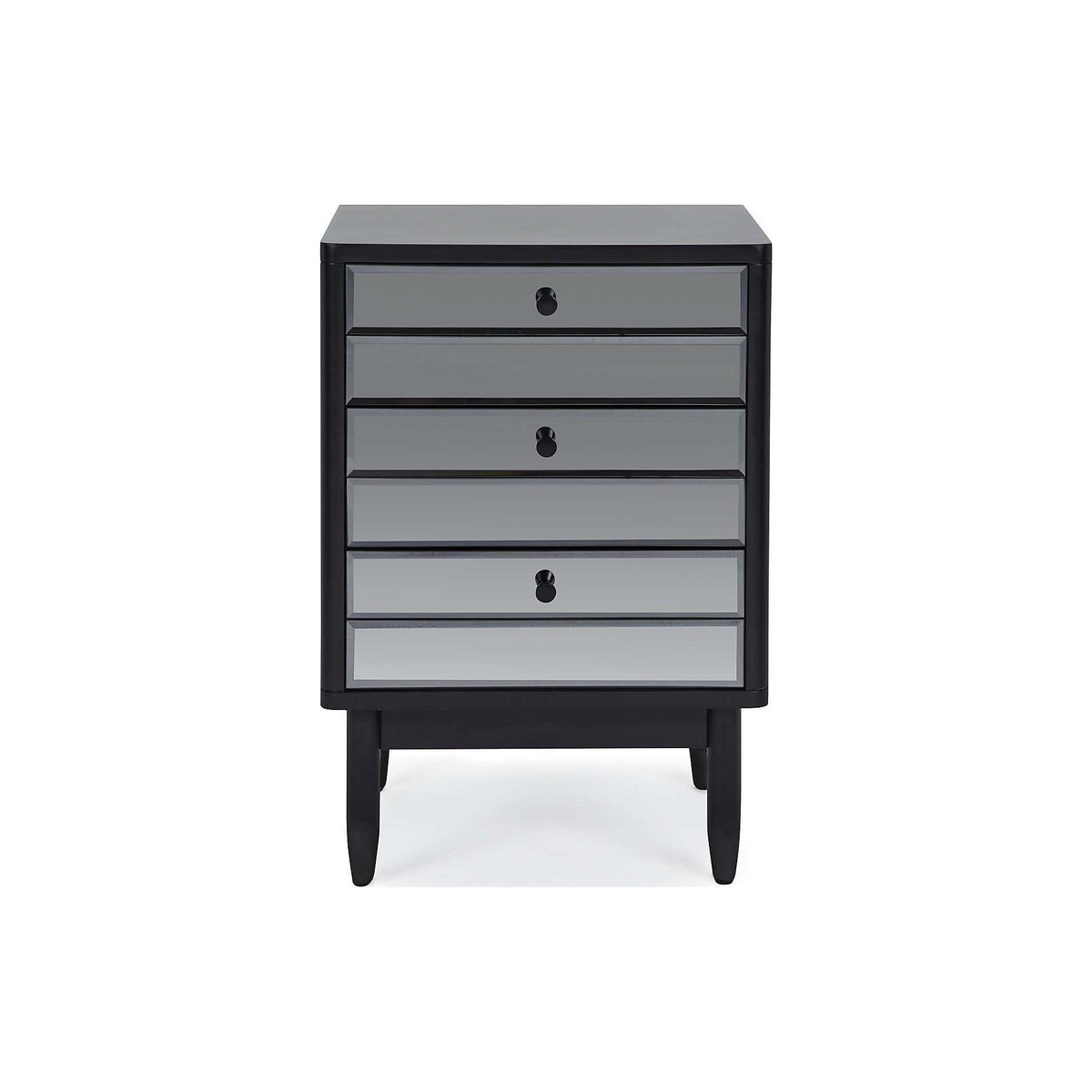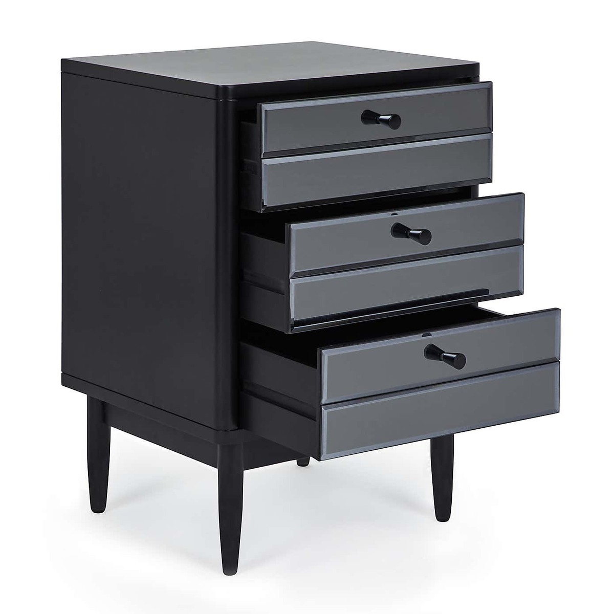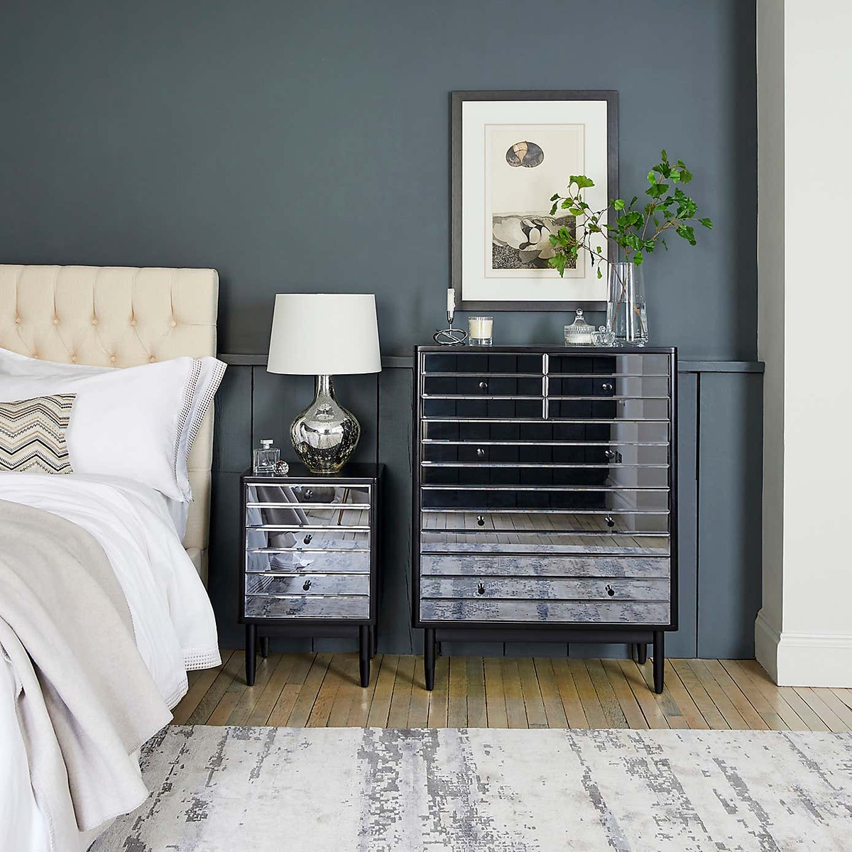 Dunelm Exclusive - Designed and Developed by Dunelm. With its stunning smoked mirrored glass fronts and black painted finish, the Loren range is the epitome of modern luxe styling. This range also features slender legs and black metal handles, perfect for adding an elegant look to any space. Complete with three spacious drawers, the Loren bedside table offers plenty of storage space, and would make a glamorous addition to any bedroom. Care Instructions: Avoid prolonged exposure to direct sunlight. Wipe up spills immediately with a damp cloth, avoid common hazards such as harsh solvents or abrasives. To clean this item, please use a soft cloth slightly dampened with water and wipe clean, then buff with a dry clean cloth. If the glass is chipped or broken, stop using the product. Please use the wall attachments provided to prevent furniture from overturning.
