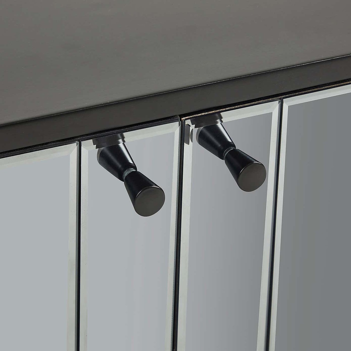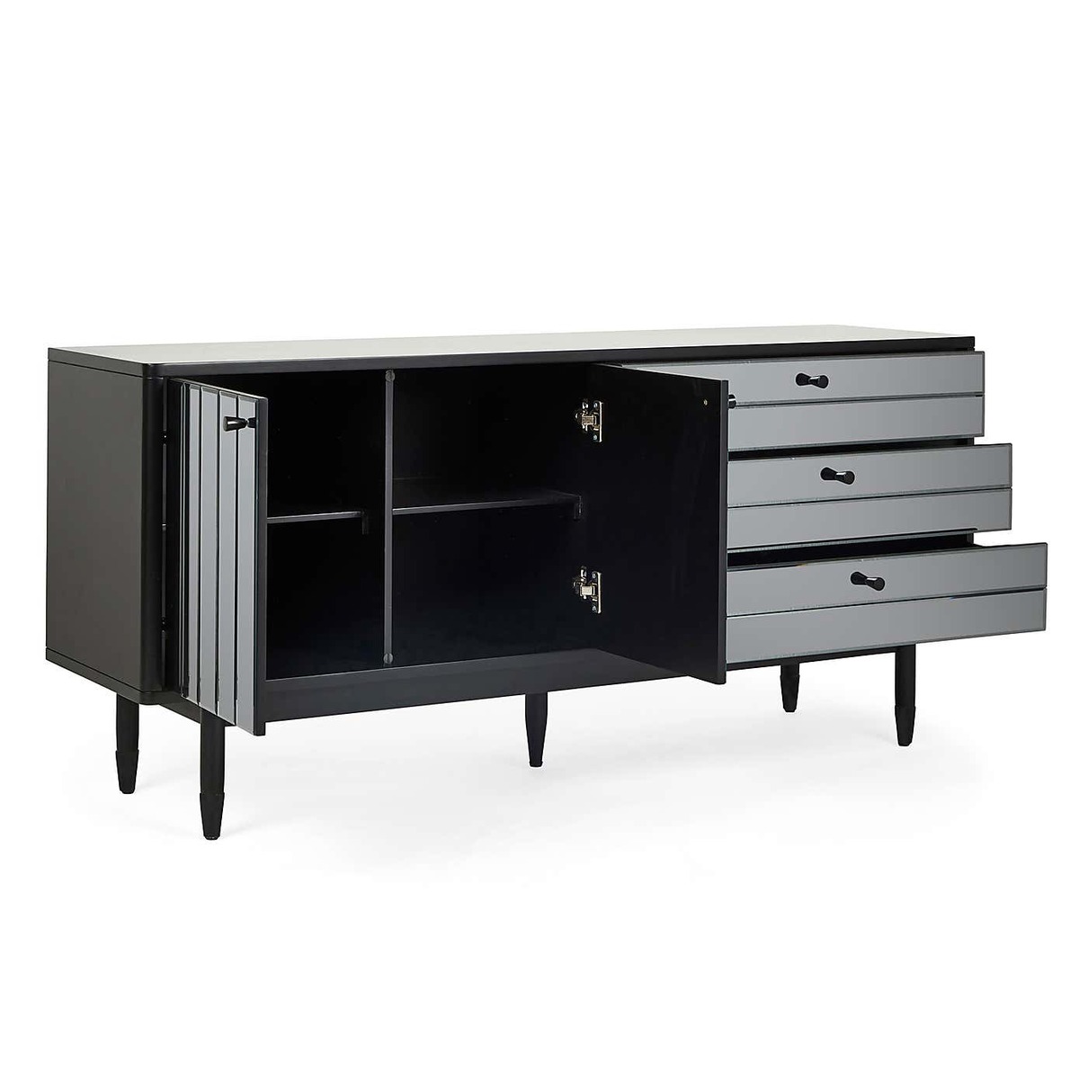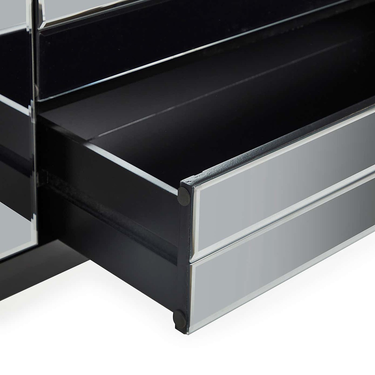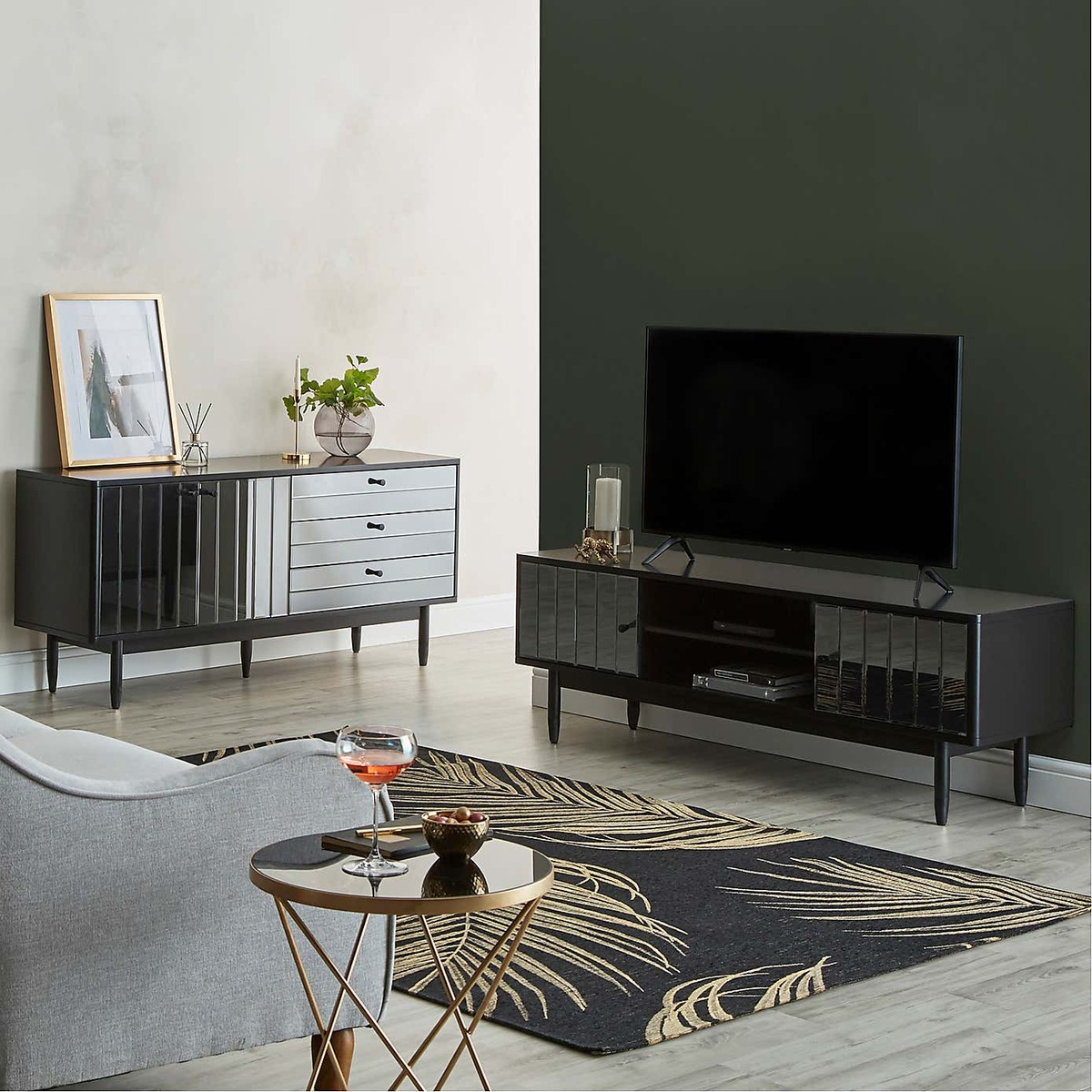 Dunelm Exclusive - Designed and Developed by Dunelm. With its stunning smoked mirrored glass fronts and black painted finish, the Loren range is the epitome of modern luxe styling. This range also features slender legs and black metal handles, perfect for adding an elegant look to any space. The Loren large sideboard features three spacious drawers and a large two-door cupboard, complete with soft close hinges, two fixed shelves and a black painted interior for a modern look. Care Instructions: Avoid prolonged exposure to direct sunlight. Wipe up spills immediately with a damp cloth, avoid common hazards such as harsh solvents or abrasives. To clean this item, please use a soft cloth slightly dampened with water and wipe clean, then buff with a dry clean cloth. If the glass is chipped or broken, stop using the product. Please use the wall attachments provided to prevent furniture from overturning.
