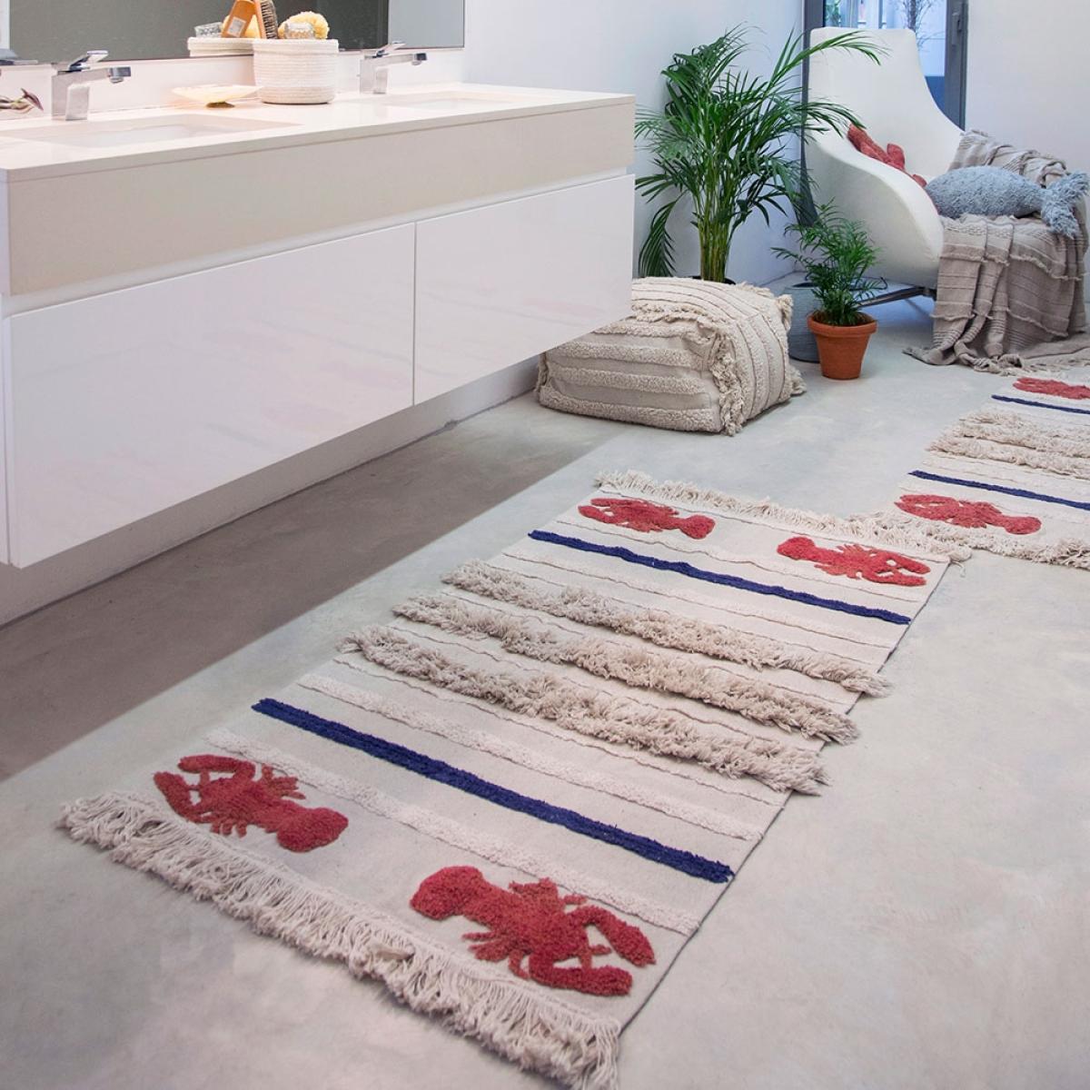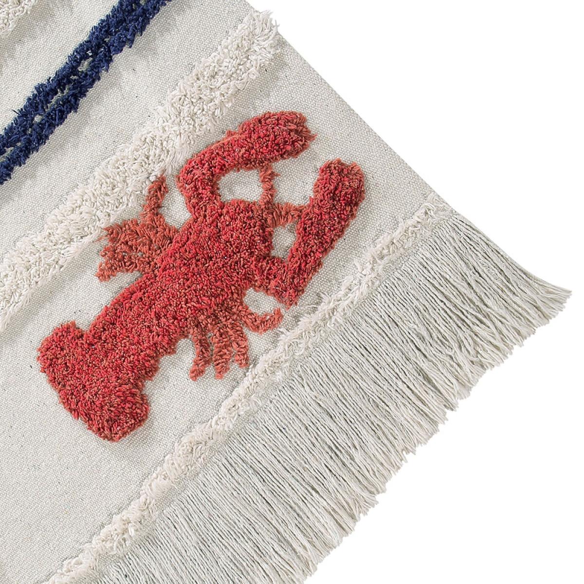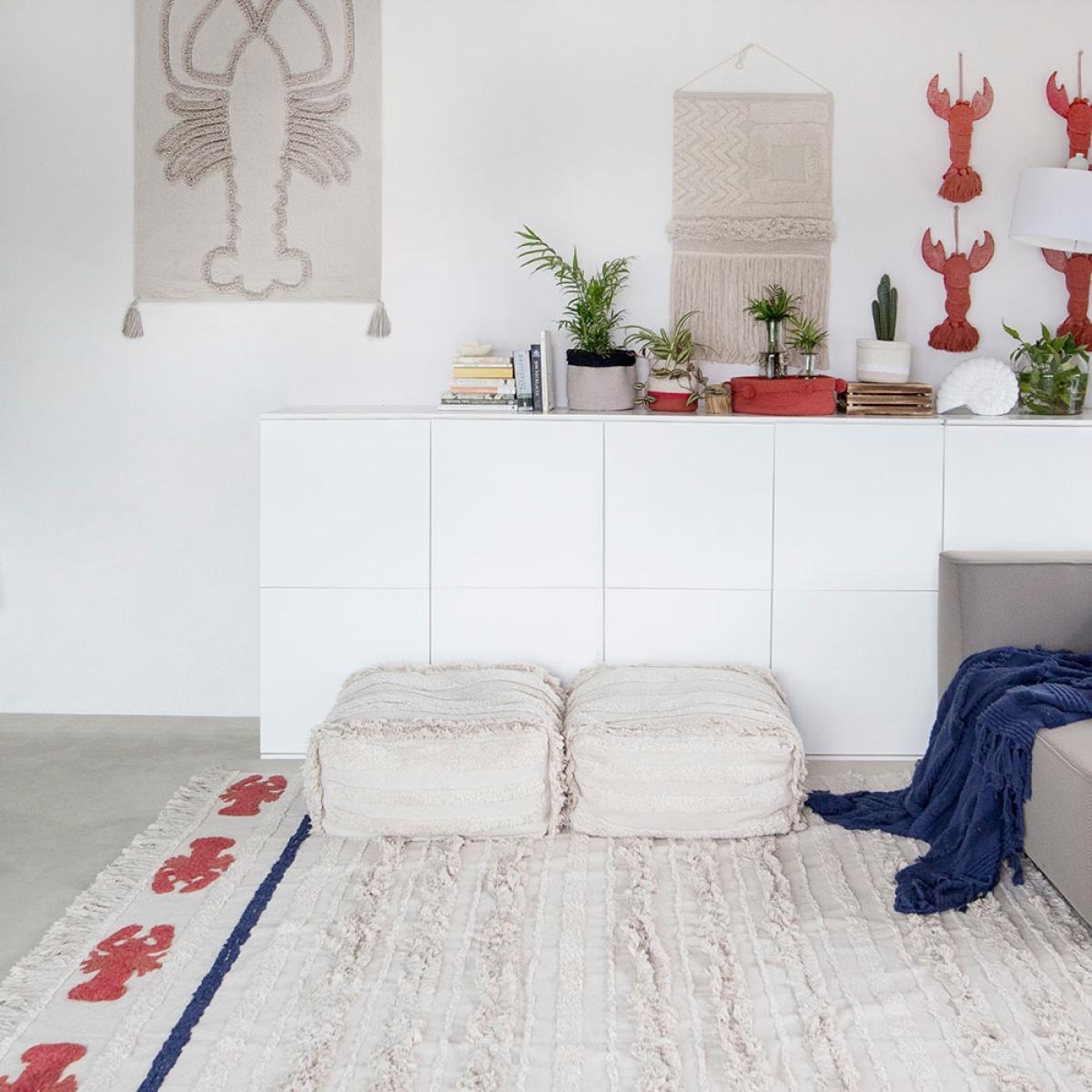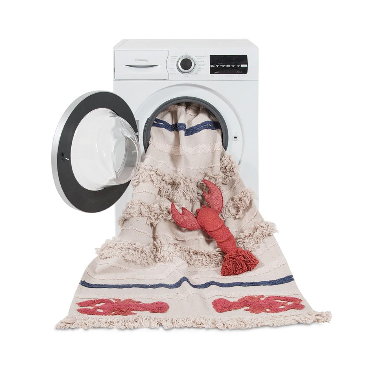 Part of the marine collection, the Lorena Canals Washable Mini Lobster Rug will add a touch of whimsy to your home. Perfect for ocean themes or to add a little colour to the kids bedrooms, you'll love sinking your toes into the sand coloured cotton rug and pretending you're at the seaside! Finished with red and blue stripes and fringing, this unique design will standout wherever you decide to pop it. Available in 2 sizes and machine washable, it would be a practical addition to your home! Handmade in India by skilled craftspeople using traditional and environmentally friendly processes, the entire range of rugs by this fabulous Spanish brand is simply brilliant!.