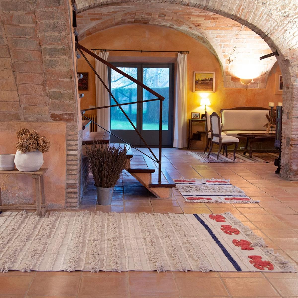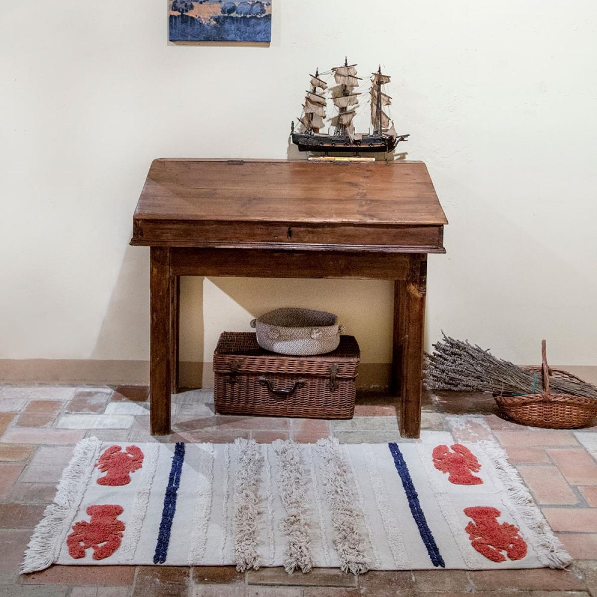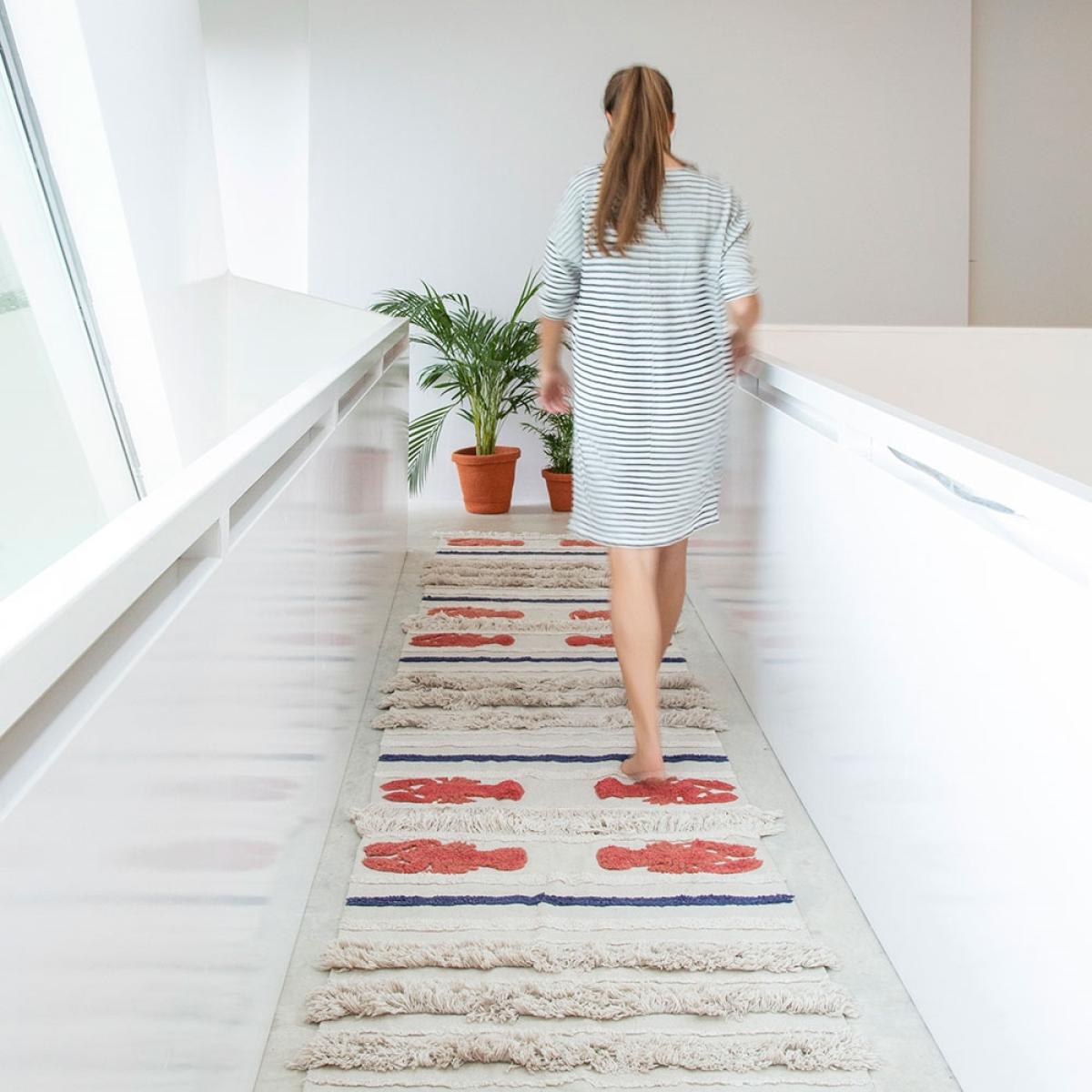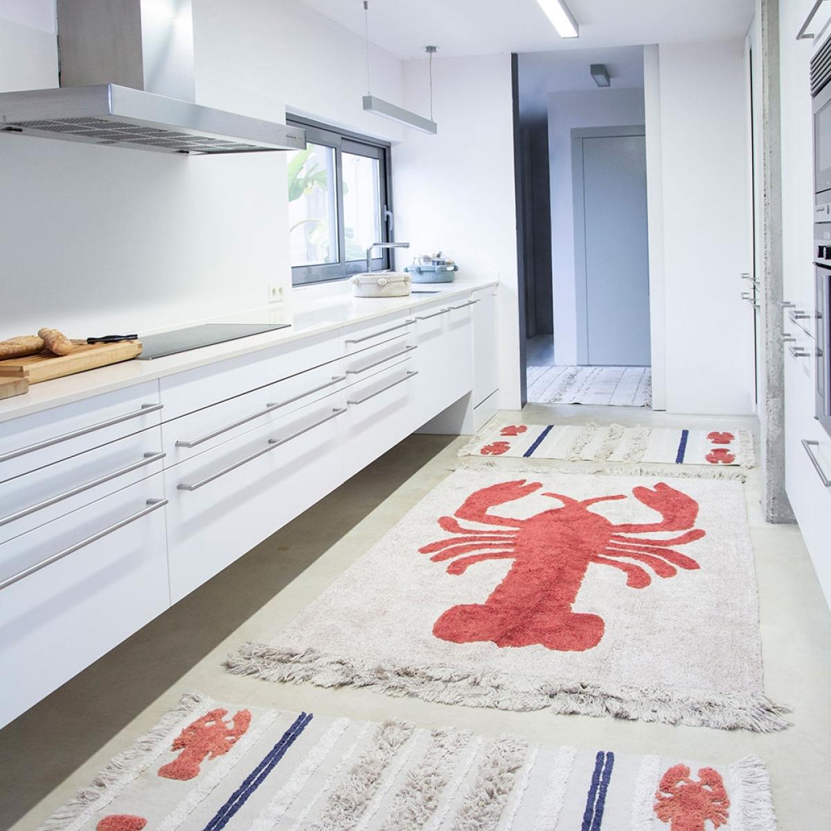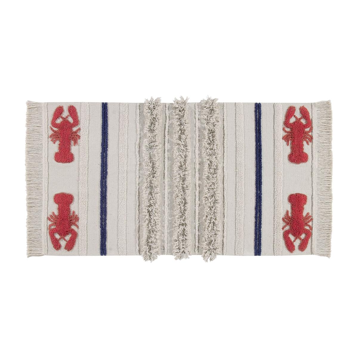 Part of the marine collection, the Lorena Canals Washable Mini Lobster Rug will add a touch of whimsy to your home. Perfect for ocean themes or to add a little colour to the kids bedrooms, you'll love sinking your toes into the sand coloured cotton rug and pretending you're at the seaside! Finished with red and blue stripes and fringing, this unique design will standout wherever you decide to pop it. Available in 2 sizes and machine washable, it would be a practical addition to your home! Handmade in India by skilled craftspeople using traditional and environmentally friendly processes, the entire range of rugs by this fabulous Spanish brand is simply brilliant!.