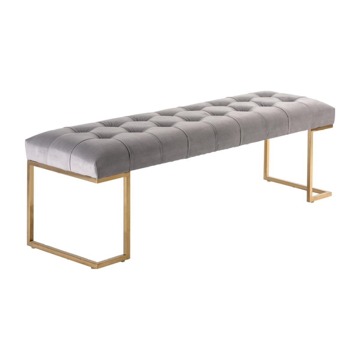 An elegantly proportioned bench inspired by highly collectable 1970’s American bespoke furniture. Steel legs with polished brass finish. Velvet upholstery fabric. Comfortable deep buttoned seat. Ideal for use in bedrooms, dining rooms or for adding interest to hallways. Assembly required, simply attach the legs.