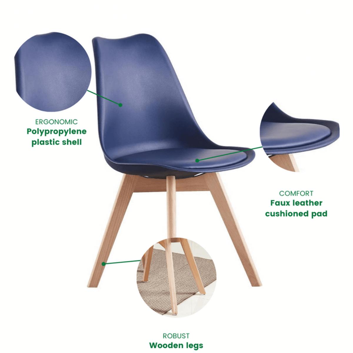 Adorn your home with stylish and functional dining chairs. This dining chair is the true epitome of Scandinavian living. Features a robust ergonomically-molded polypropylene curved shell to provide support to your back or spine, Padded faux leather seat for a comfortable sitting experience. Supported by solid wood legs, complemented by a smooth waterfall edge and foot pads to protect your floors from scratches. Superior manufacturing provides durability that will withstand the test of time. Enhance your living space with a versatile office chair that will provide you with the comfort you desire. Crafted with attention to detail and utmost perfection materials complimented by the overall stylish aesthetic - there really is no compromise on comfort or design.