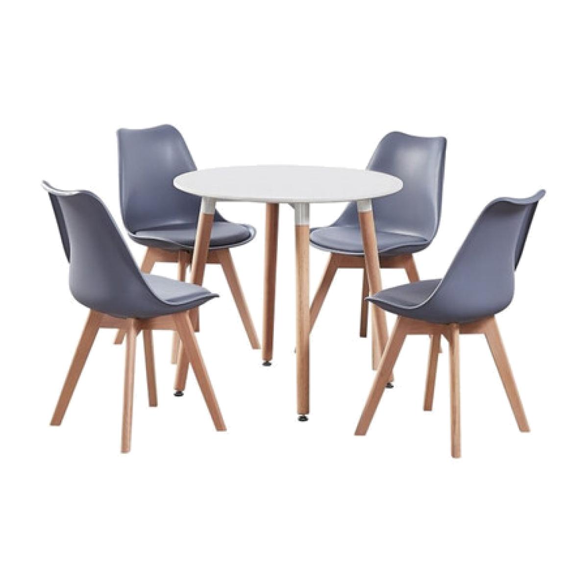 We are offering the round Lorenzo Dining Set that includes the round Table, which delivers superior comfort and durability and makes it perfect for everyday use. Solid wooden legs ensure that the table is sustainable and long-lasting. Its luxury yet simple design will elevate your dining space to a new level. A perfect table for everyday family mealtimes, as well as an excellent table for grownup dinner gatherings. Also, the dinette table offers a brilliant surface solution for placing drinks, food, and snacks with its perfect size making it even easier to place anywhere you wish without cluttering your room. Combined with stylish and functional Lorenzo dining chairs. Features a robust ergonomically-moulded polypropylene curved shell to provide support to your back or spine, Padded faux leather seat for a comfortable sitting experience. Supported by solid wood legs, complemented by a smooth waterfall edge and foot pads to protect your floors from scratches. Superior manufacturing provides durability that will withstand the test of time.