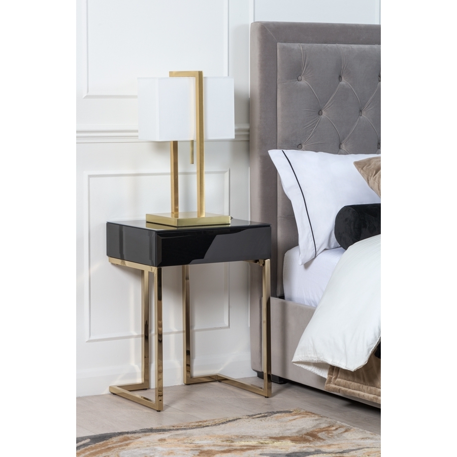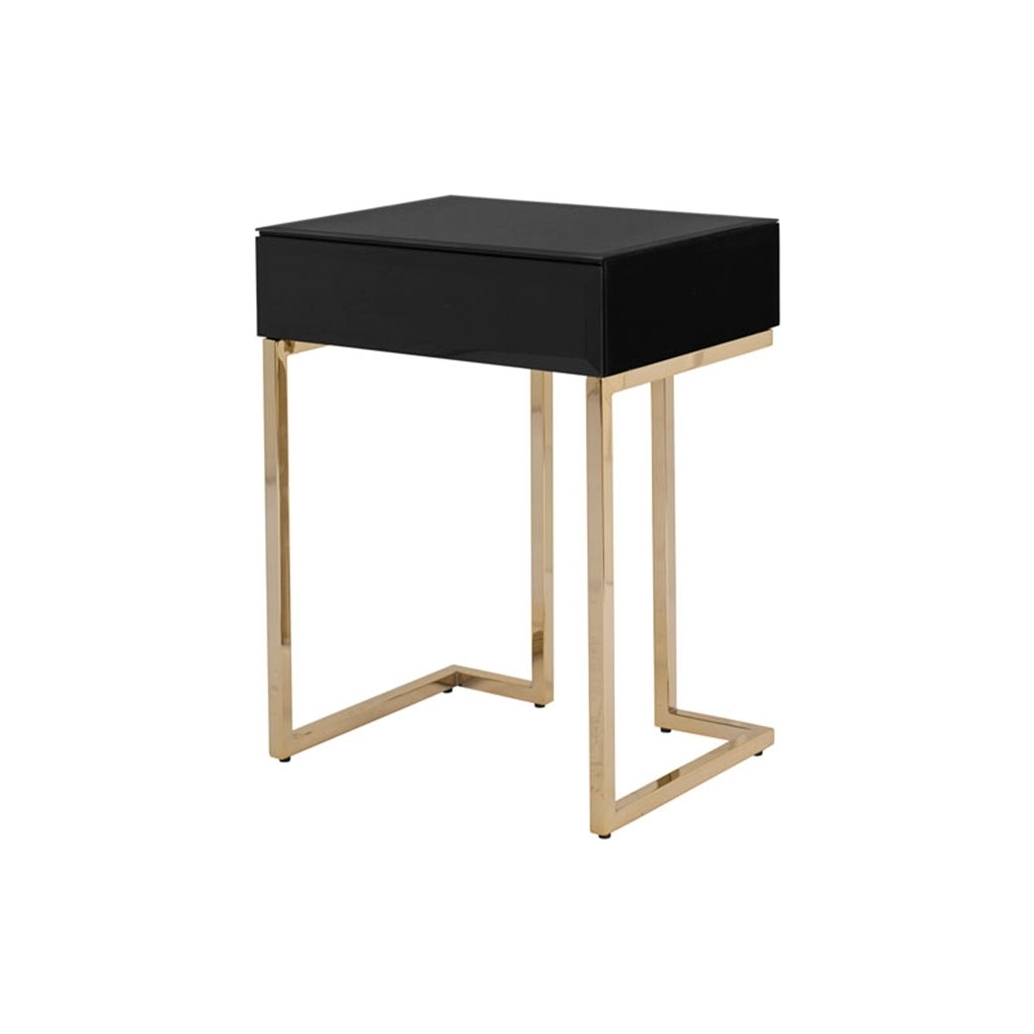 An elegantly proportioned bedside table inspired by highly collectable 1970’s American bespoke furniture. Toughened black glass top with bevelled edges and concealed drawer. Toughened black glass finish to back, making this suitable for use as a living room side table. Steel legs with polished brass finish. Assembly required, simply attach the legs.