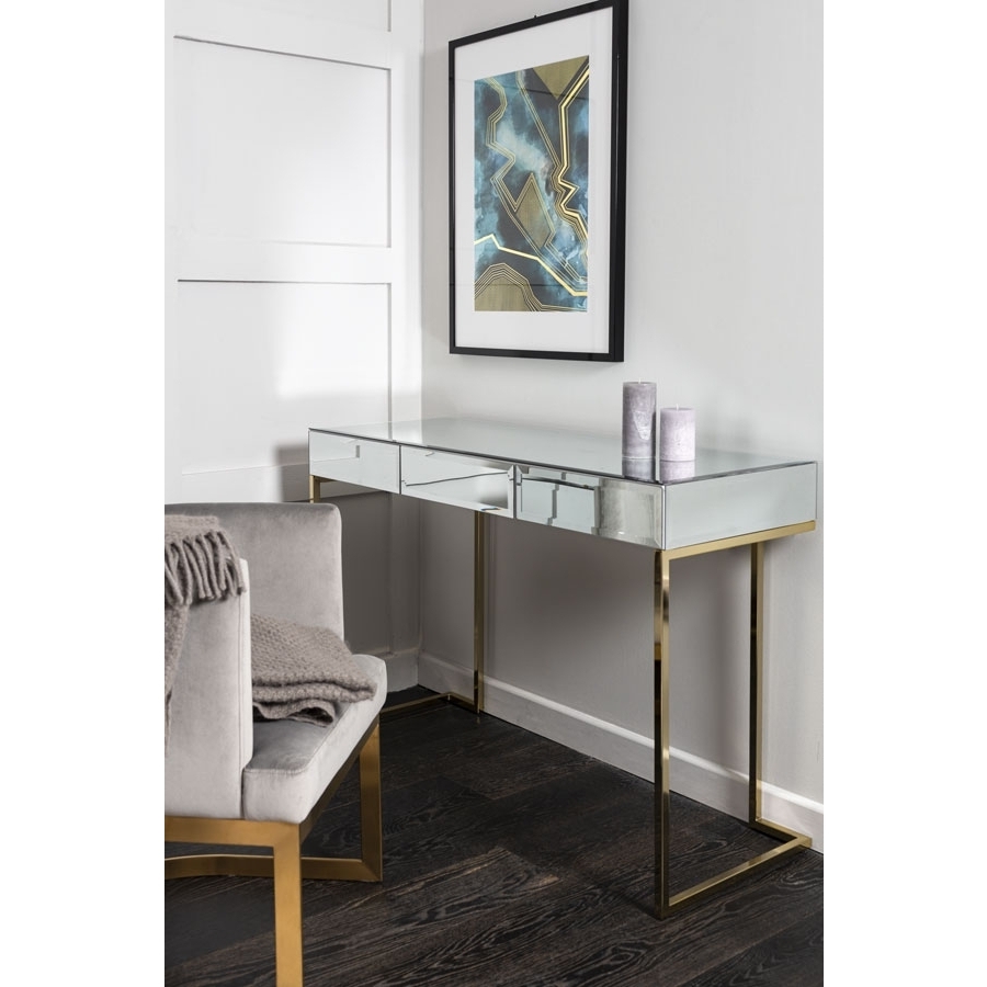 An elegantly proportioned console table inspired by highly collectable 1970’s American bespoke furniture. Toughened mirror top with bevelled edges and three concealed drawers. Mirror finish to back. Steel legs with polished brass finish. Assembly required, simply attach the legs.