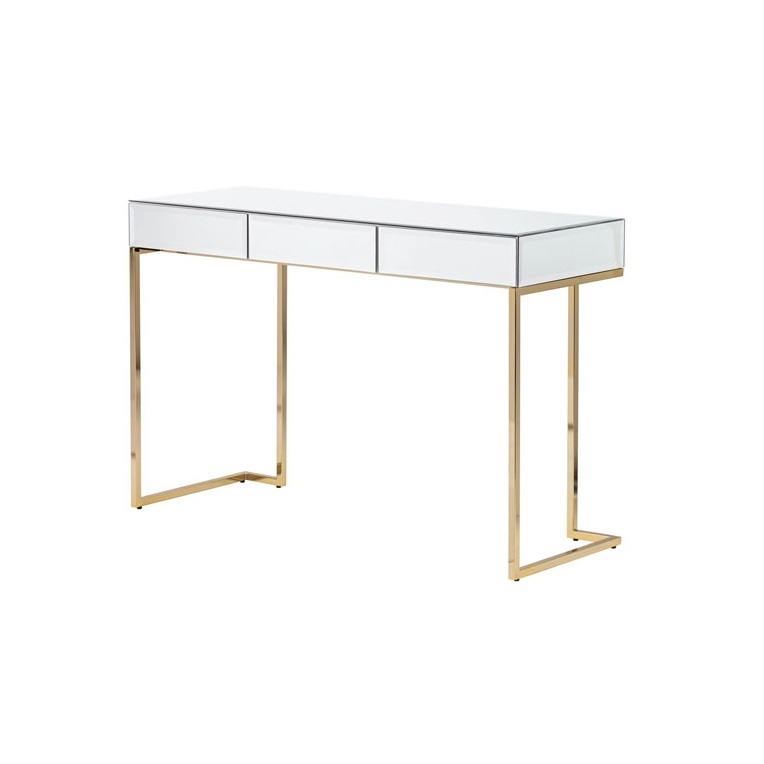 I often reach for this mirror console when I need a quick way to lift a hallway or living room - its reflective top and slim gold legs bring in light and a hint of glamour without overwhelming the space. It works equally well in a pared-back modern interior, as an Art Deco-inspired statement in your hallway or even as a compact dressing table in a bedroom. For styling, keep the look clean with a small sculptural lamp, a low vase of fresh blooms and a neat tray for keys or jewellery. The three shallow drawers hide everyday clutter, while the glass surface means you’ll want to use coasters or decorative mats. Pair it with muted walls and a statement mirror above for instant polish.