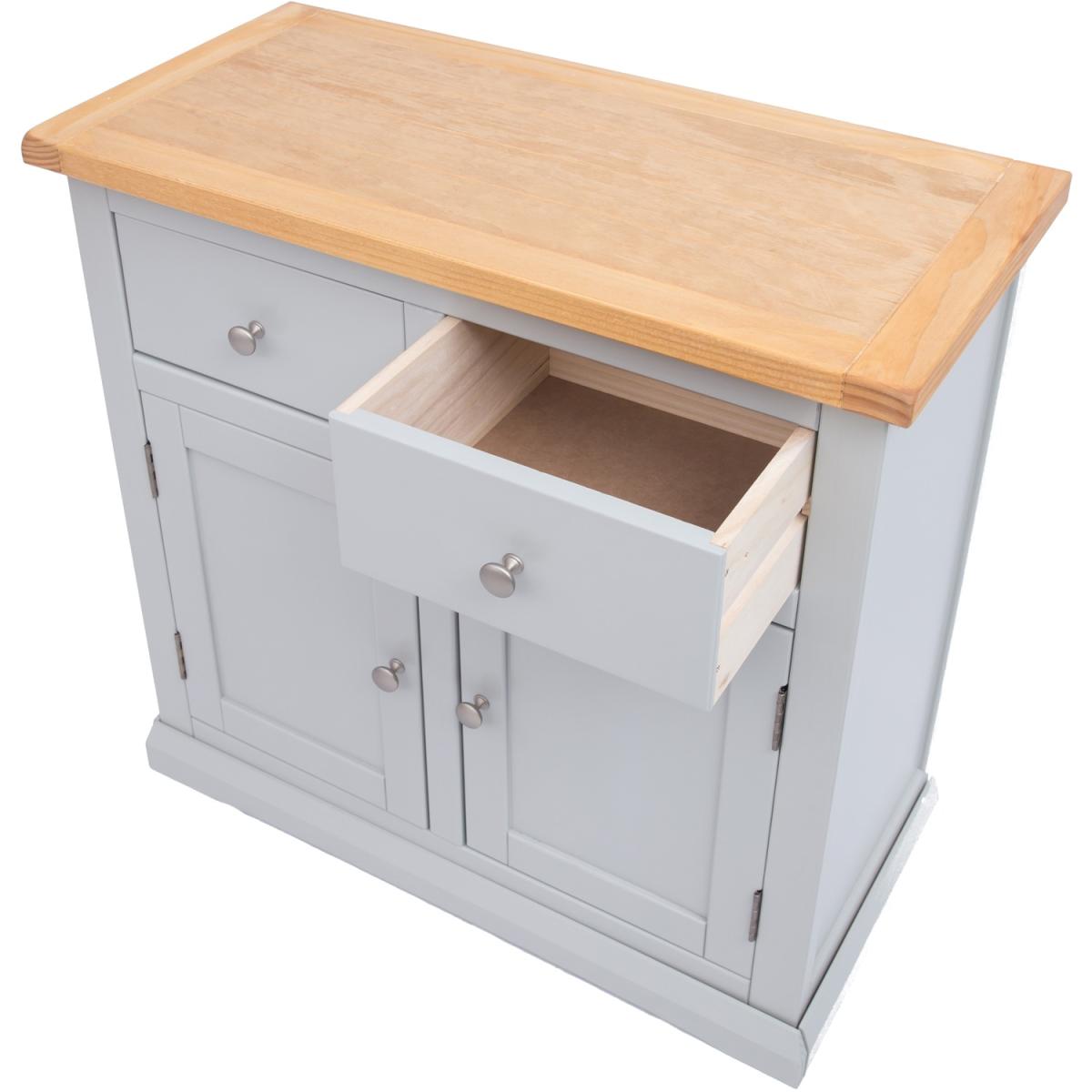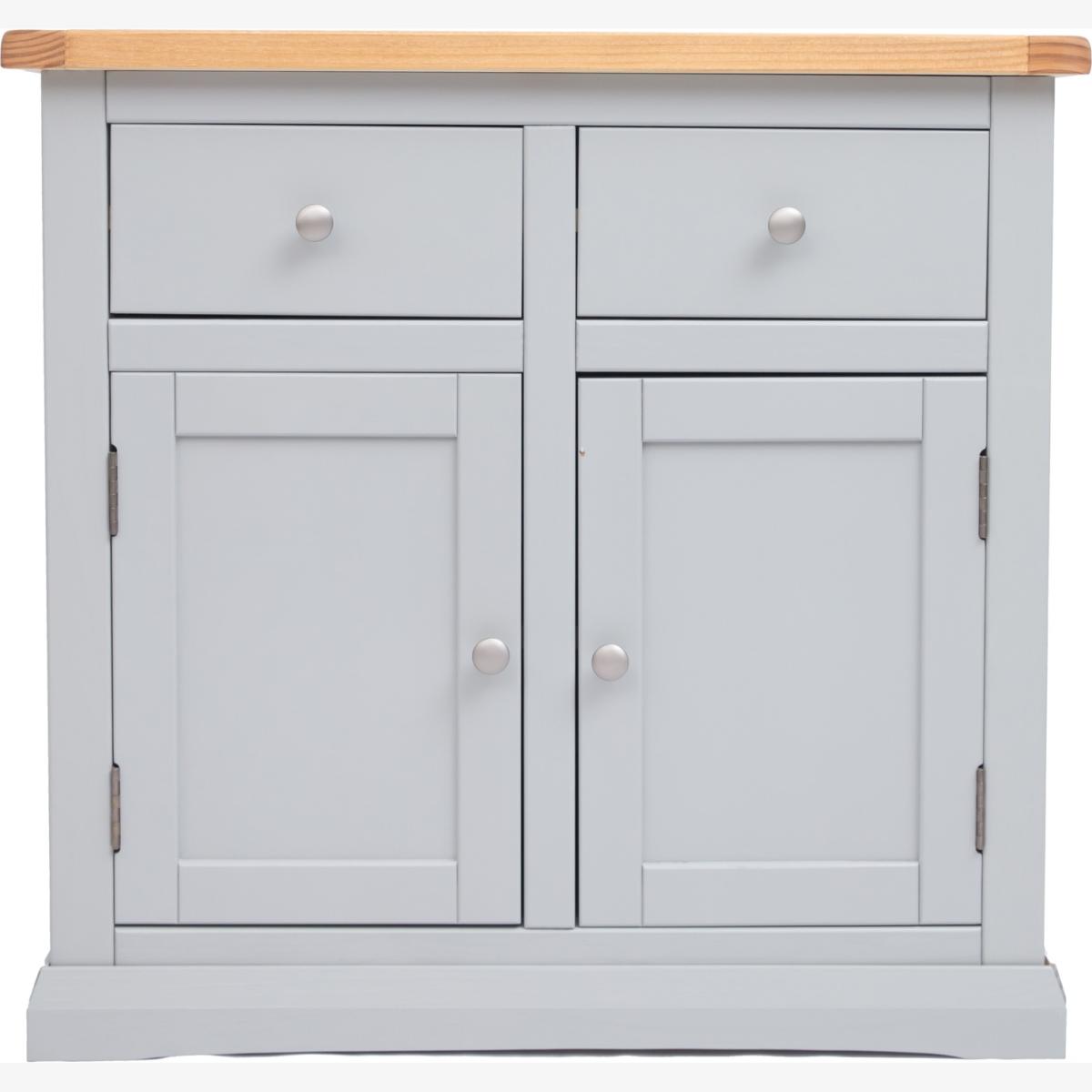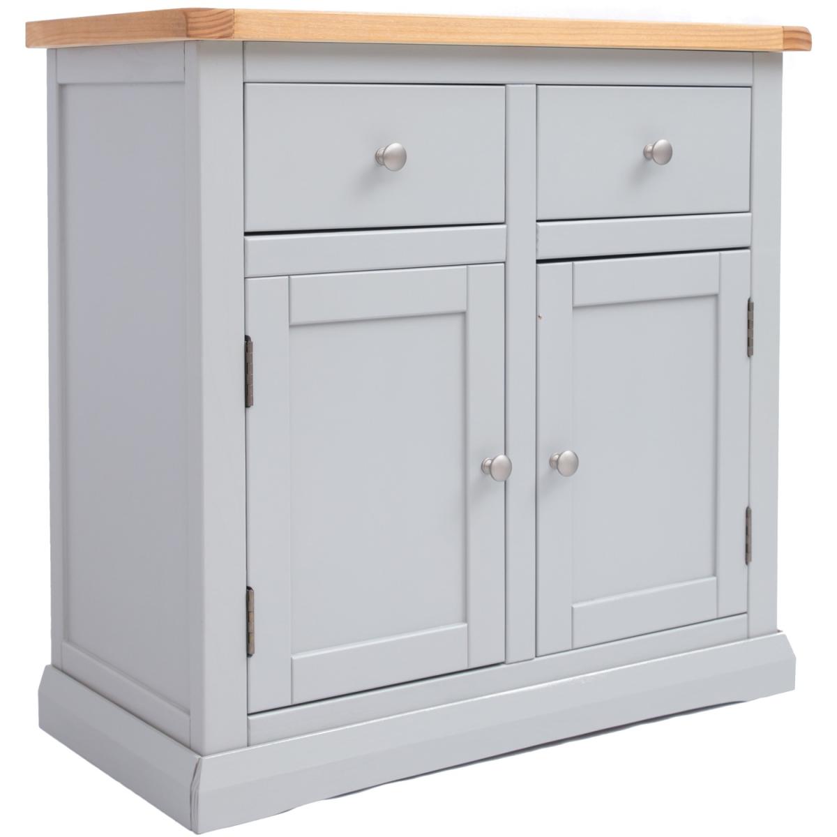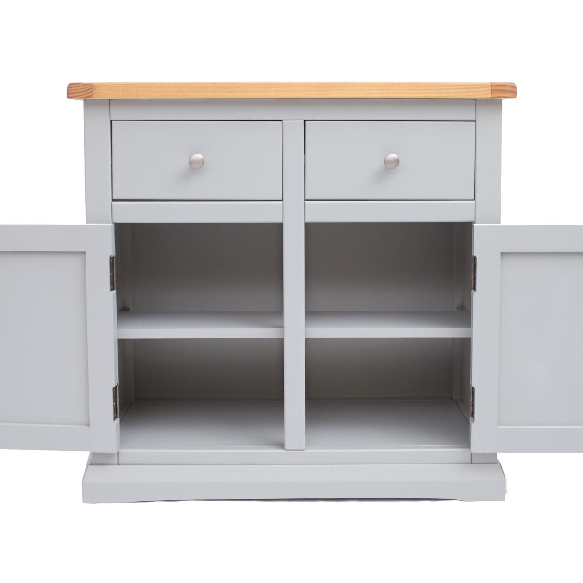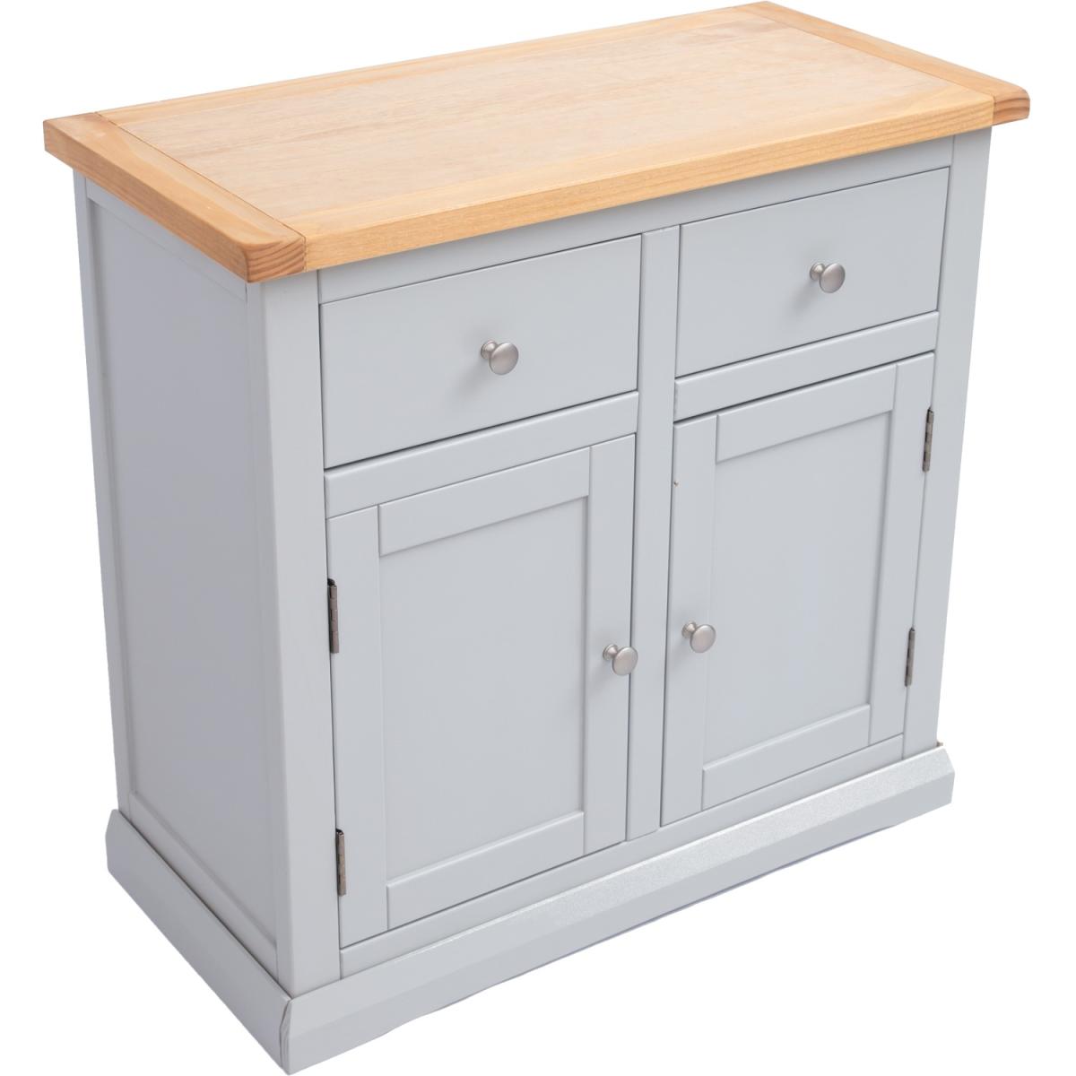 Our Loreo collection has a simple but pleasing design and is produced by our skilled craftsmen to the highest standards using responsibly sourced wood and veneers. All tops are made using a combination of solid pine wood and veneers and are carefully hand waxed giving it a great look. The body is finished with a high quality eco-friendly water base paint in an light grey colour. A compact 2 door 2 drawer sideboard ideal for your kitchen, dining room or lounge. The two doors conceal a large cupboard space for storing crockery, bottles or glassware and there is a shelf to help you organise your contents too. Above this there are two drawers for cutlery, napkins, place mats or maybe even keeping essential paperwork to hand. The two drawers below are deeper and ideal for storing underwear or accessories. These attributes combined with a simple construction for easy assembly makes it a great value product to be taken home today.